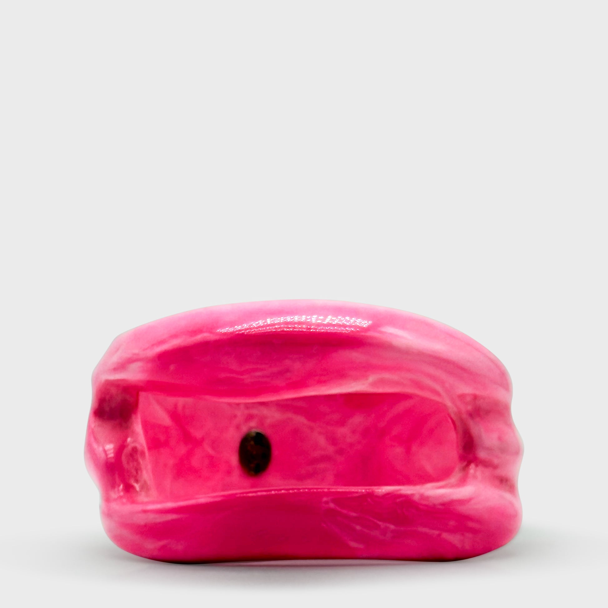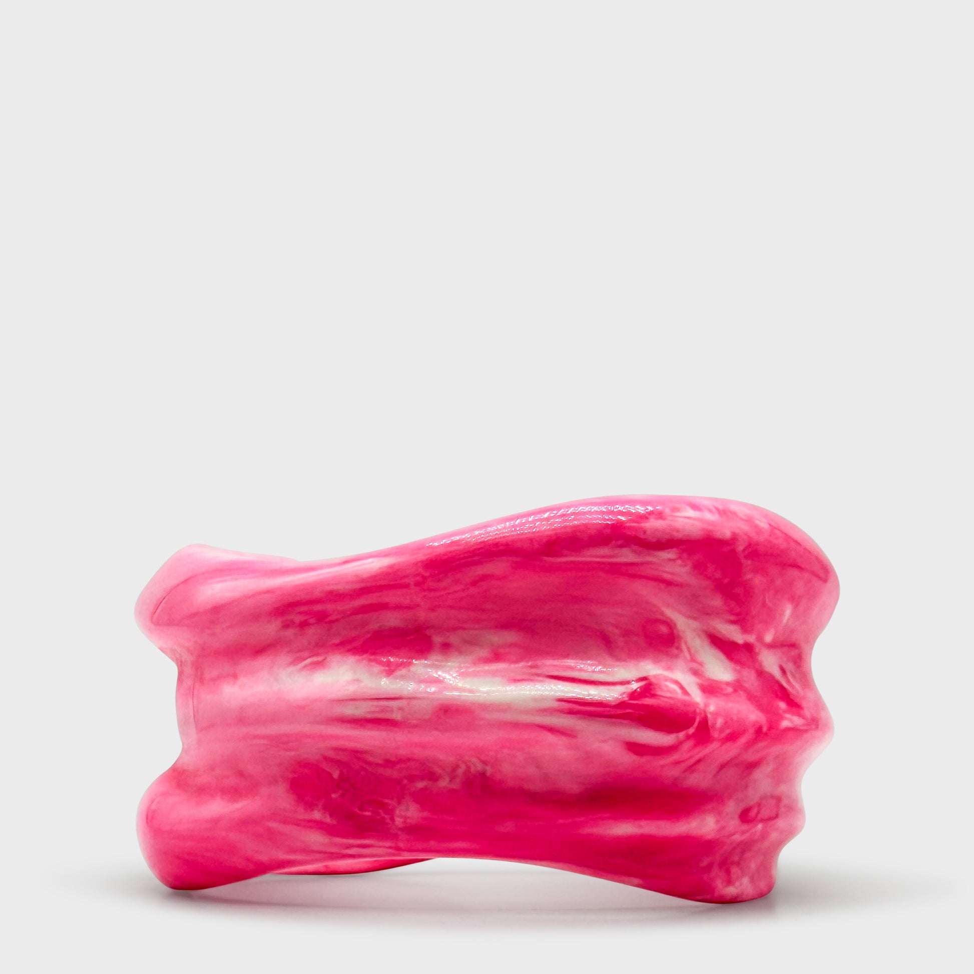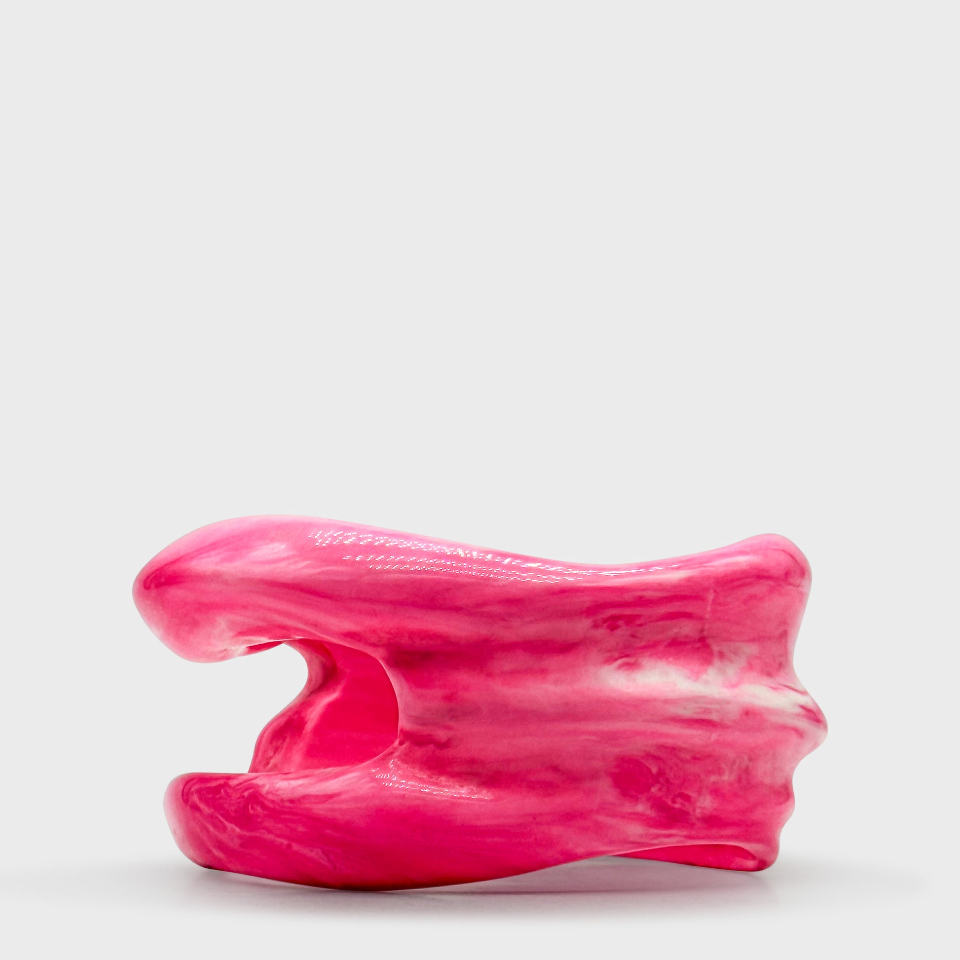 Bracelet manchette ajouré en bakélite rose marbrée, aux volumes organiques et sensuels. La matière, emblématique des bijoux couture des années 80–90, est ici sculptée dans une forme fluide et architecturale, presque anatomique. La transparence laiteuse mêlée de rose fuchsia crée un effet hypnotique, très Lacroix : baroque, audacieux, assumé.