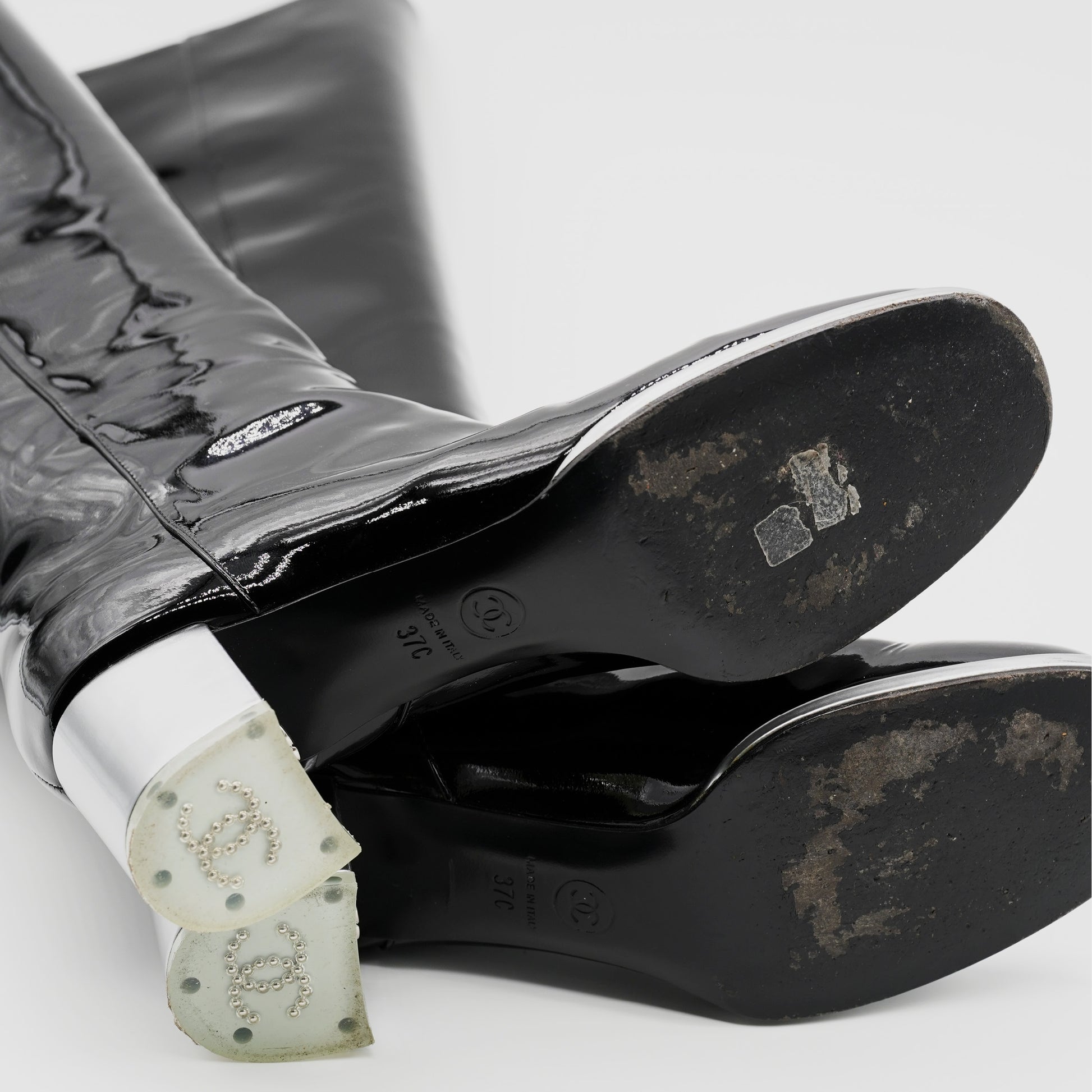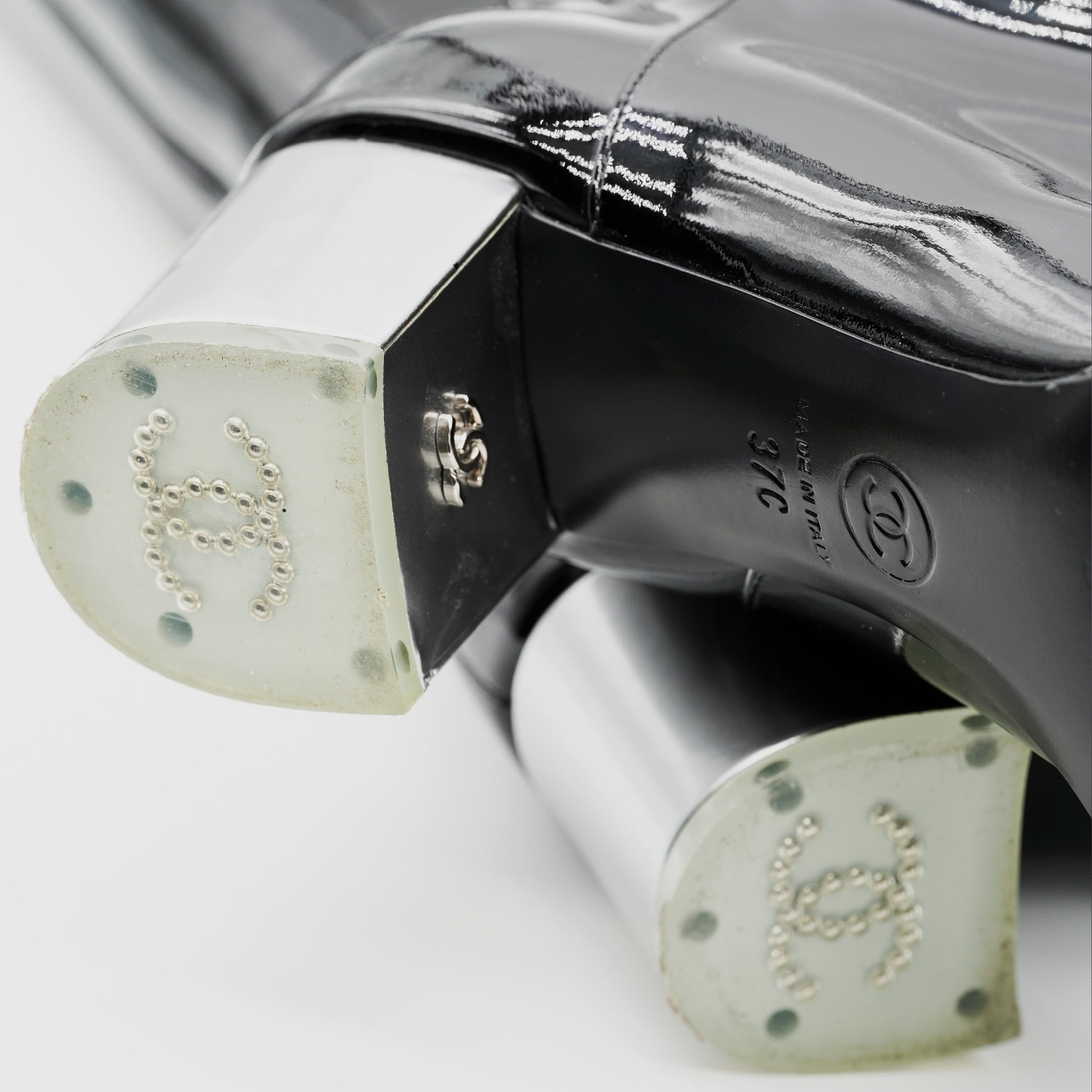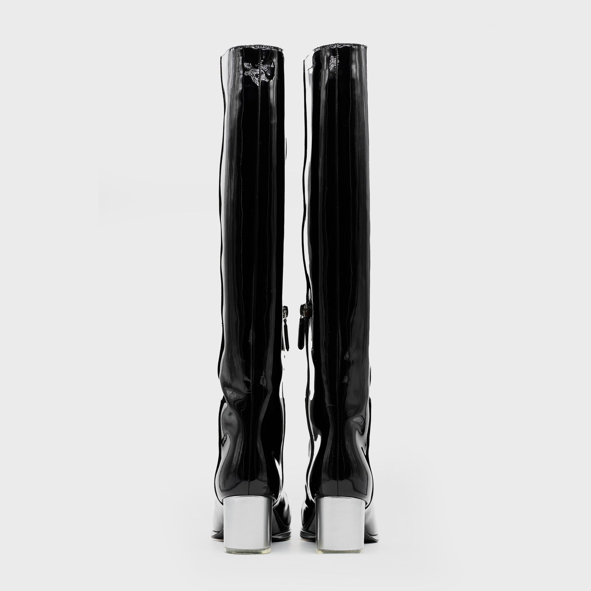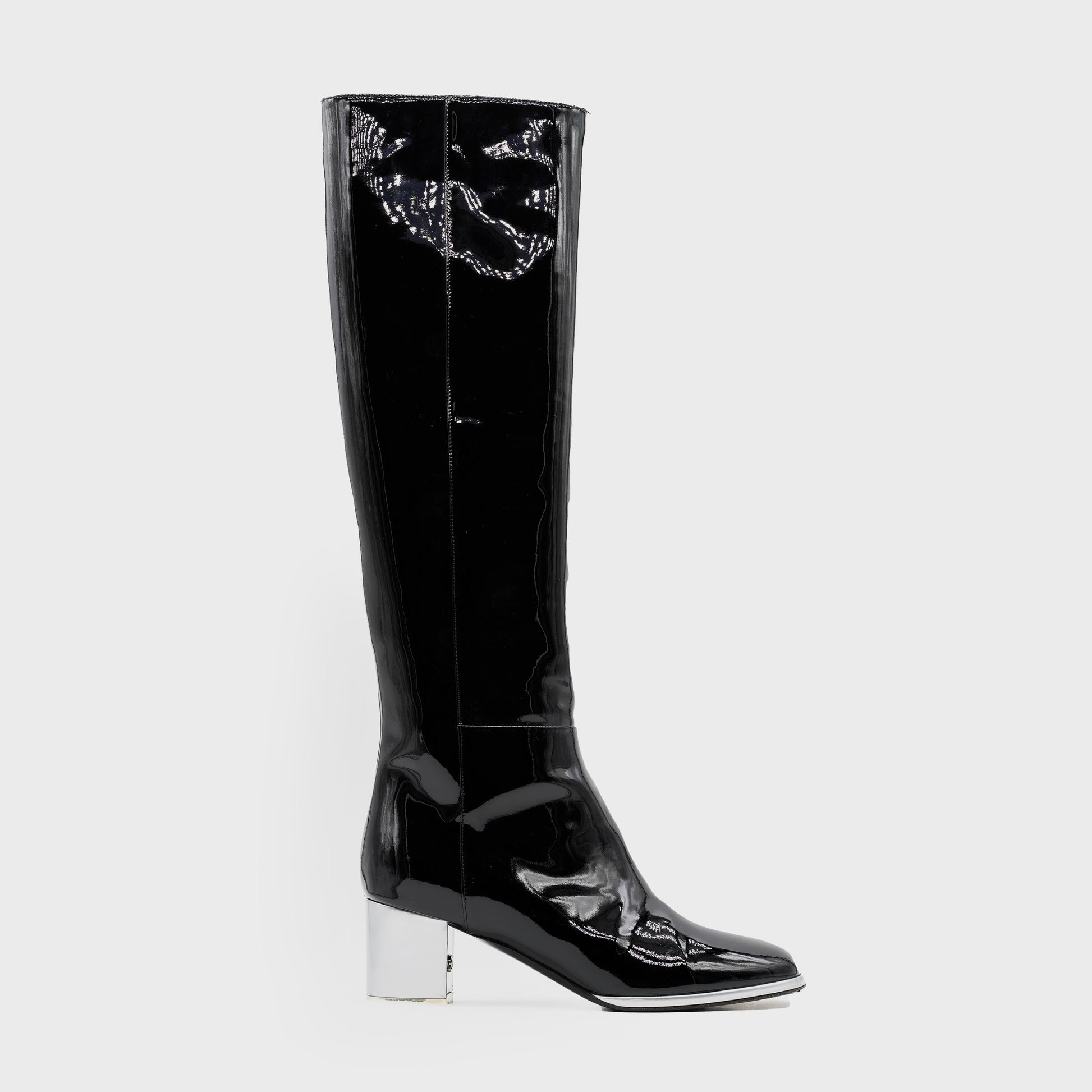 Black patent leather high boots, enhanced by cubic heels covered in silver metallic glazed leather. Side zip fastening for a perfect fit. The sole is branded with the iconic double C.
