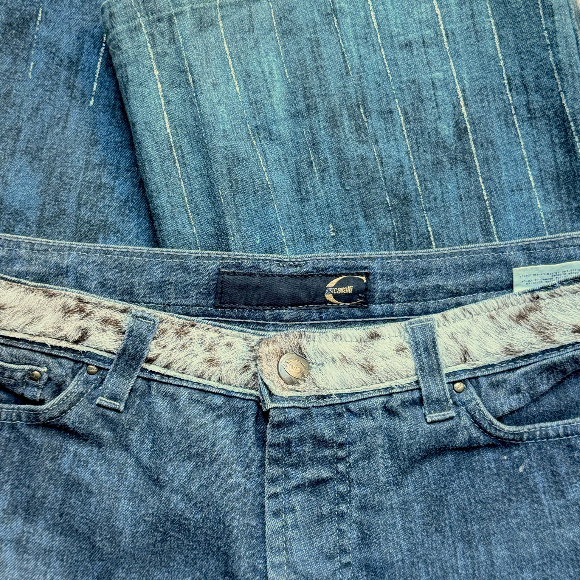 Jean taille basse en denim légèrement délavé, coupe flare aux ourlets usés. Détail signature : ceinture intégrée en cuir façon poulain, contraste animal chic typique Cavalli. Cinq poches, bouton gravé, allure Y2K sensuelle et rock.
