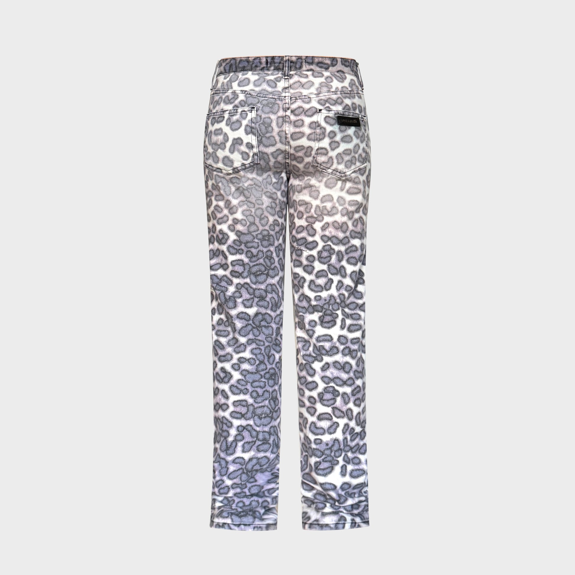 Jean slim taille basse en denim stretch à imprimé léopard gris et blanc. Coupe droite ajustée, cinq poches, bouton siglé. Un classique Cavalli période Y2K : animal, sexy, assumé.