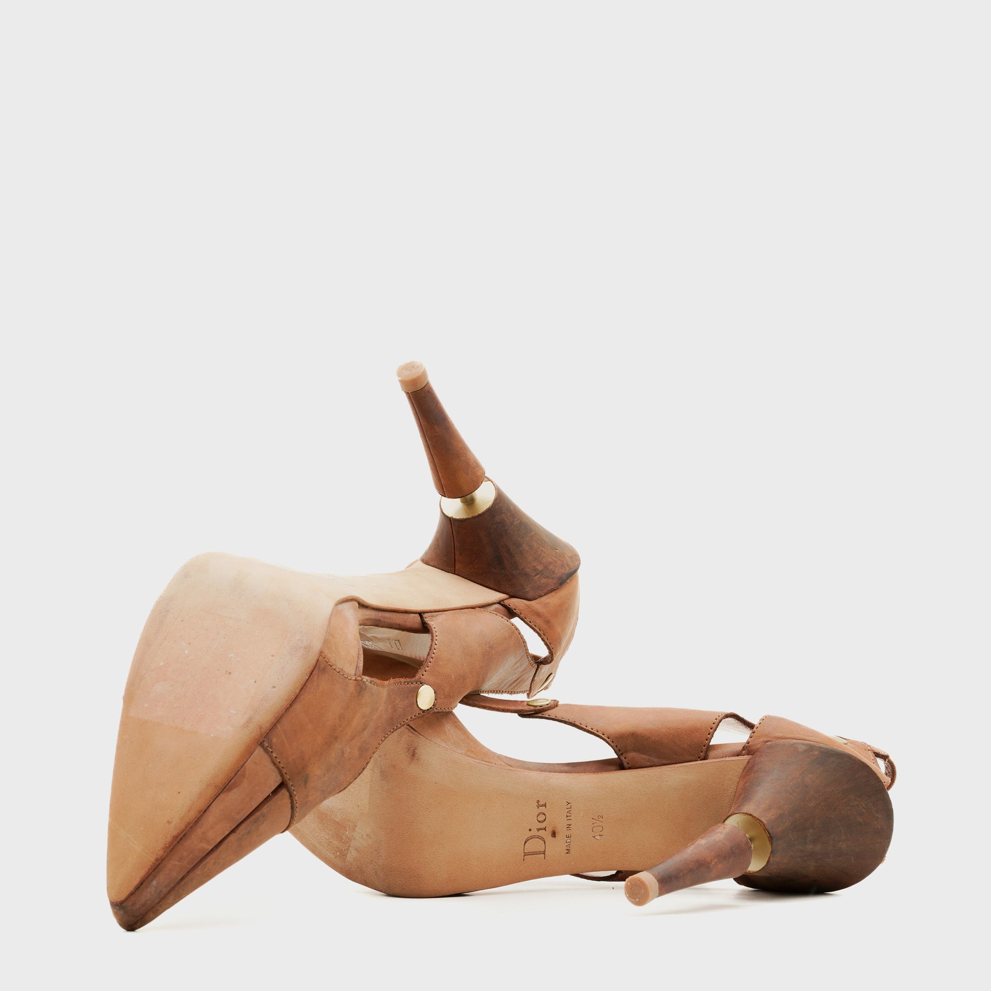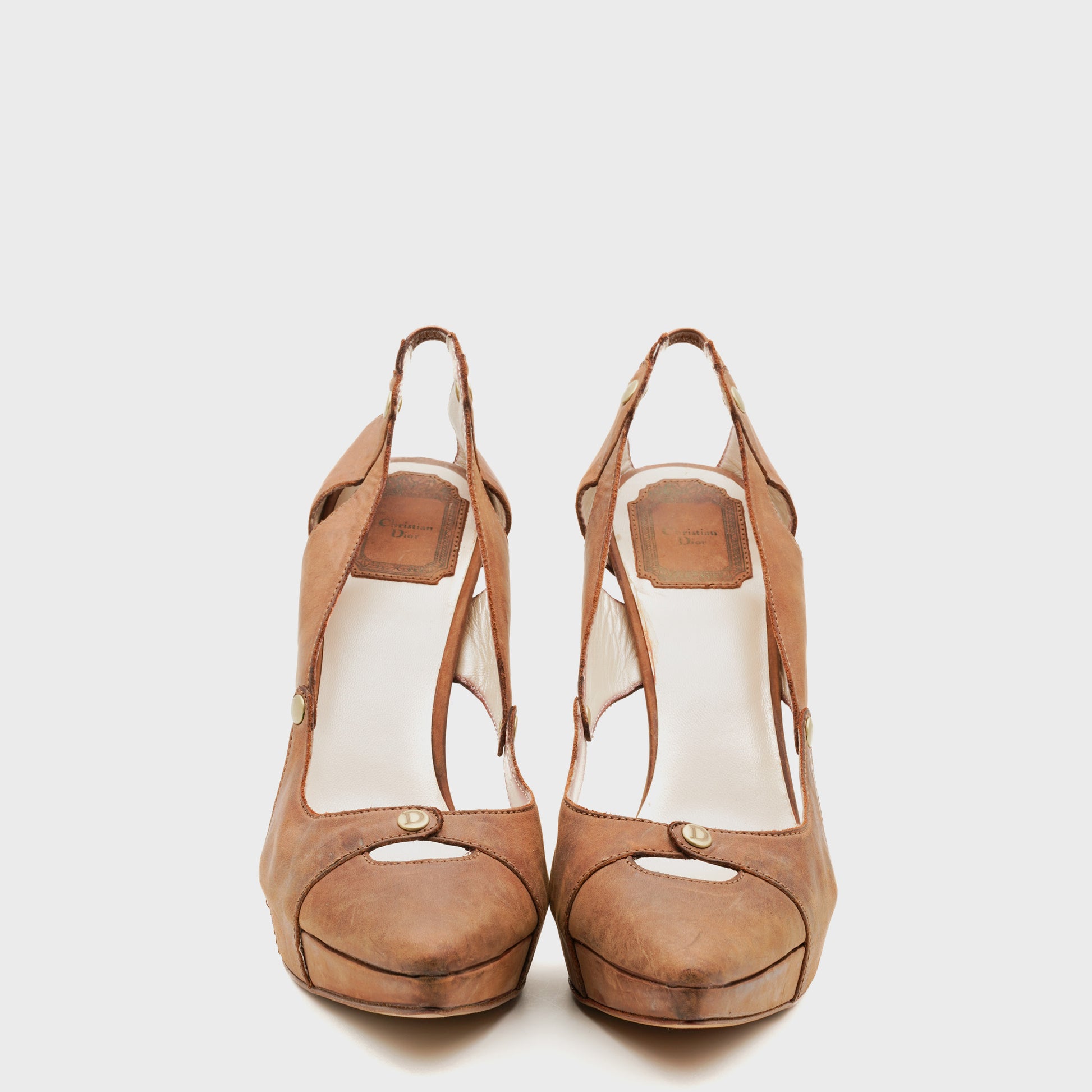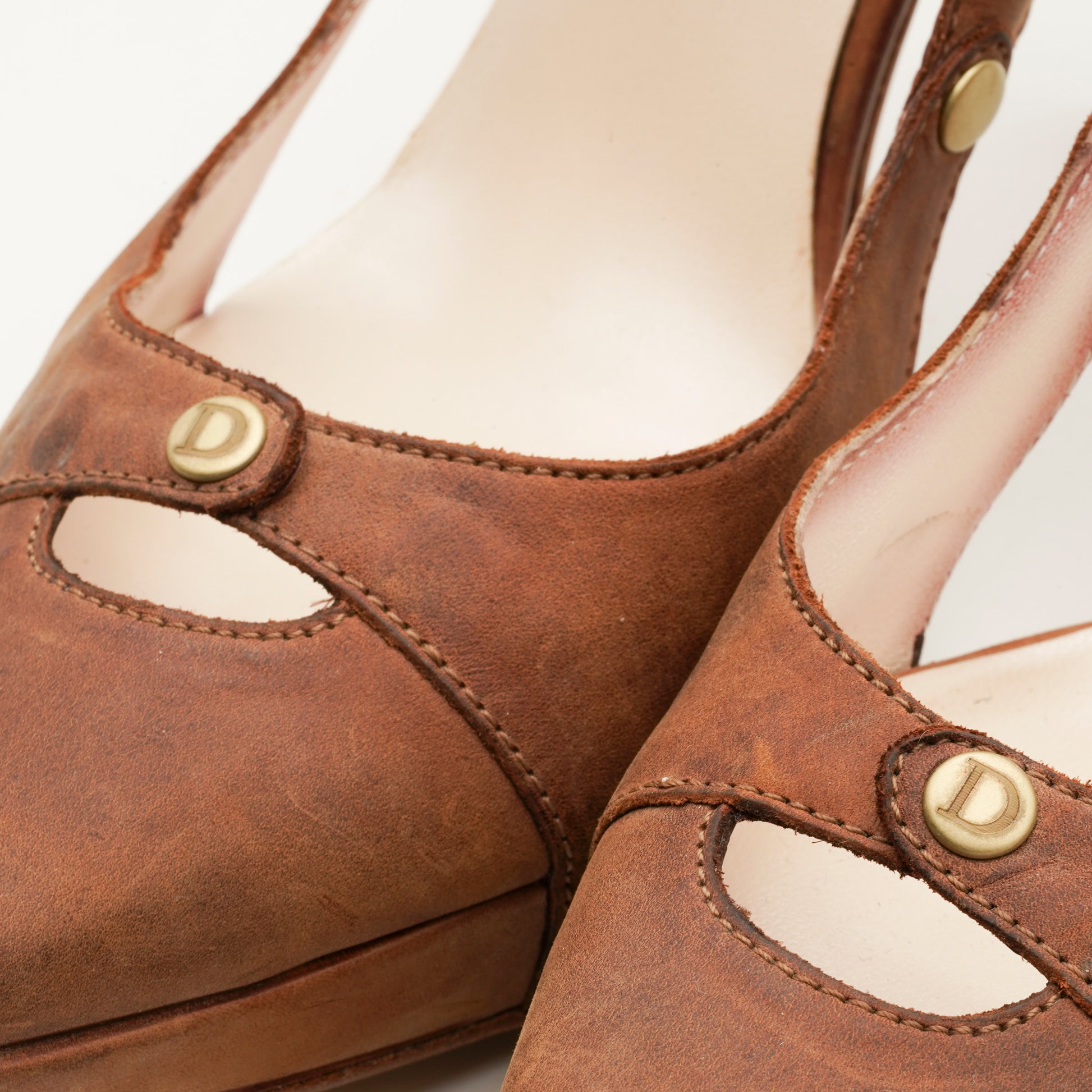 Brown leather pumps, stitching details and metal buttons engraved with a "D". Conical leather heels with gold metal element, openwork cutouts and elastic band at the back. Leather insole and exterior.