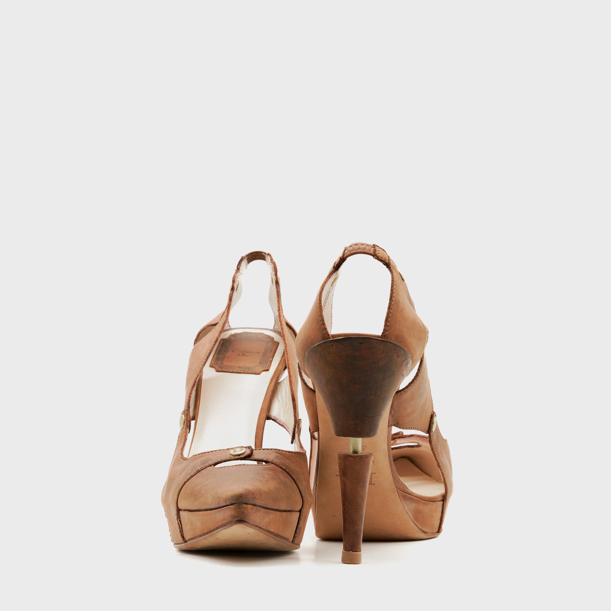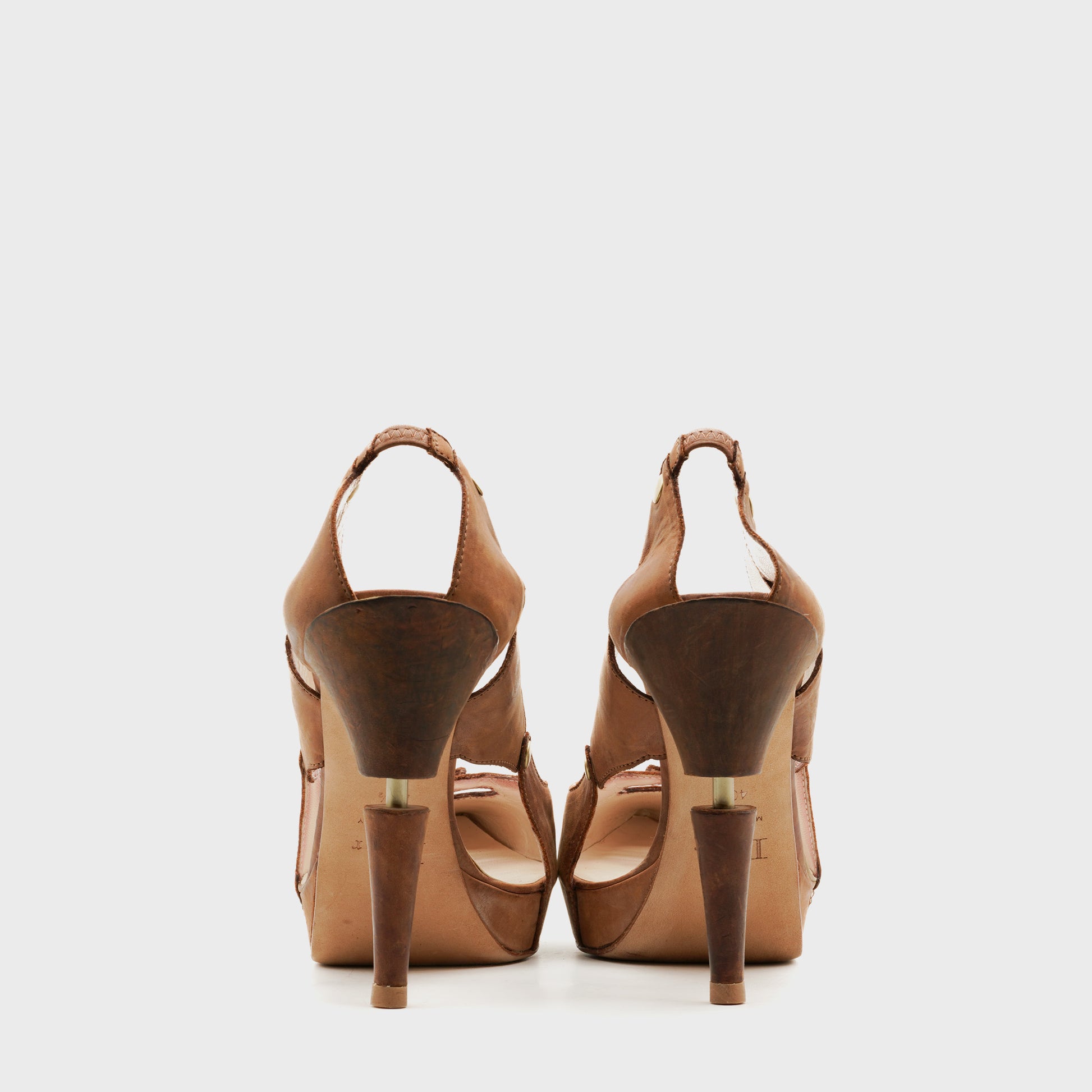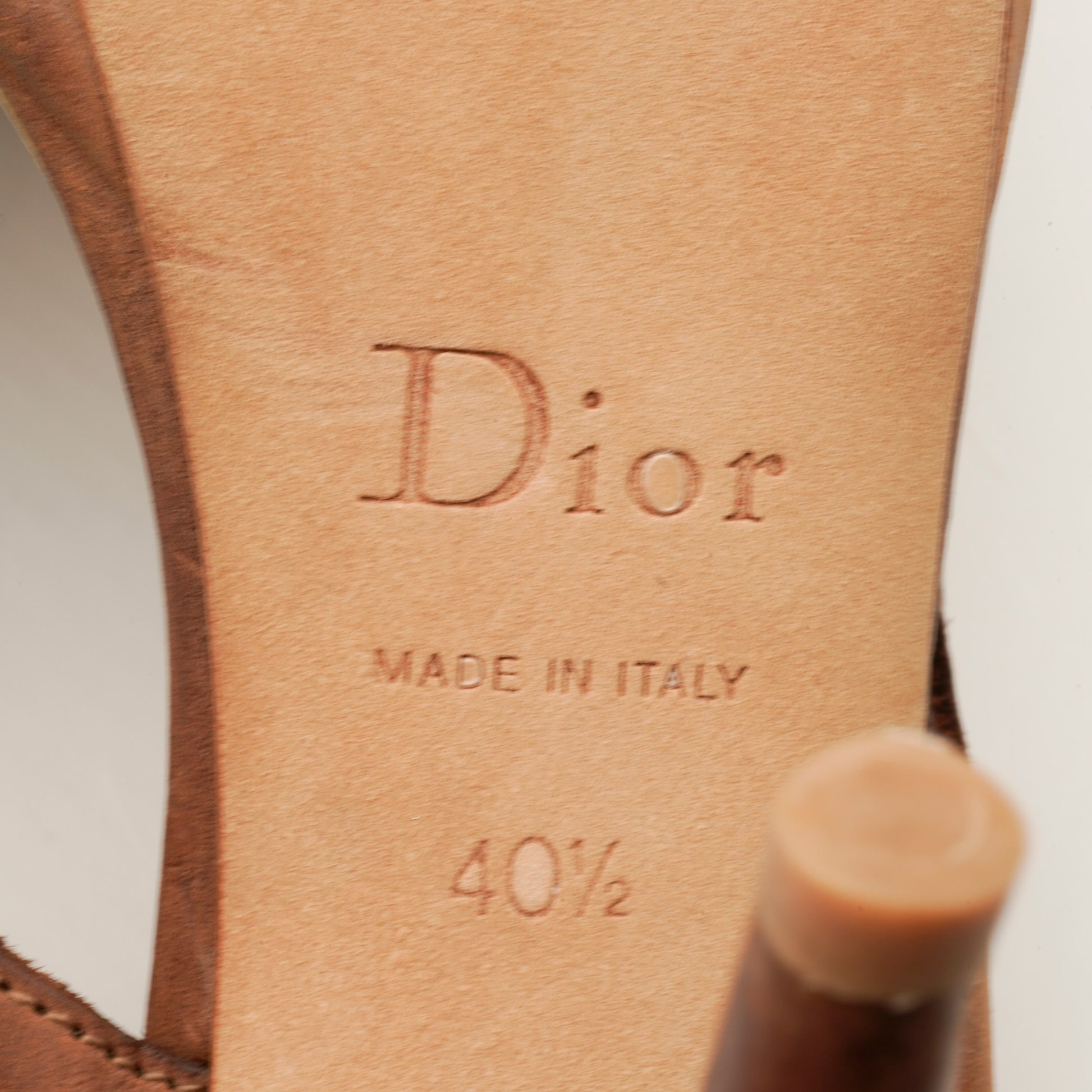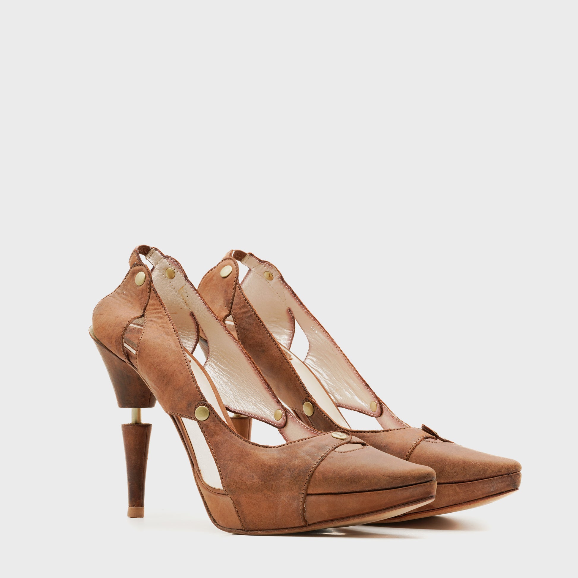Brown leather pumps, stitching details and metal buttons engraved with a "D". Conical leather heels with gold metal element, openwork cutouts and elastic band at the back. Leather insole and exterior.