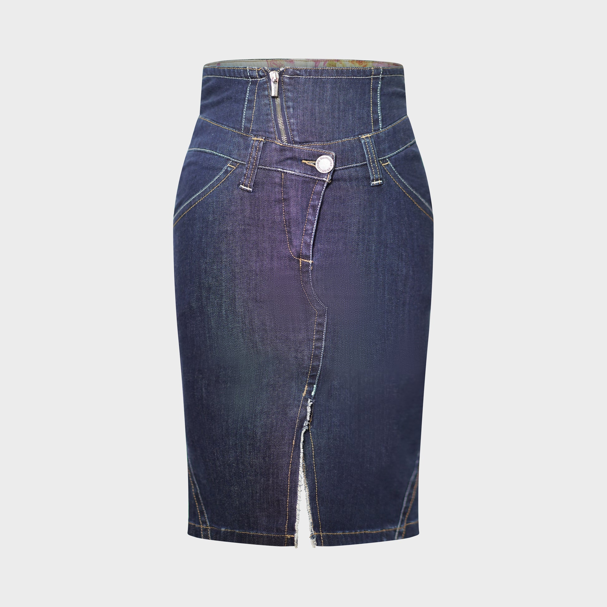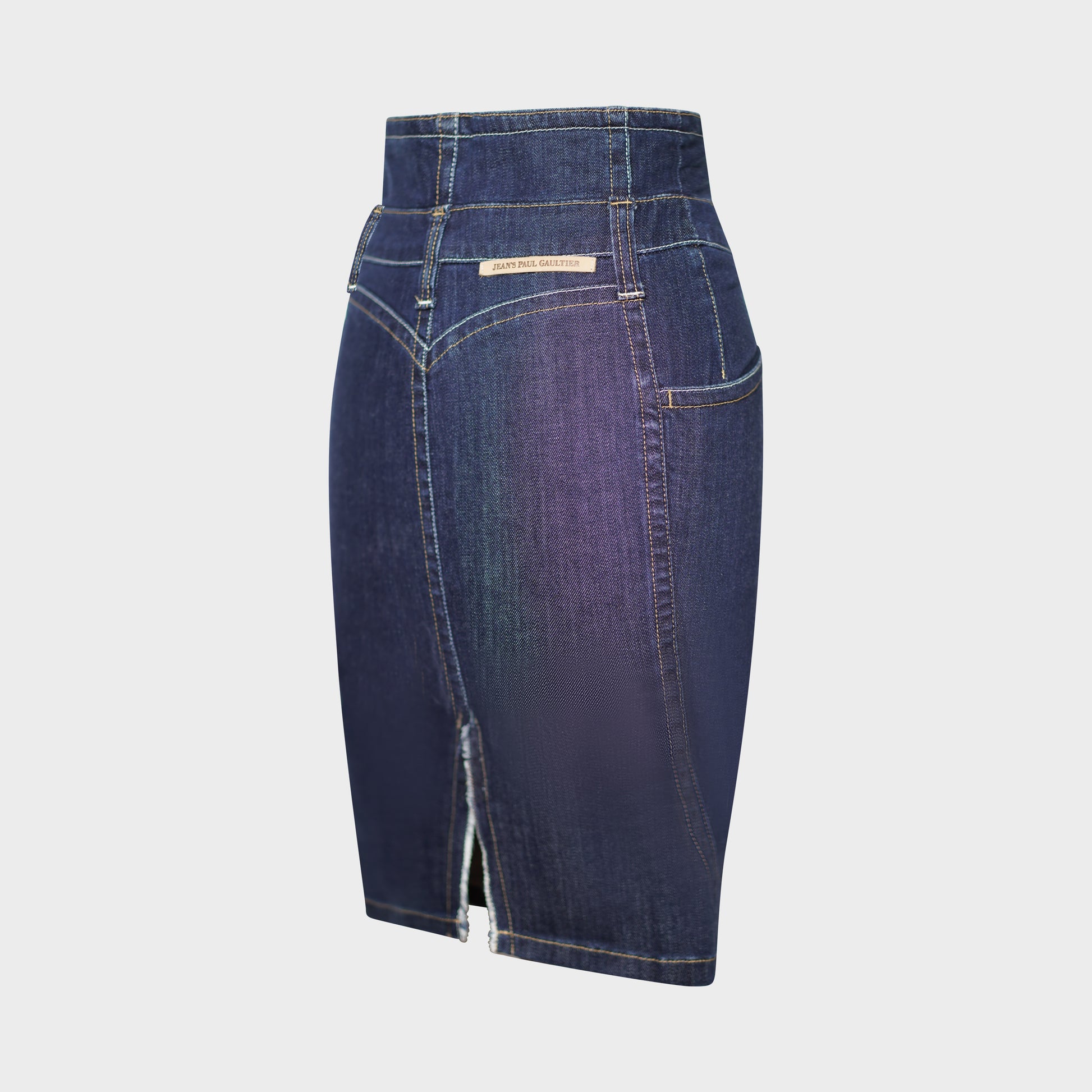 High-waisted denim skirt with a fitted silhouette. Discreet slit detail at the front and back, visible stitching that emphasizes the structure of the garment.