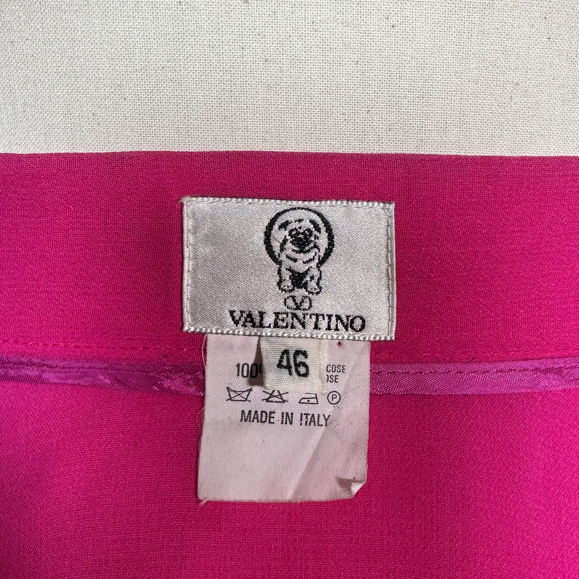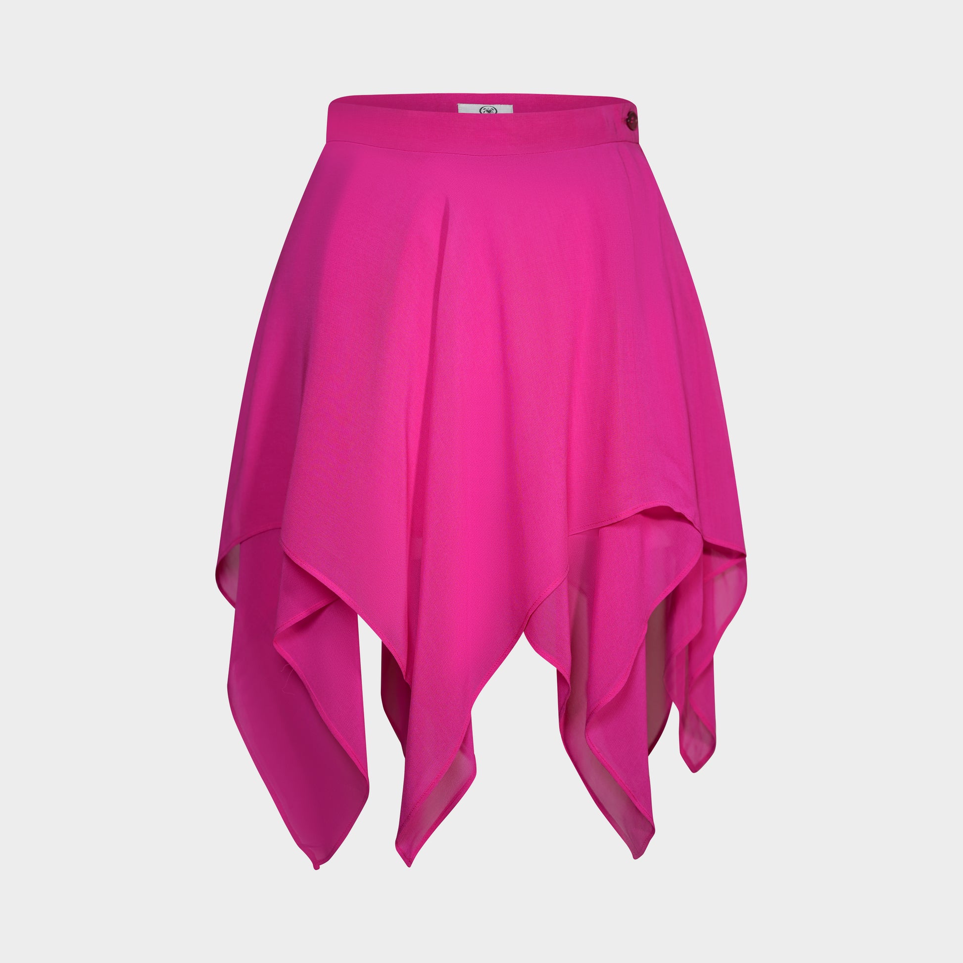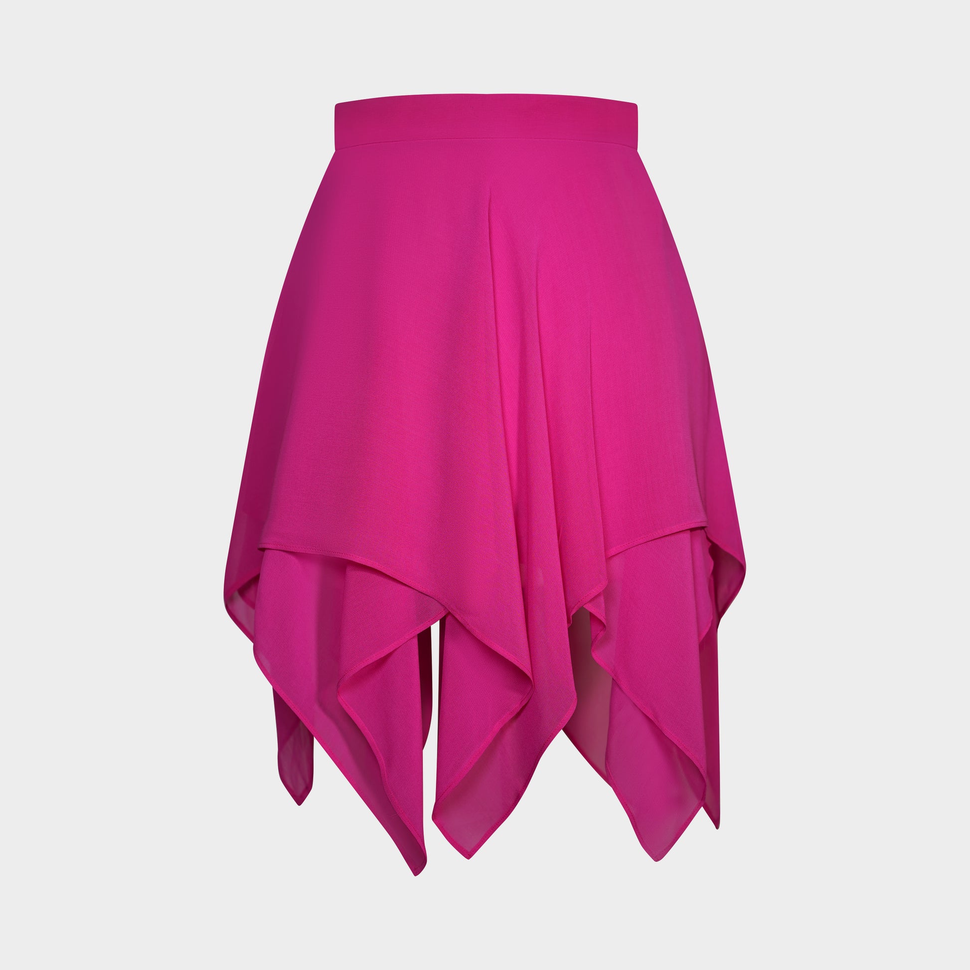 Fuchsia pink asymmetrical skirt, creating a fluid drape with a tapered stitch effect at the bottom. Discreet side closure on the side