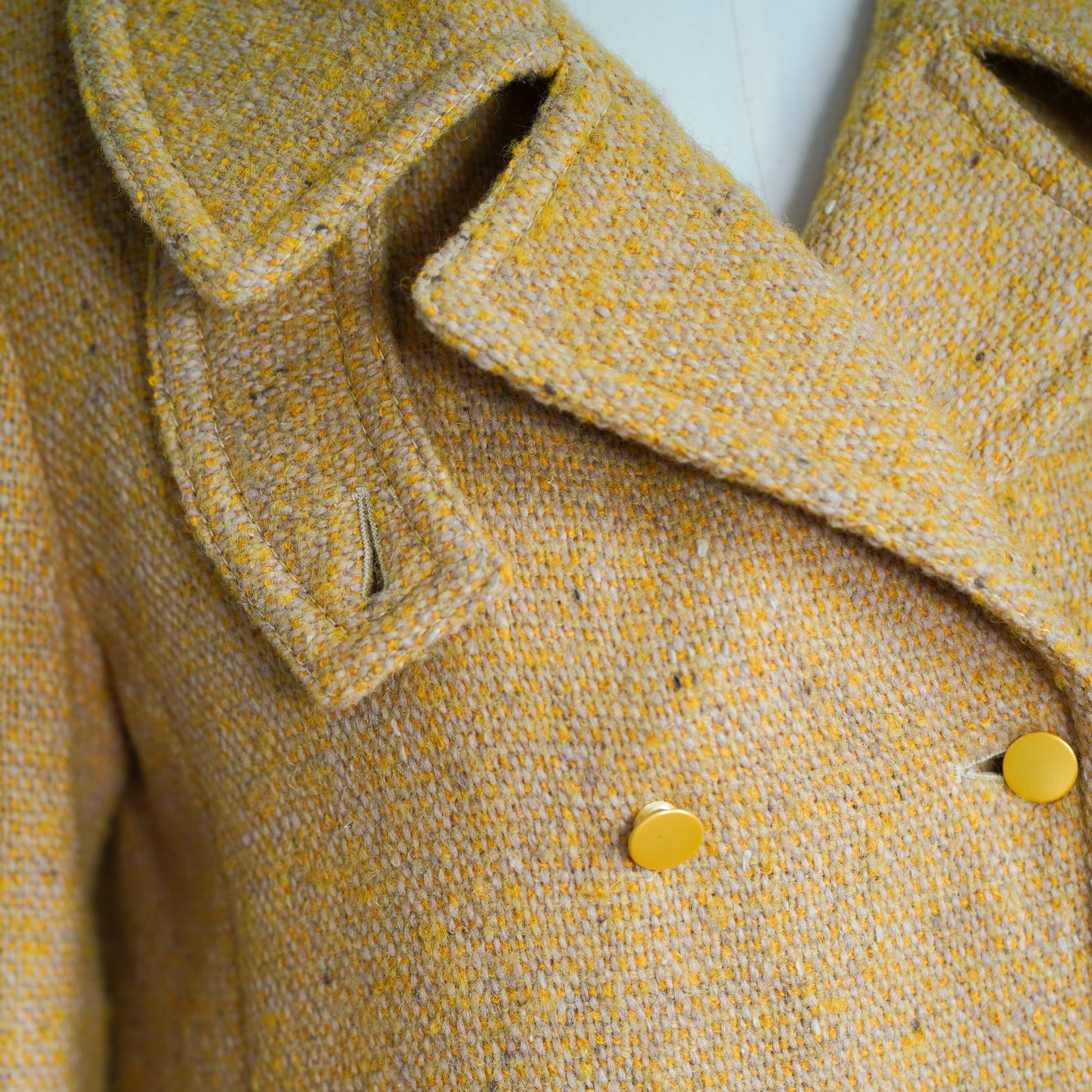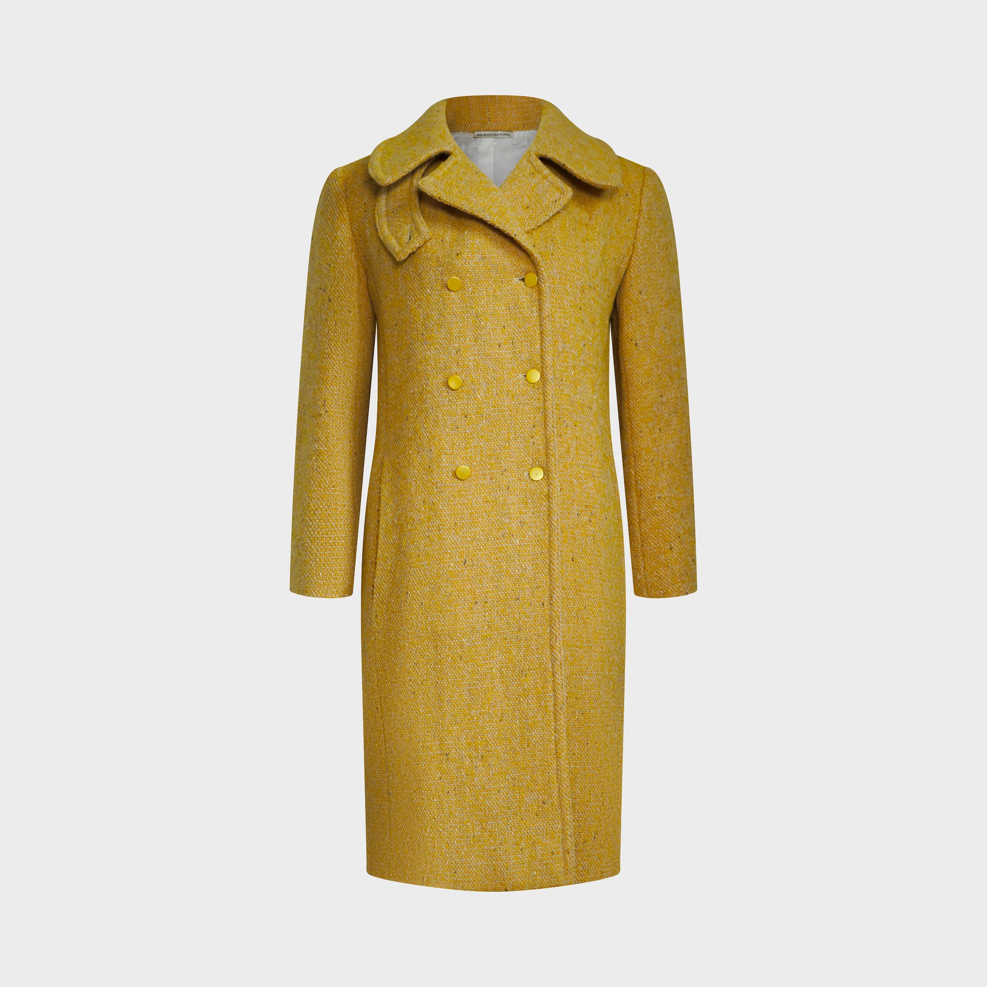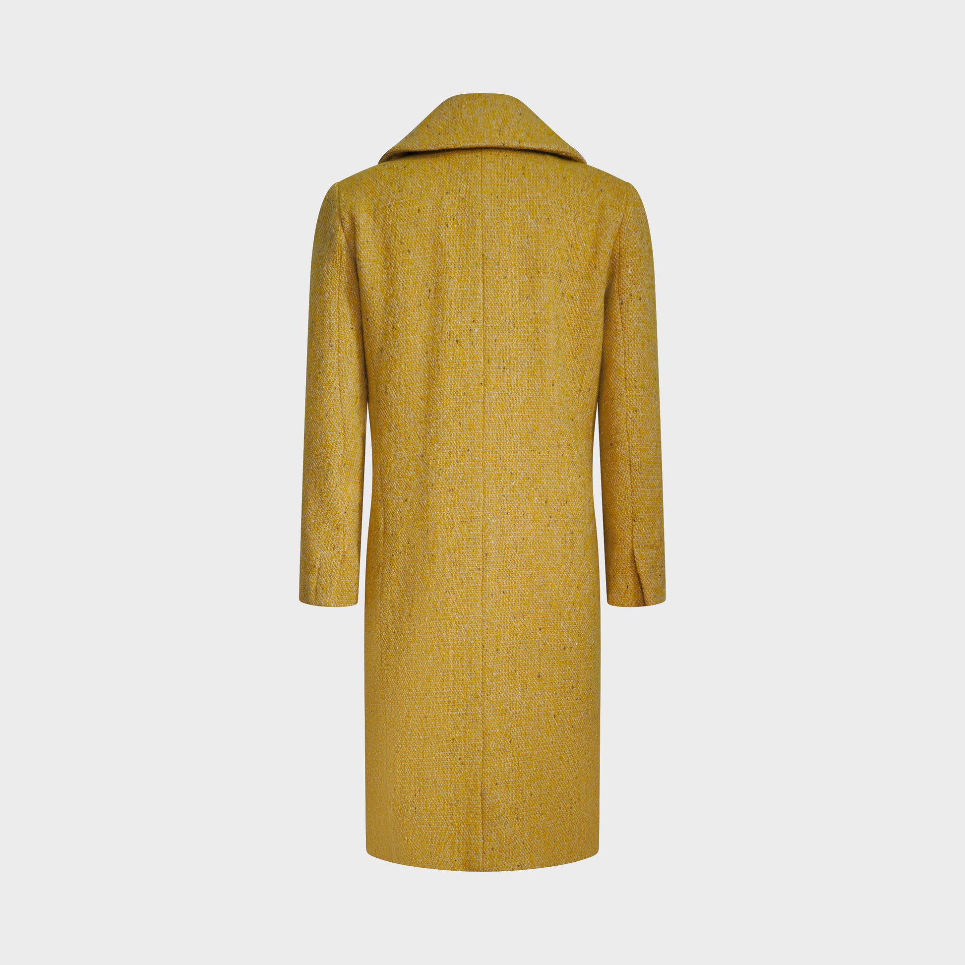 Coat in mottled wool and mohair tweed in shades of yellow, elegant double-breasted, and a distinctive collar with a tightening tab. Featuring two pockets.