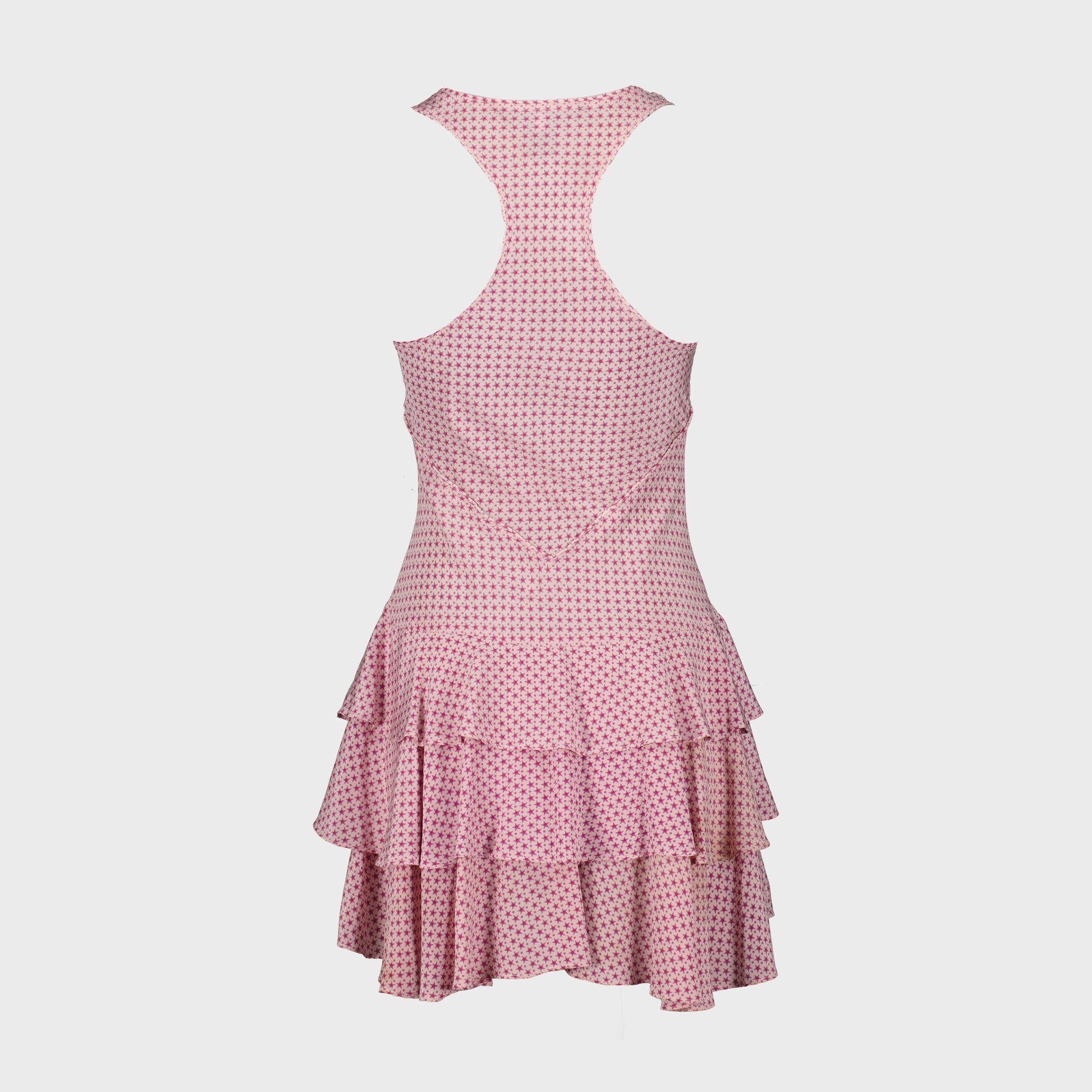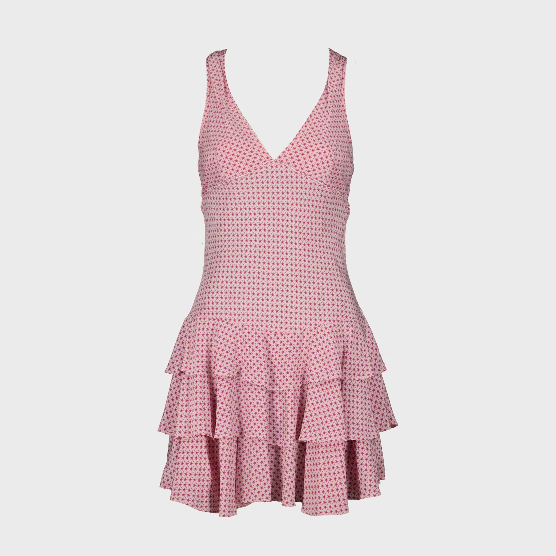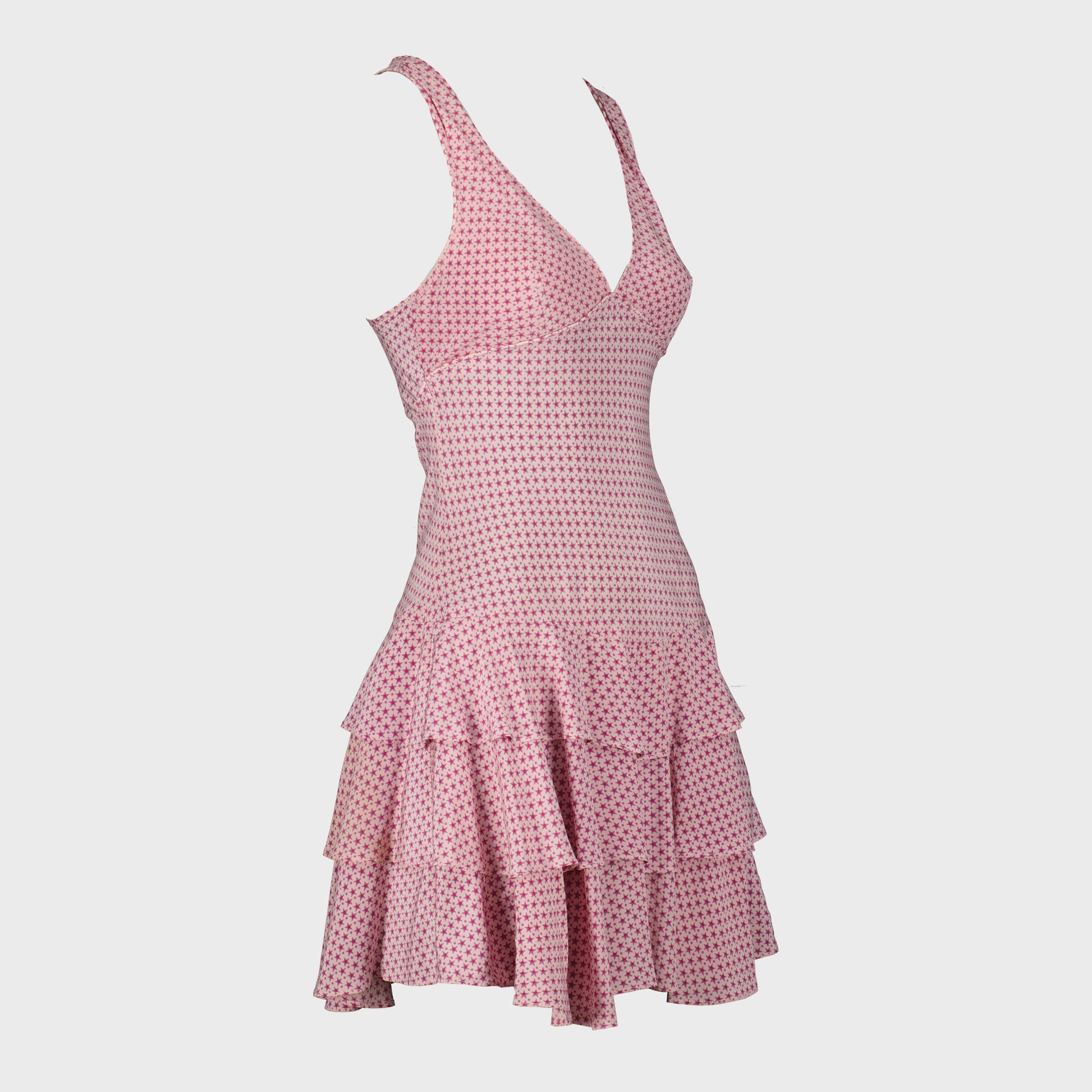 Star pattern silk dress. V-neckline, sleeveless, multi-ruffle design. Cutout under the bust