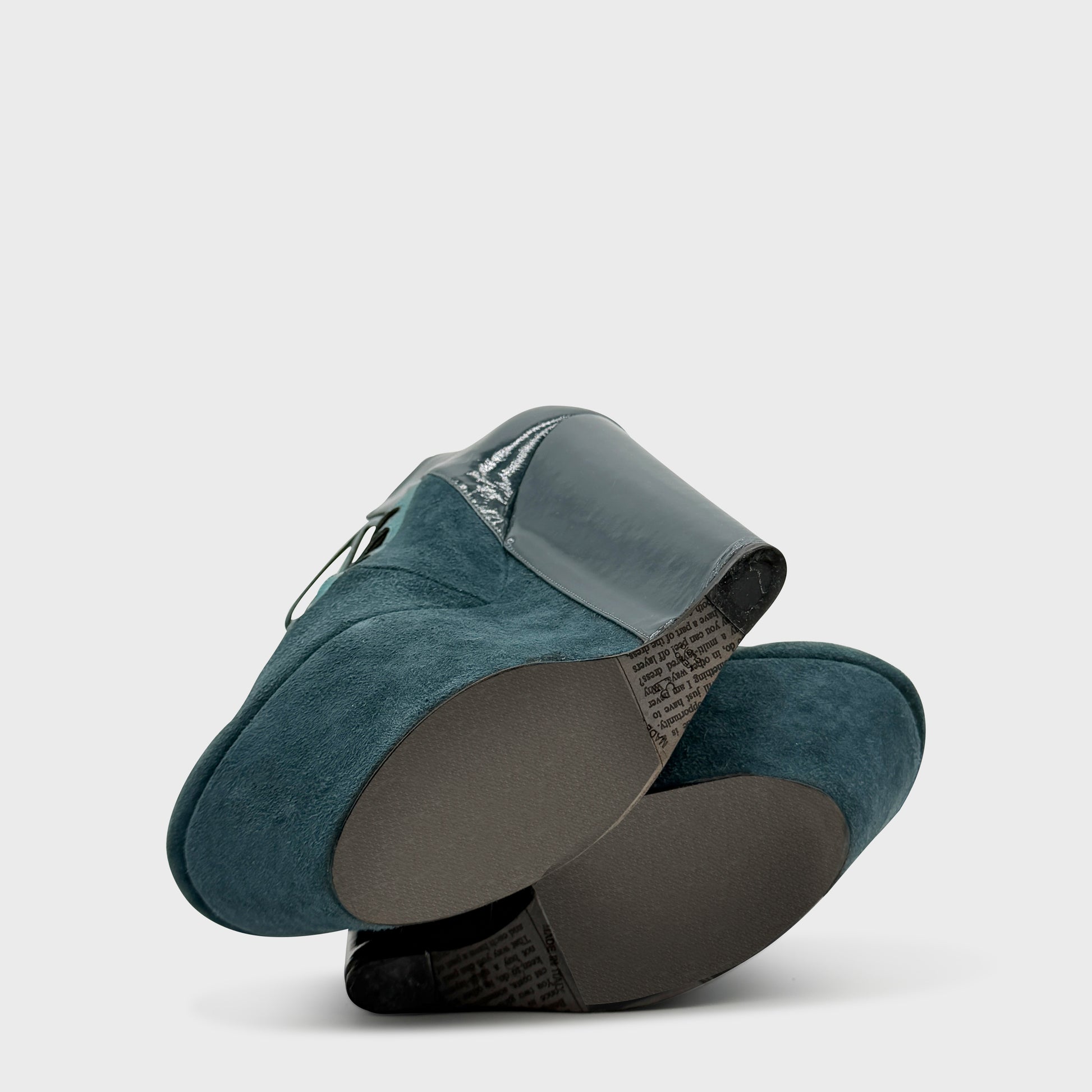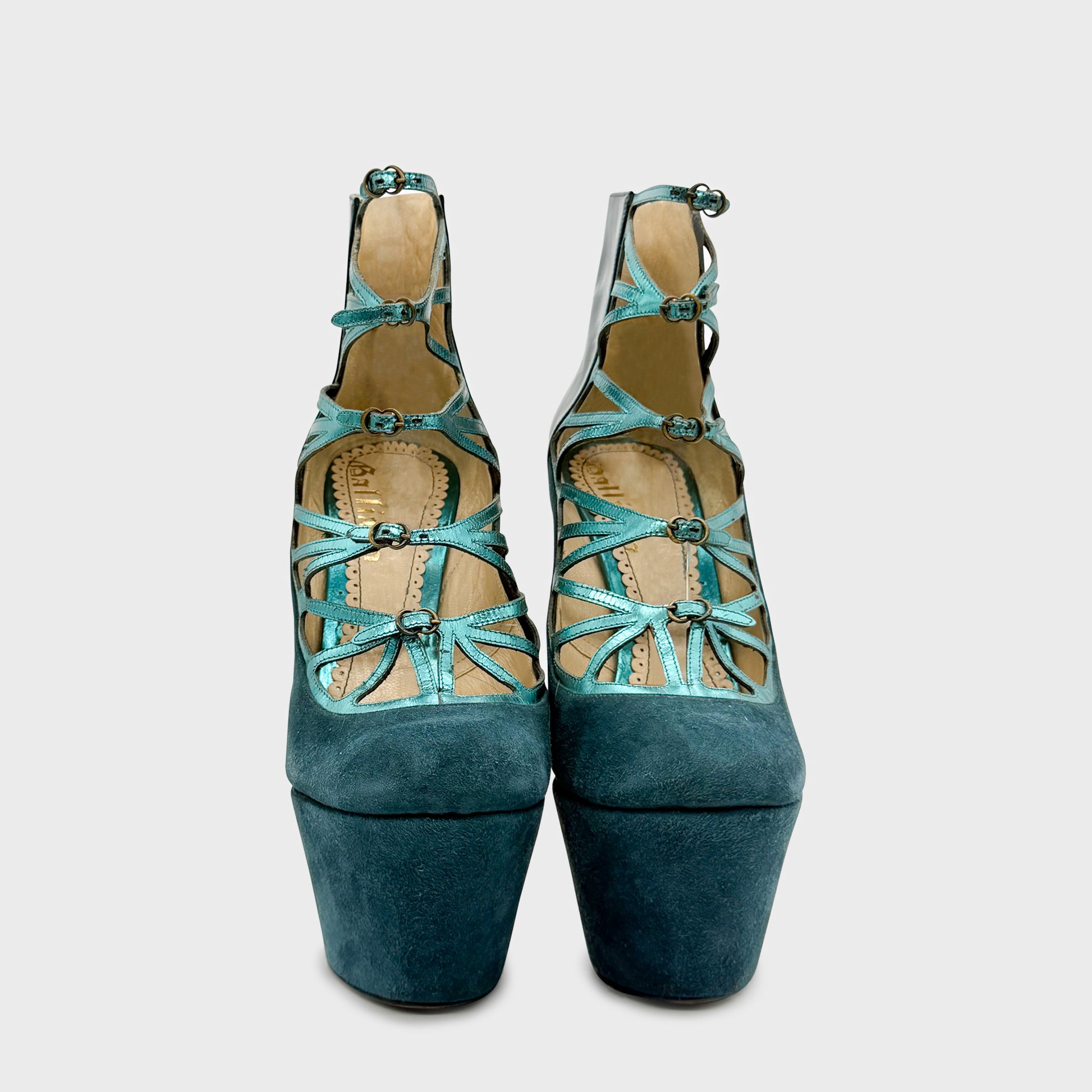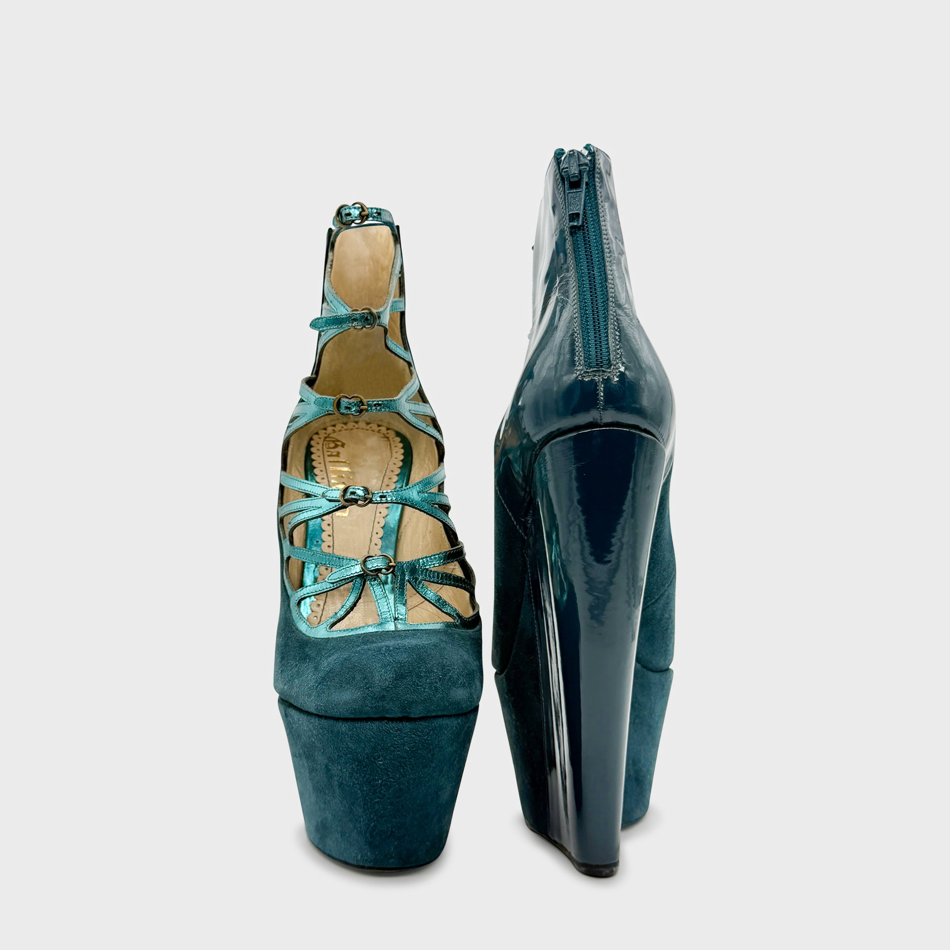Platform ankle boots in petrol blue suede, vertiginous construction and architectural lacing with criss-cross straps highlighted with metallic finishes. Chunky sheathed heel, extreme volumes and graphic lines typical of Galliano from the late 2000s, between couture radicalism and assertive theatricality.