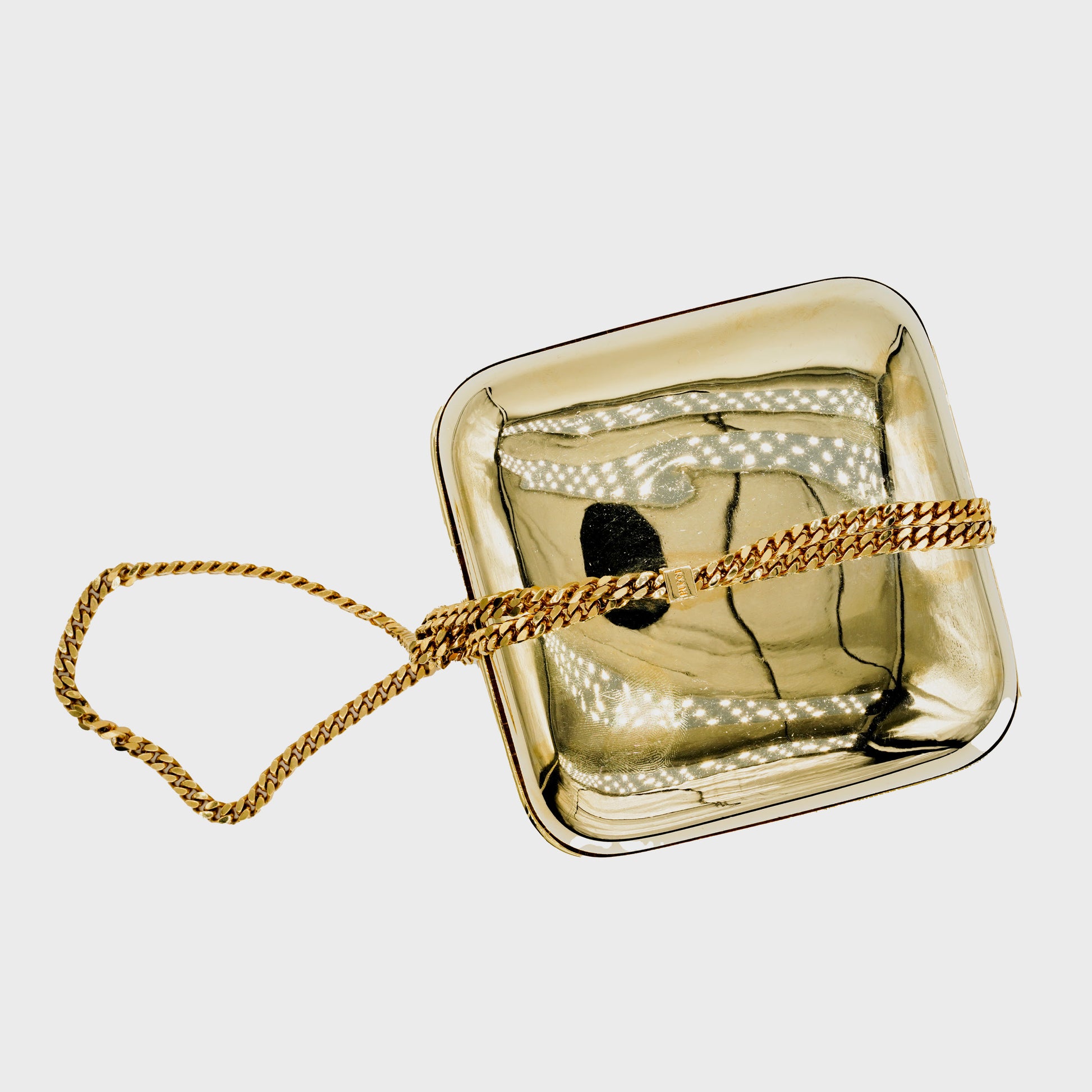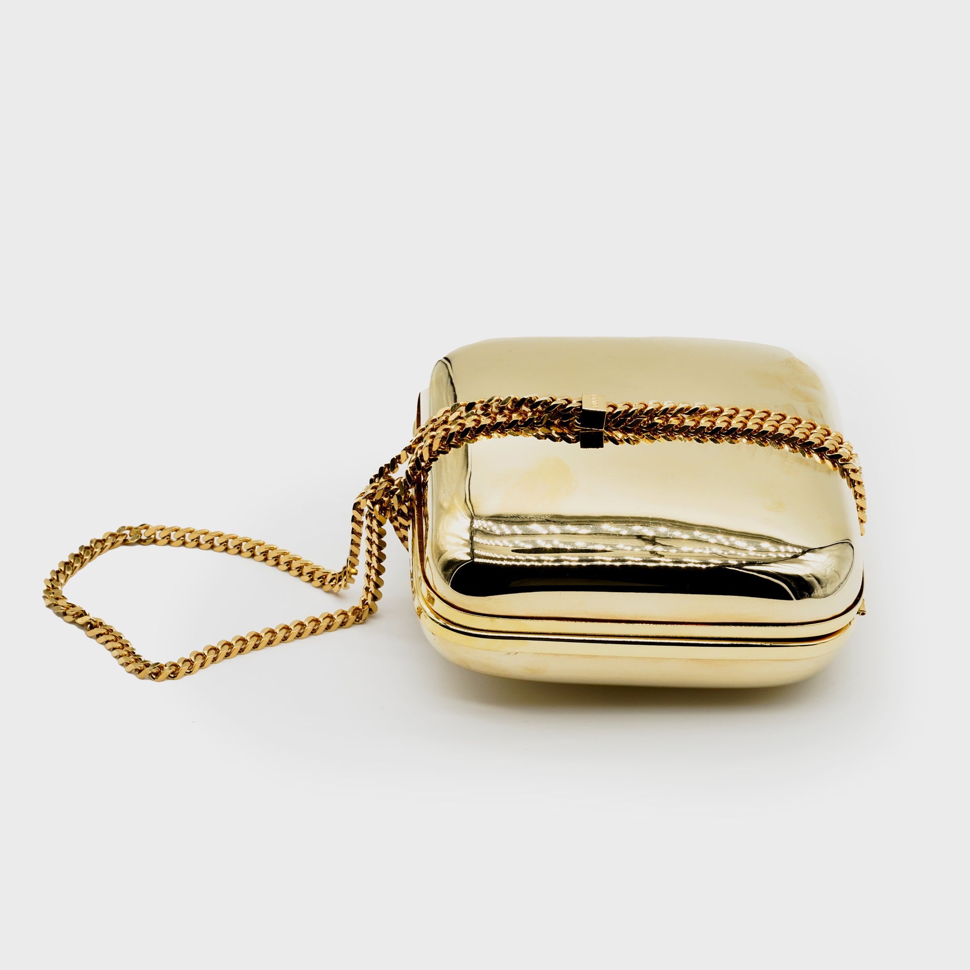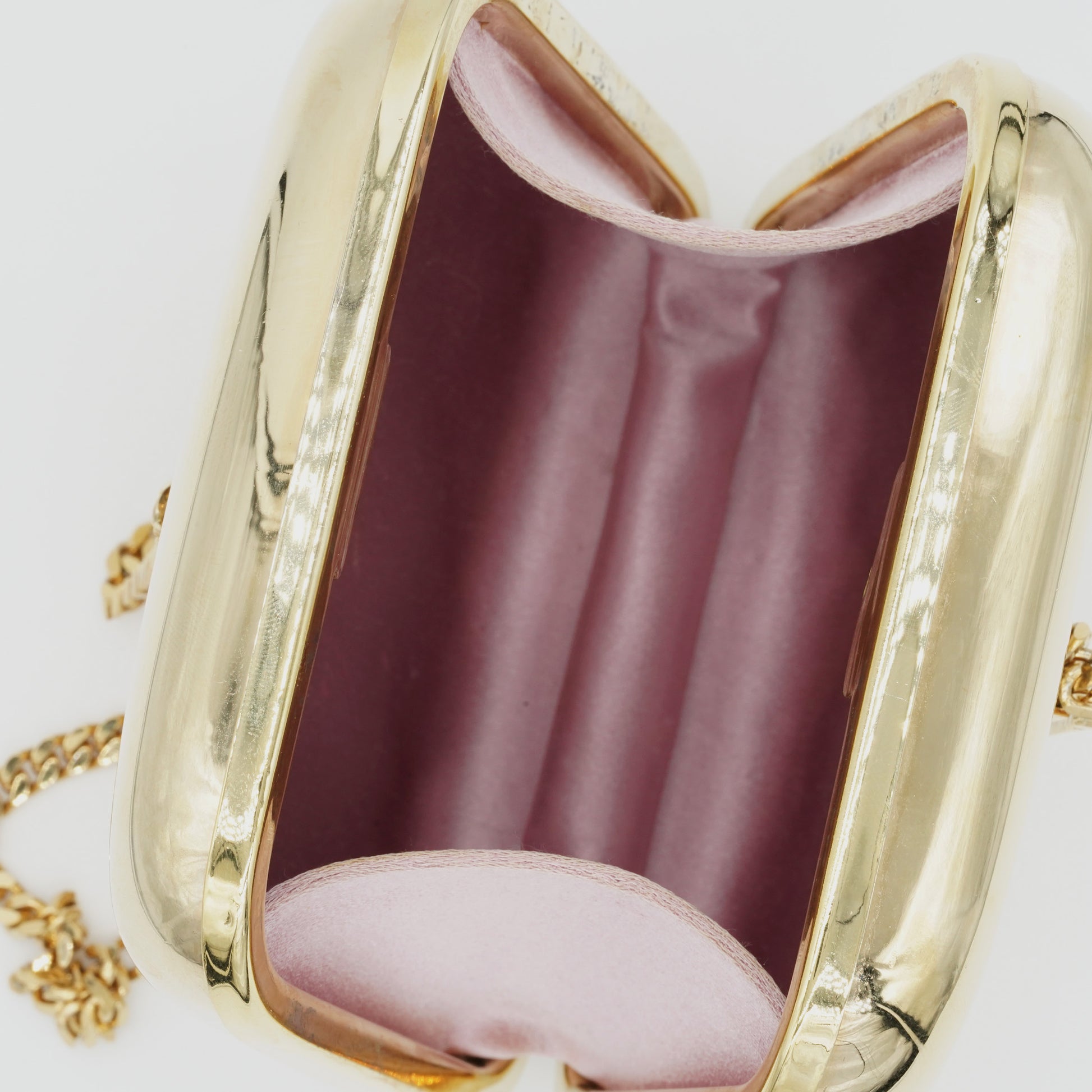 Minaudière with powder pink satin interior, magnetic closure and gold chain link