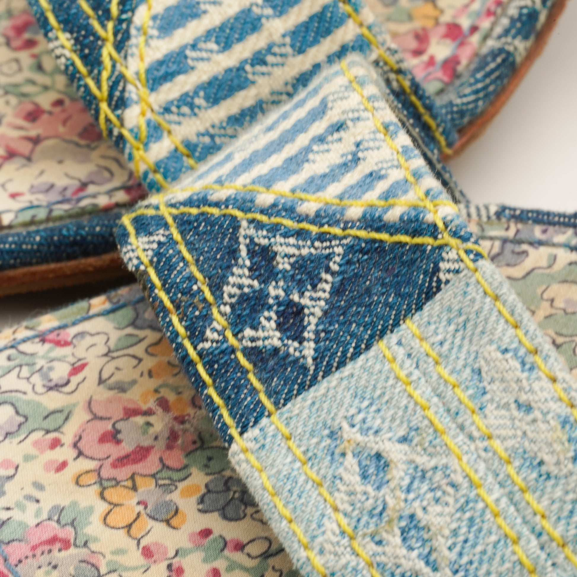 Denim sandals with monogram patterns and yellow stitching details. Leather flower straps. Fastens with a gold buckle at the ankle. Padded insoles with liberty patterns. Varnished wooden heel and leather sole.