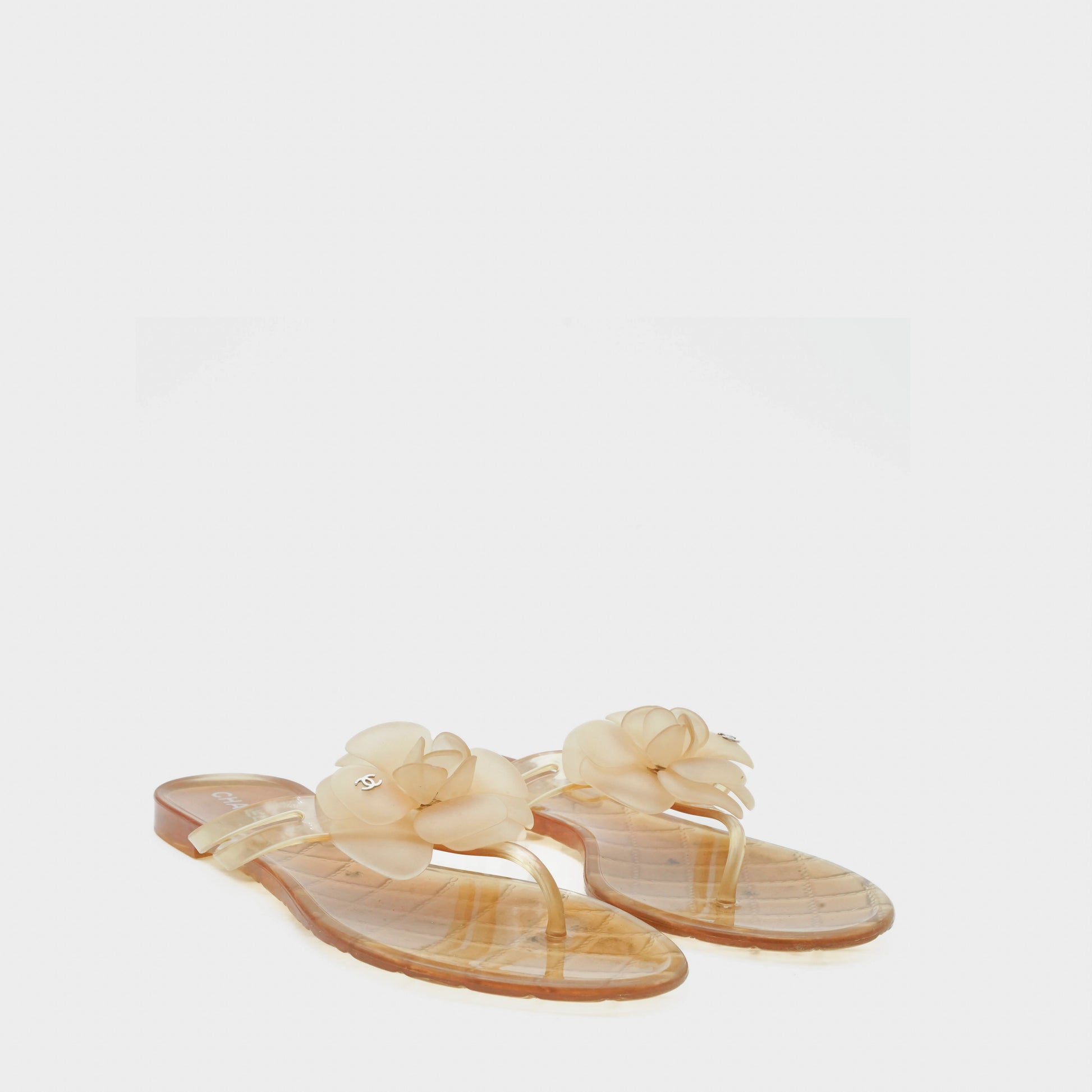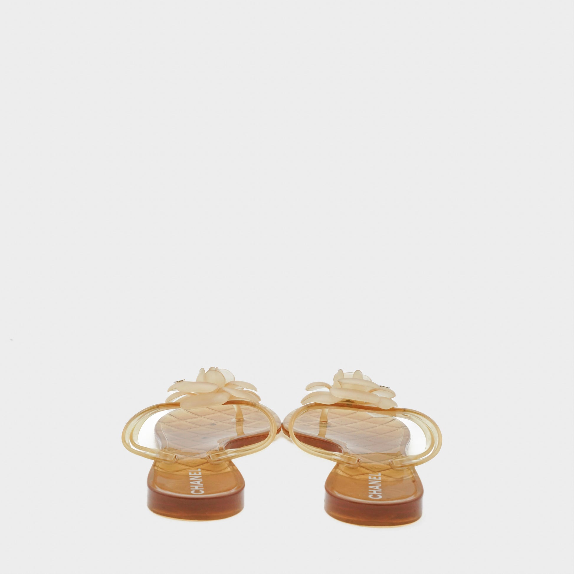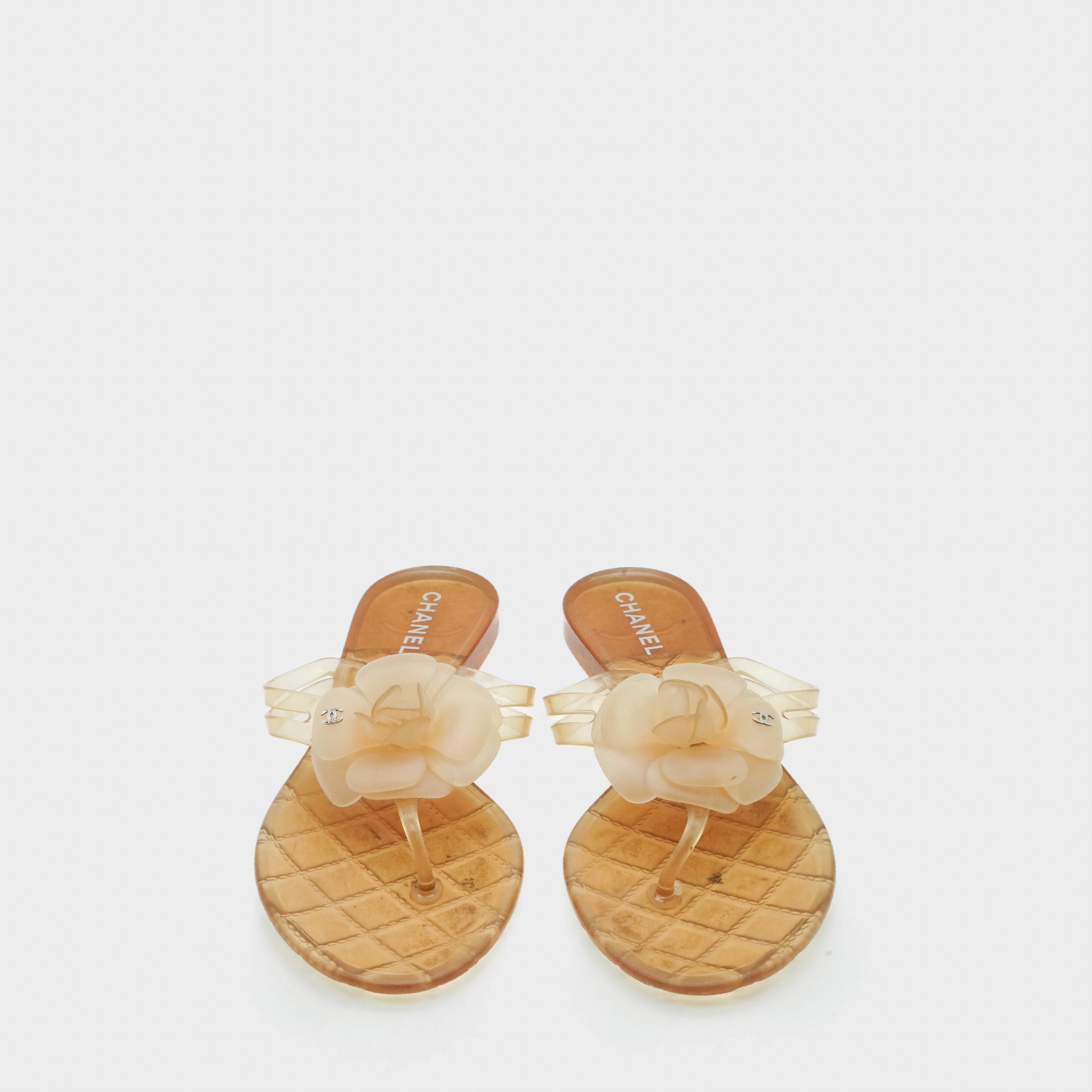 Flat sandals in transparent PVC and rubber, adorned with an iconic translucent camellia with the CC logo. Quilted embossed sole, reminiscent of the 2.55 bag.
