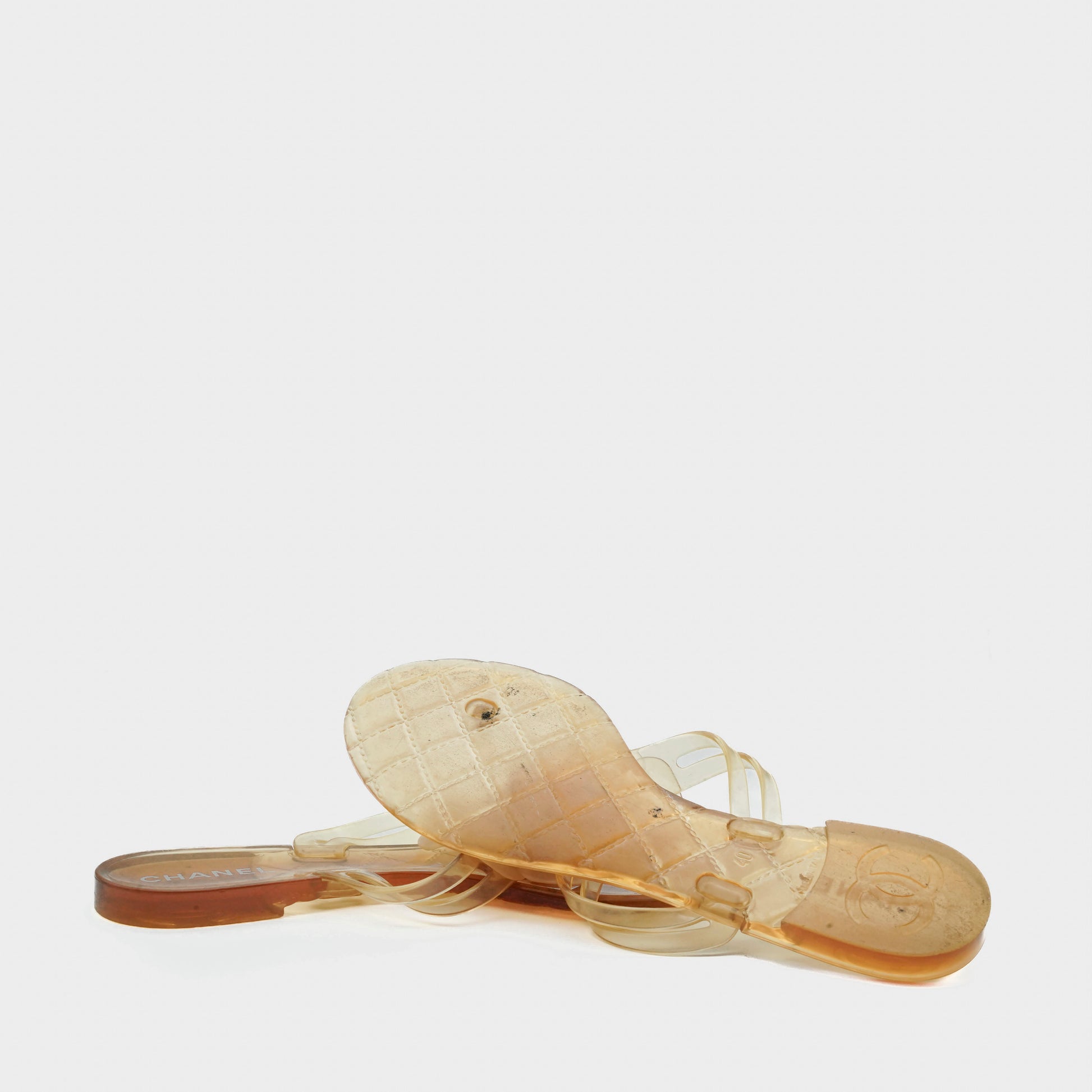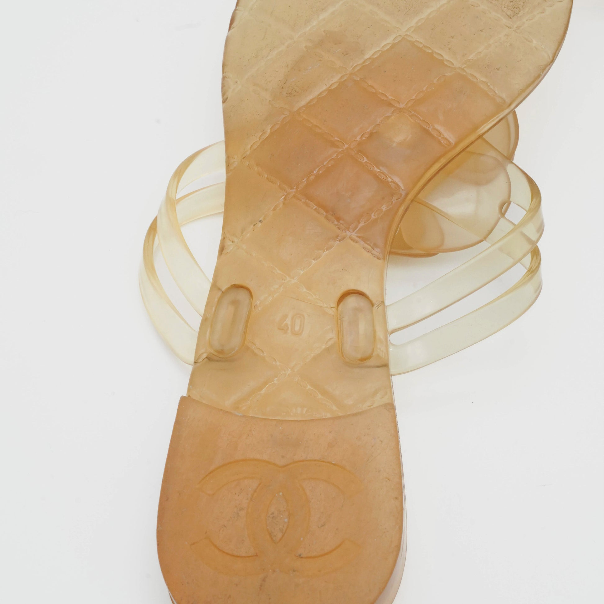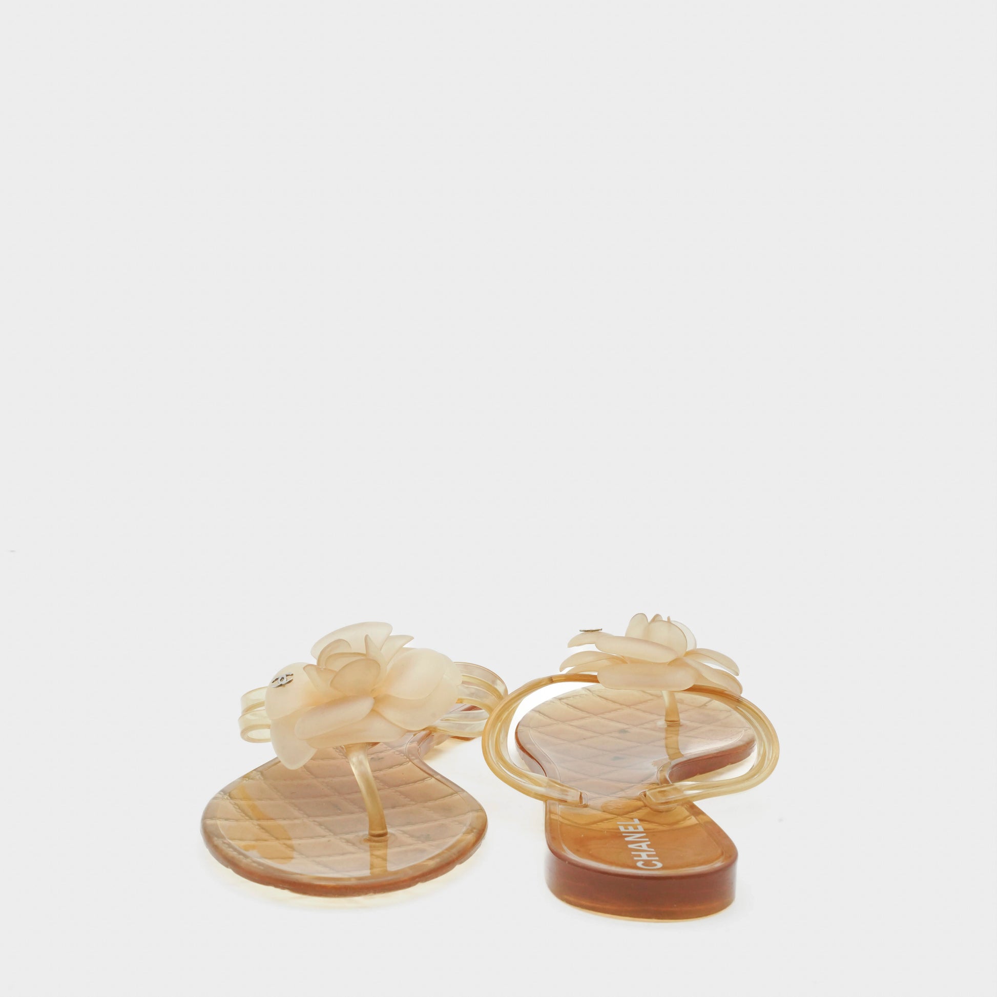 Flat sandals in transparent PVC and rubber, adorned with an iconic translucent camellia with the CC logo. Quilted embossed sole, reminiscent of the 2.55 bag.