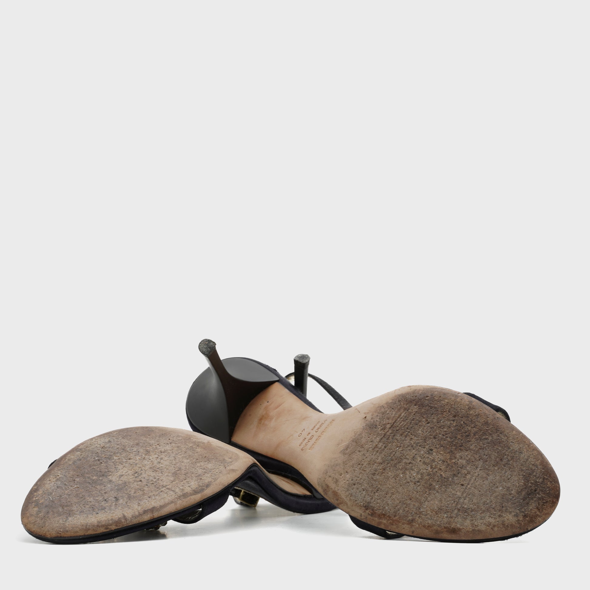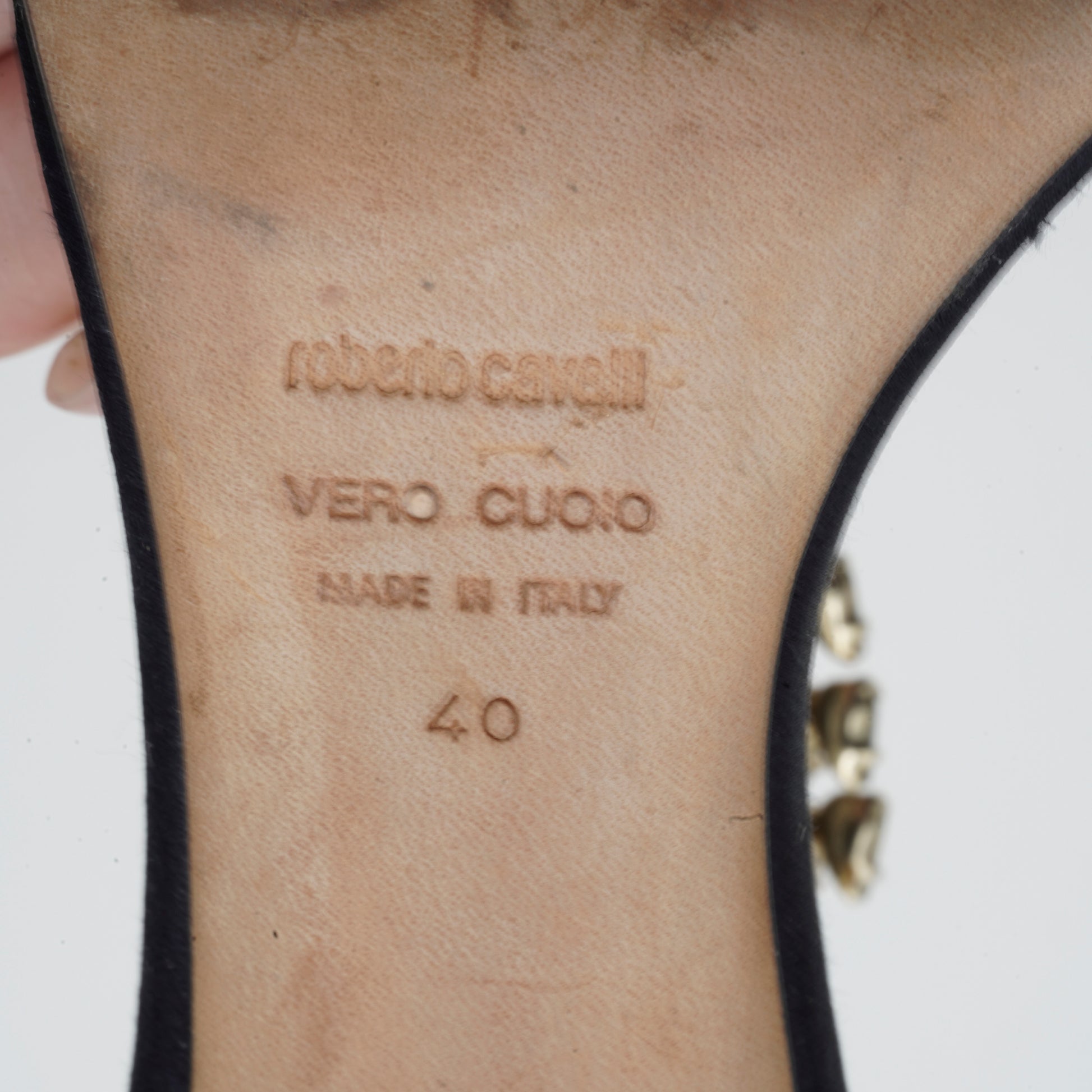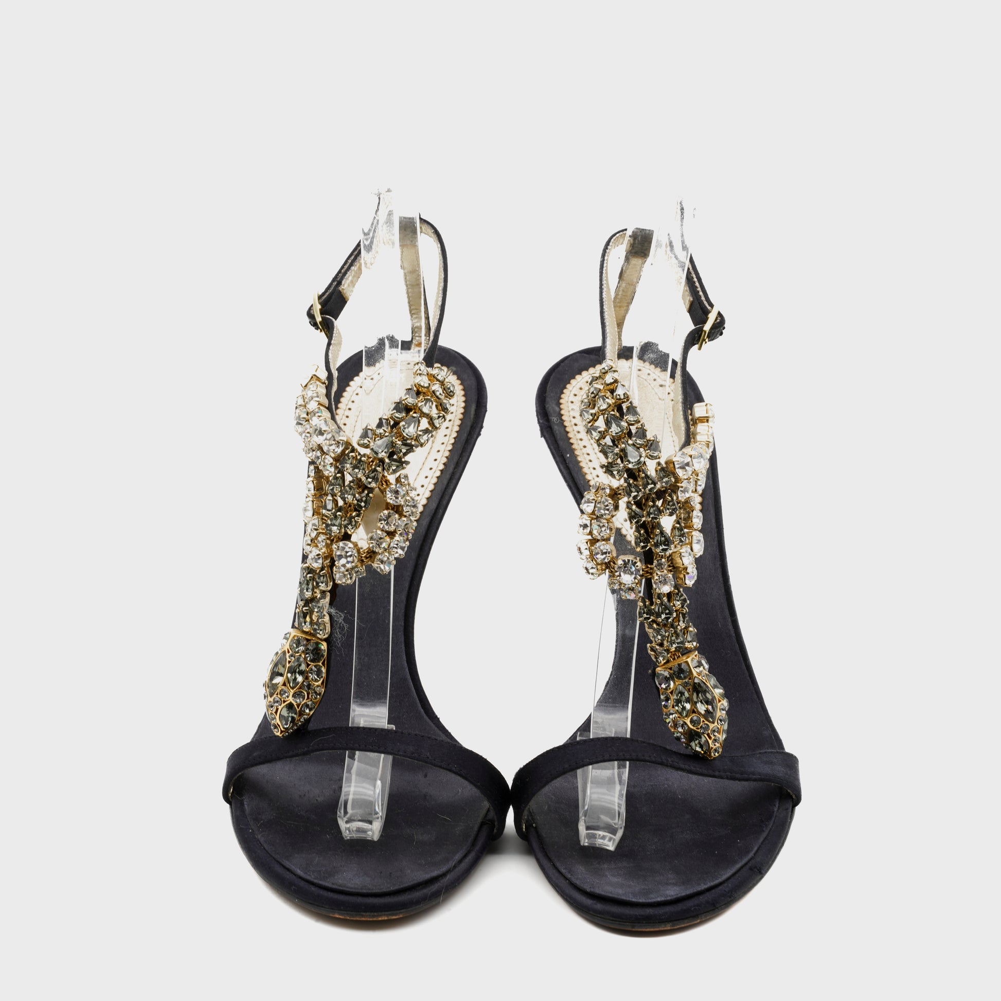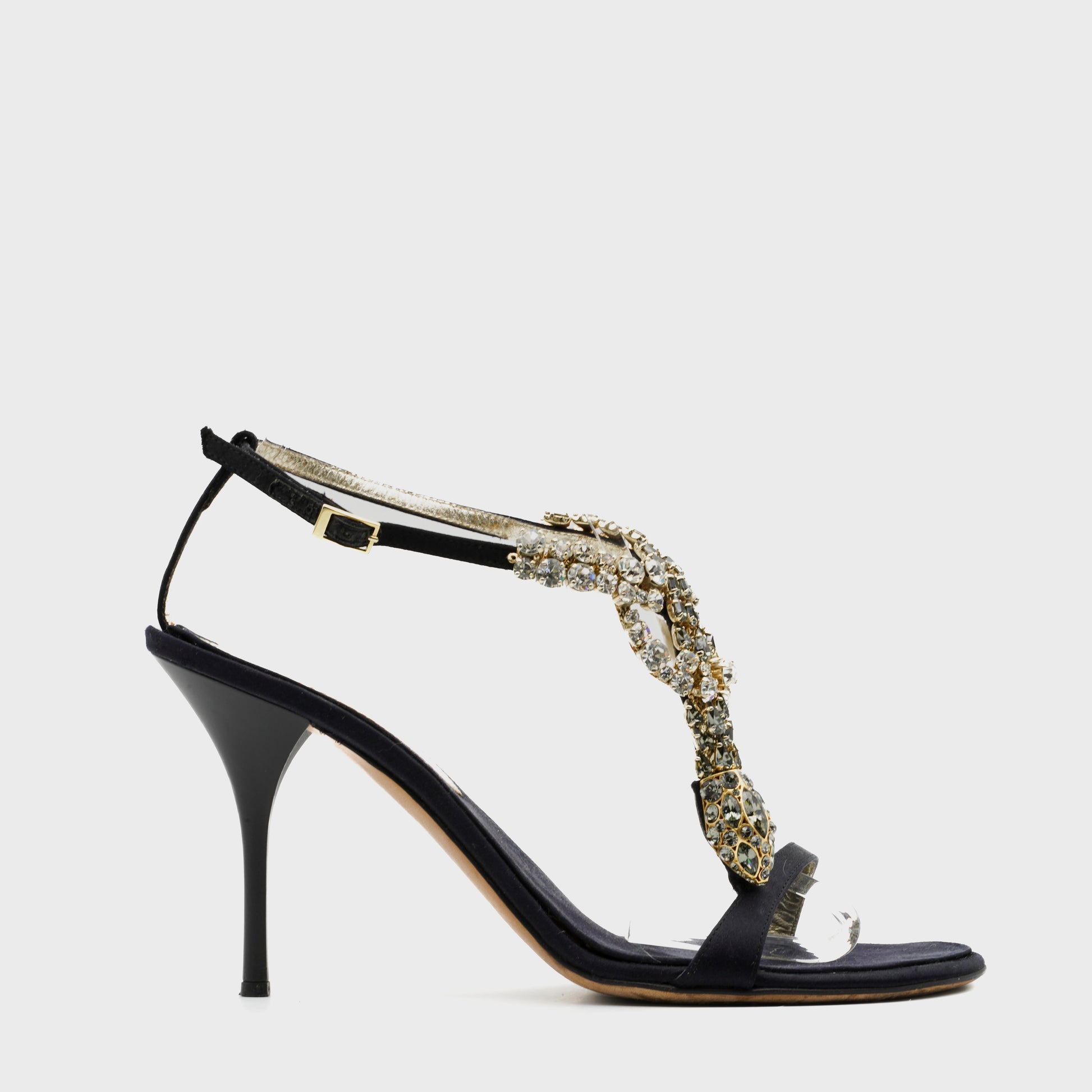 Pair of black satin strappy sandals, adorned with a gold metal chain paved with sparkling crystals, forming a snake silhouette. 10 cm stiletto heel, offering a bold and sophisticated elegance. Genuine leather lining. These sandals embody the luxury and extravagance typical of the Cavalli house.