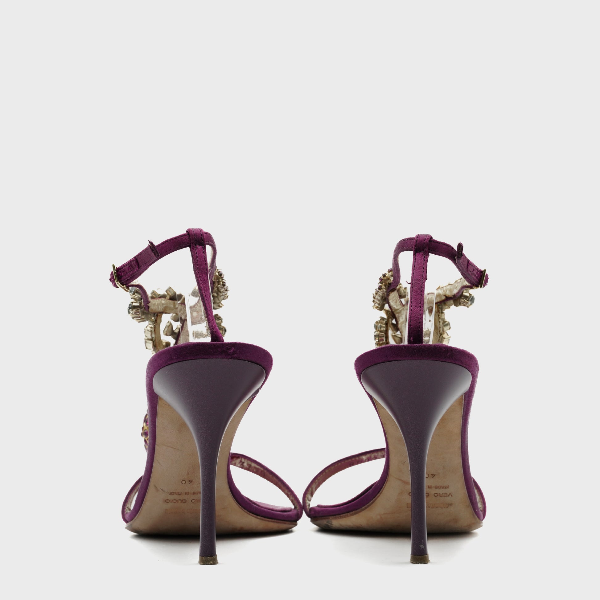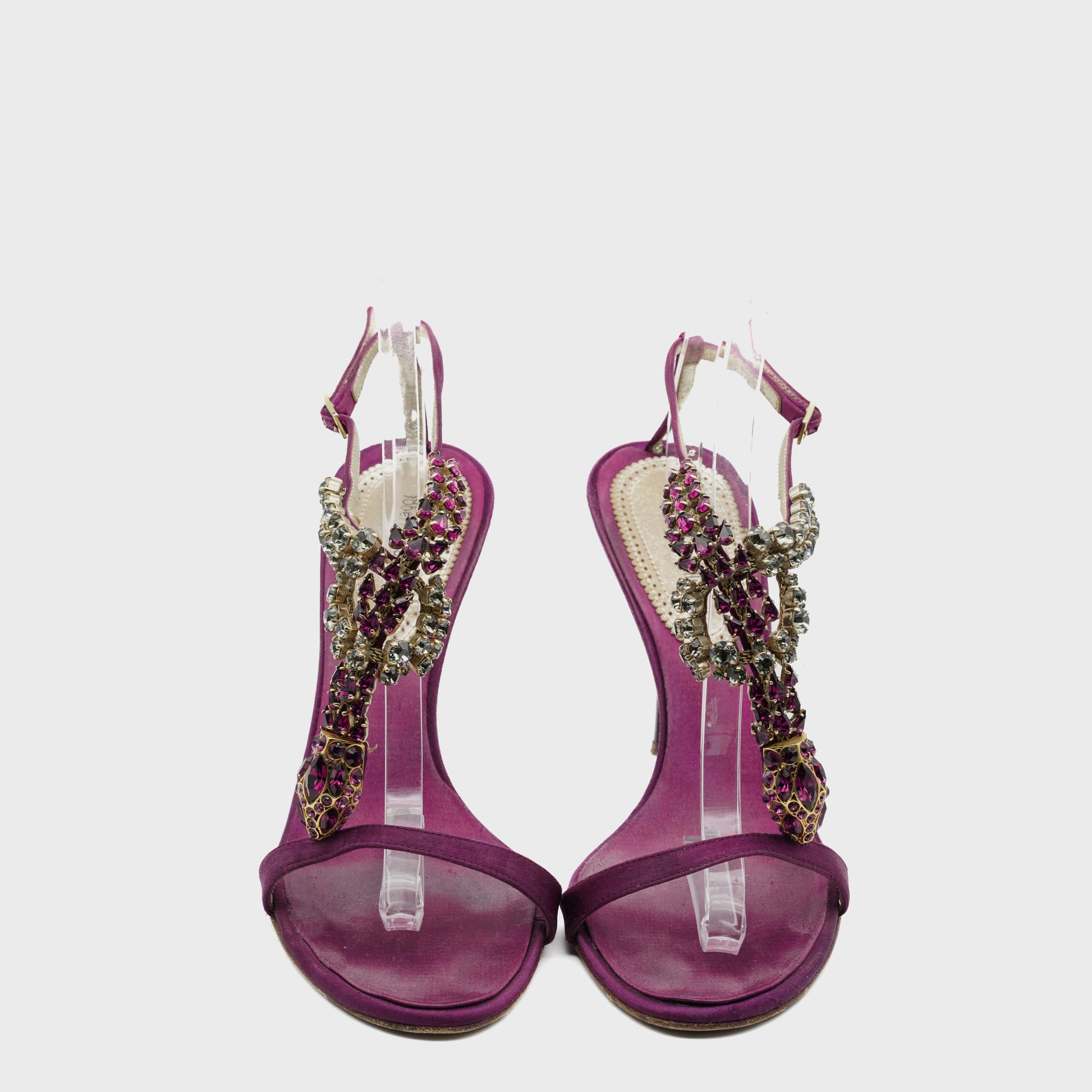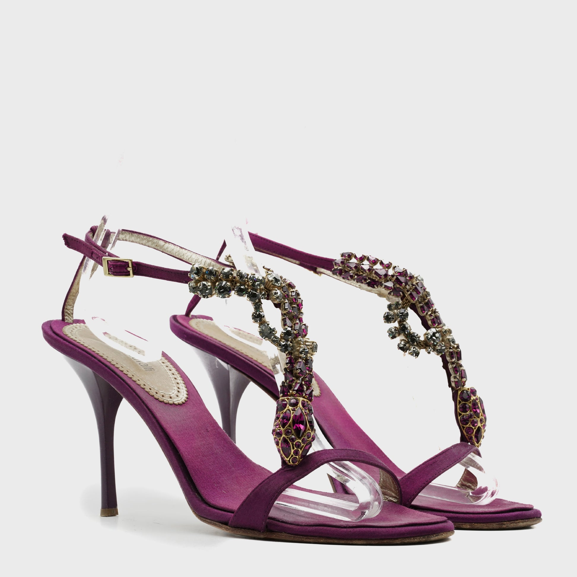 Pair of purple satin strappy sandals, adorned with a gold metal chain paved with sparkling crystals, forming a snake silhouette. 10 cm stiletto heel, offering a bold and sophisticated elegance. Genuine leather lining. These sandals embody the luxury and extravagance typical of the Cavalli house.