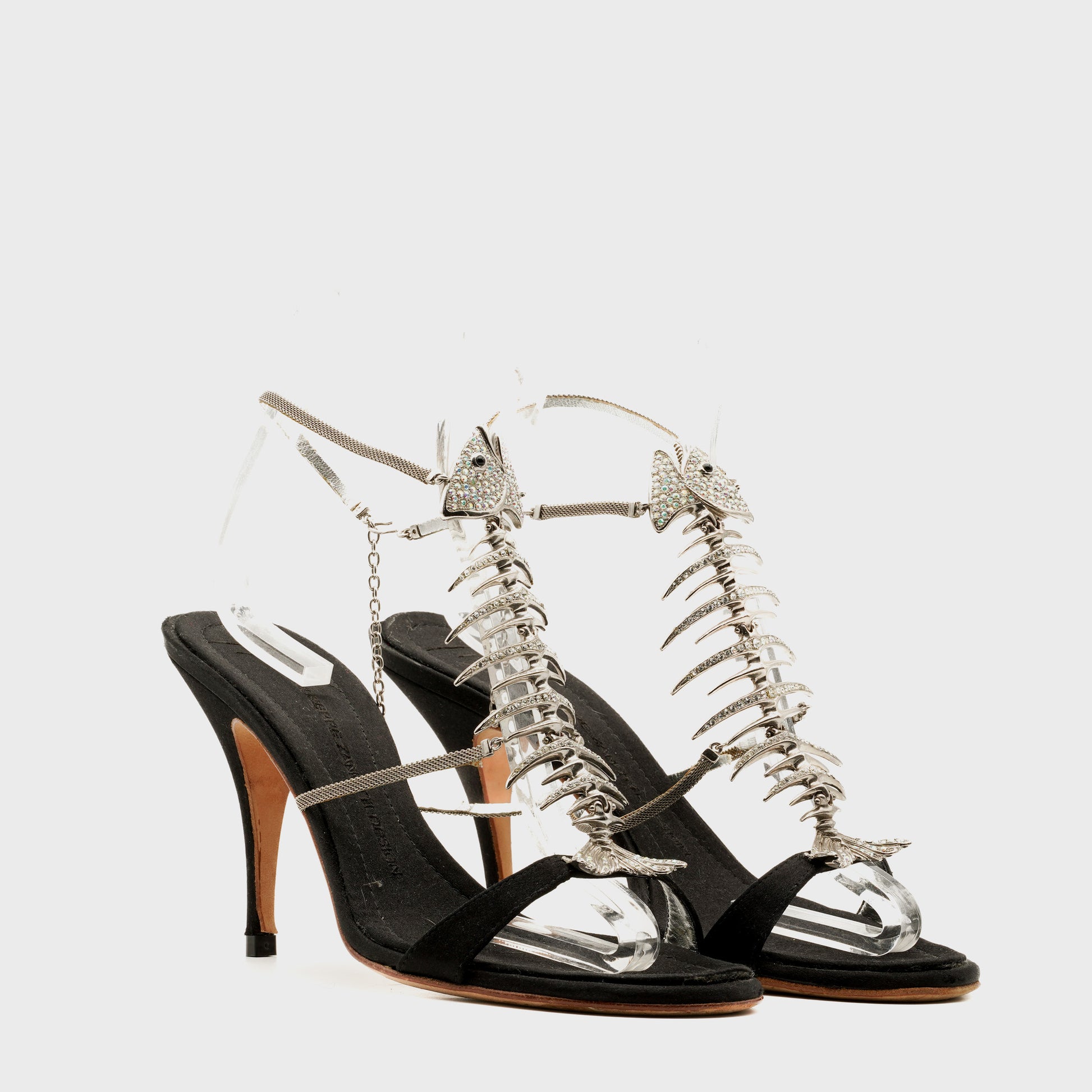 Black satin sandals , rhinestone jewelry on the front in the shape of a fishbone, adjustable ankle straps with buckle, matching stiletto heels and a leather sole.