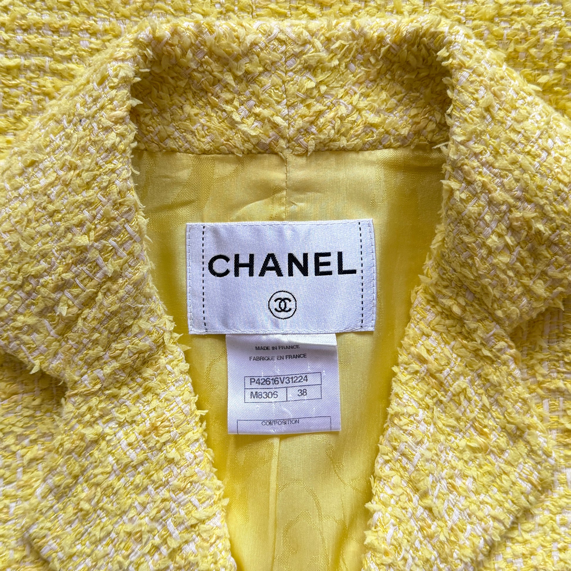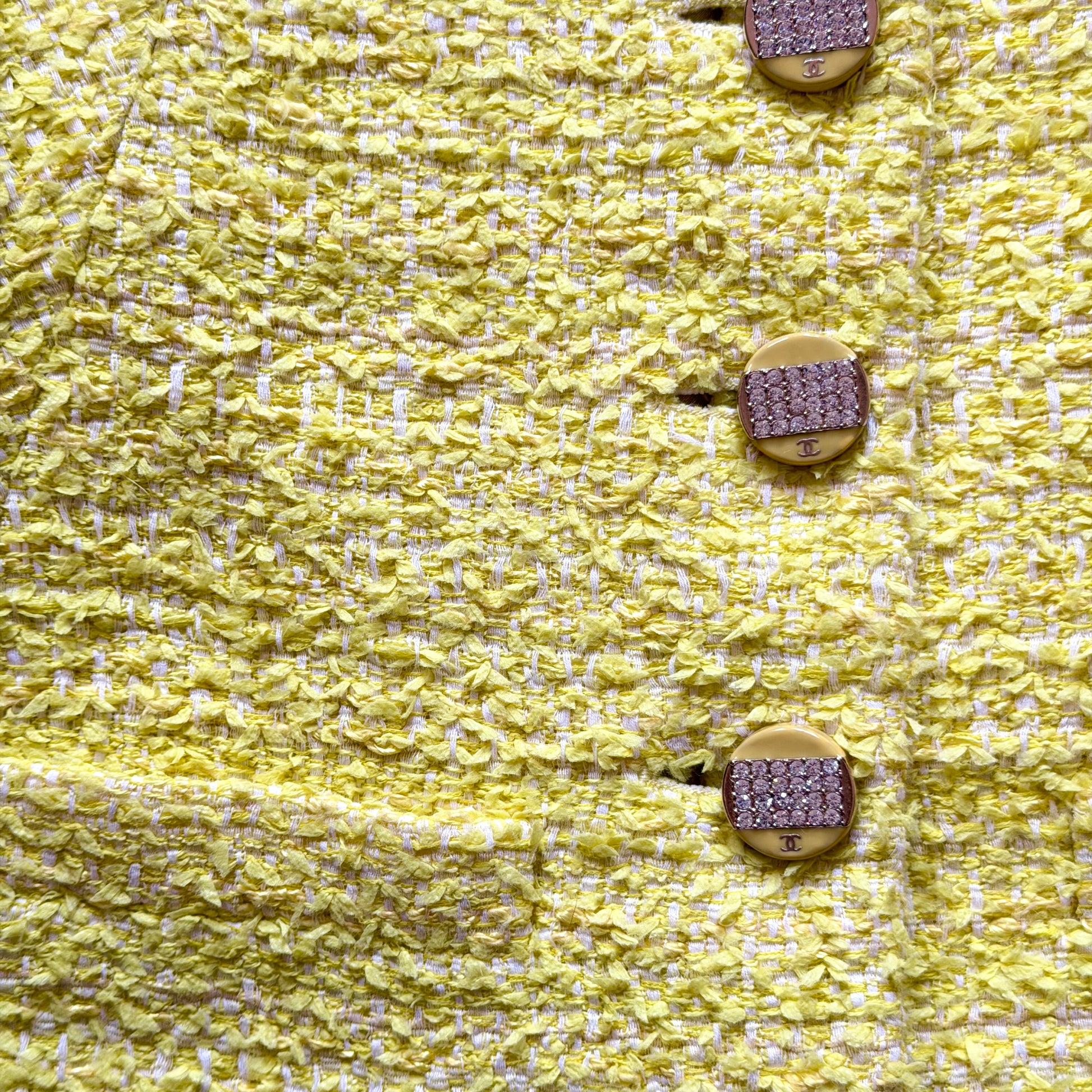 Veste courte en tweed jaune pâle, coupe ajustée à col tailleur, fermée par boutons bijou siglés sertis de strass. Une pièce lumineuse et graphique, typique du Chanel des années 2000 : fraîche, structurée, immédiatement reconnaissable.