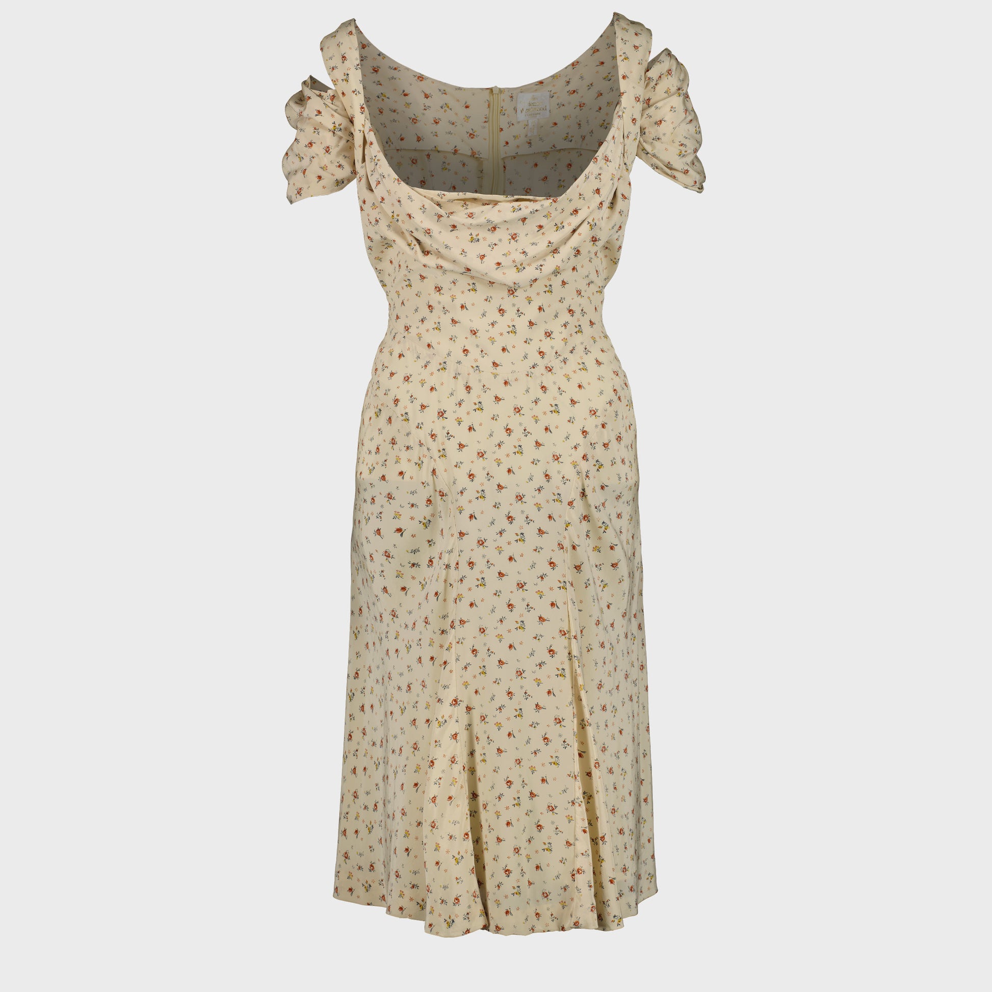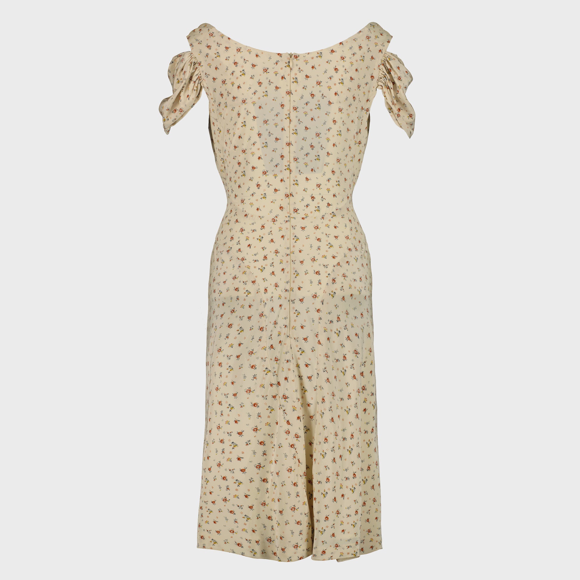 Silk liberty pattern dress, draped over the shoulders and bust held in place with buttons. Middle back zip closure
