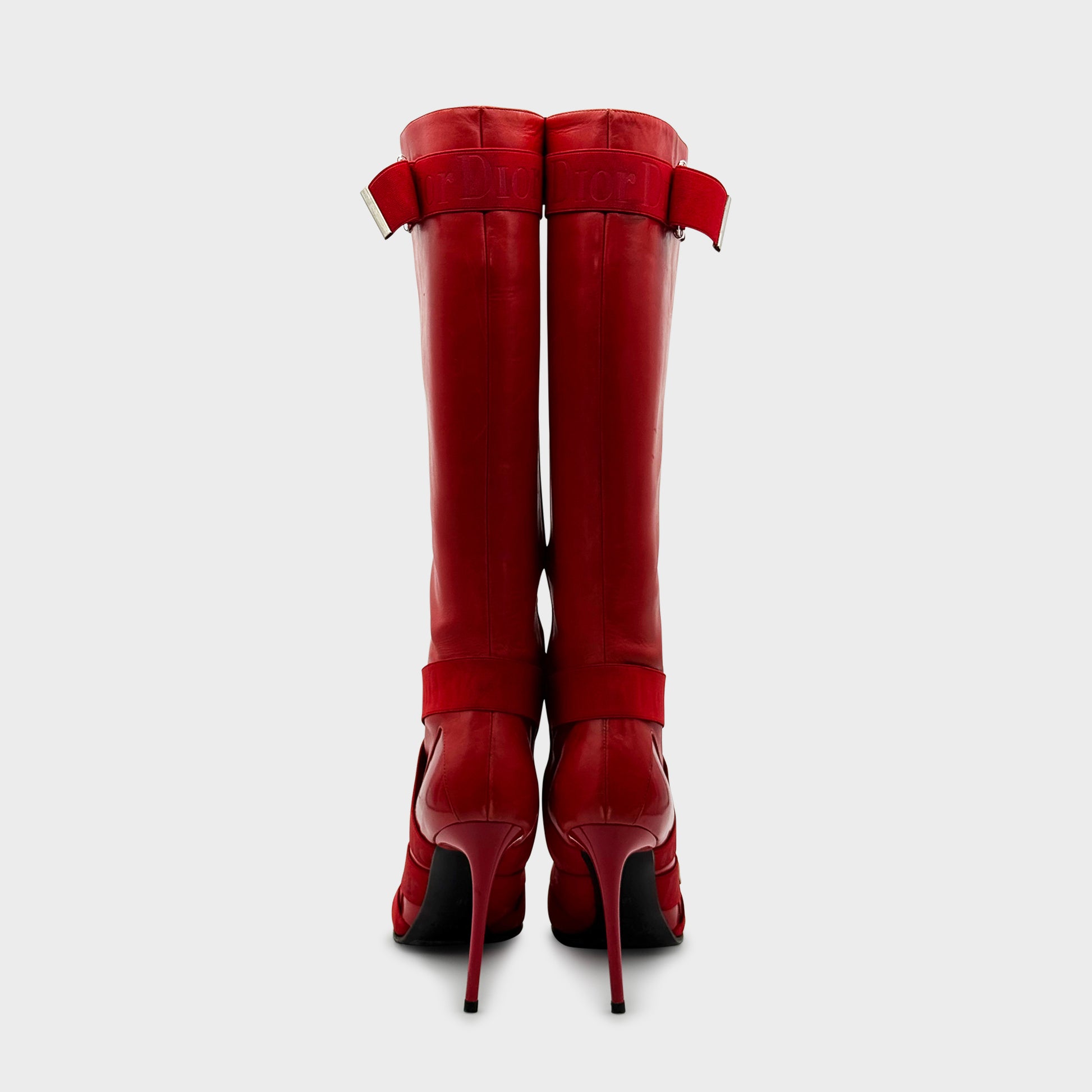 Bottes hautes en cuir lisse rouge cerise, à bout pointu et talon aiguille. La silhouette est cintrée de brides élastiques croisées, rehaussées de boucles métalliques argentées gravées Dior. Trois bandes siglées encerclent la cheville, le cou-de-pied et le haut de la tige, dans un esprit bondage fétichiste très Galliano.
