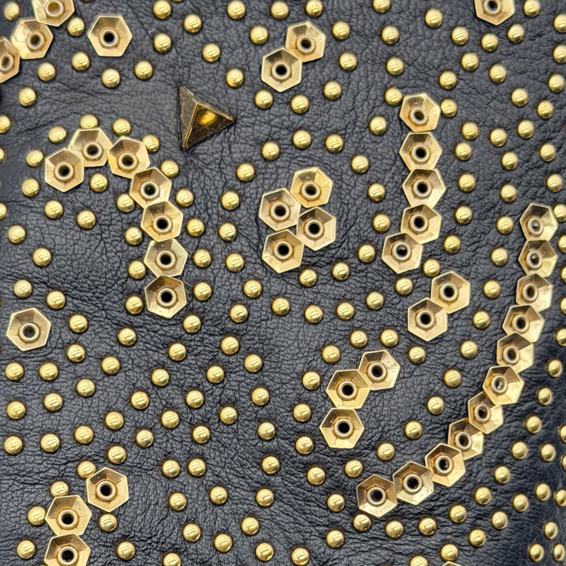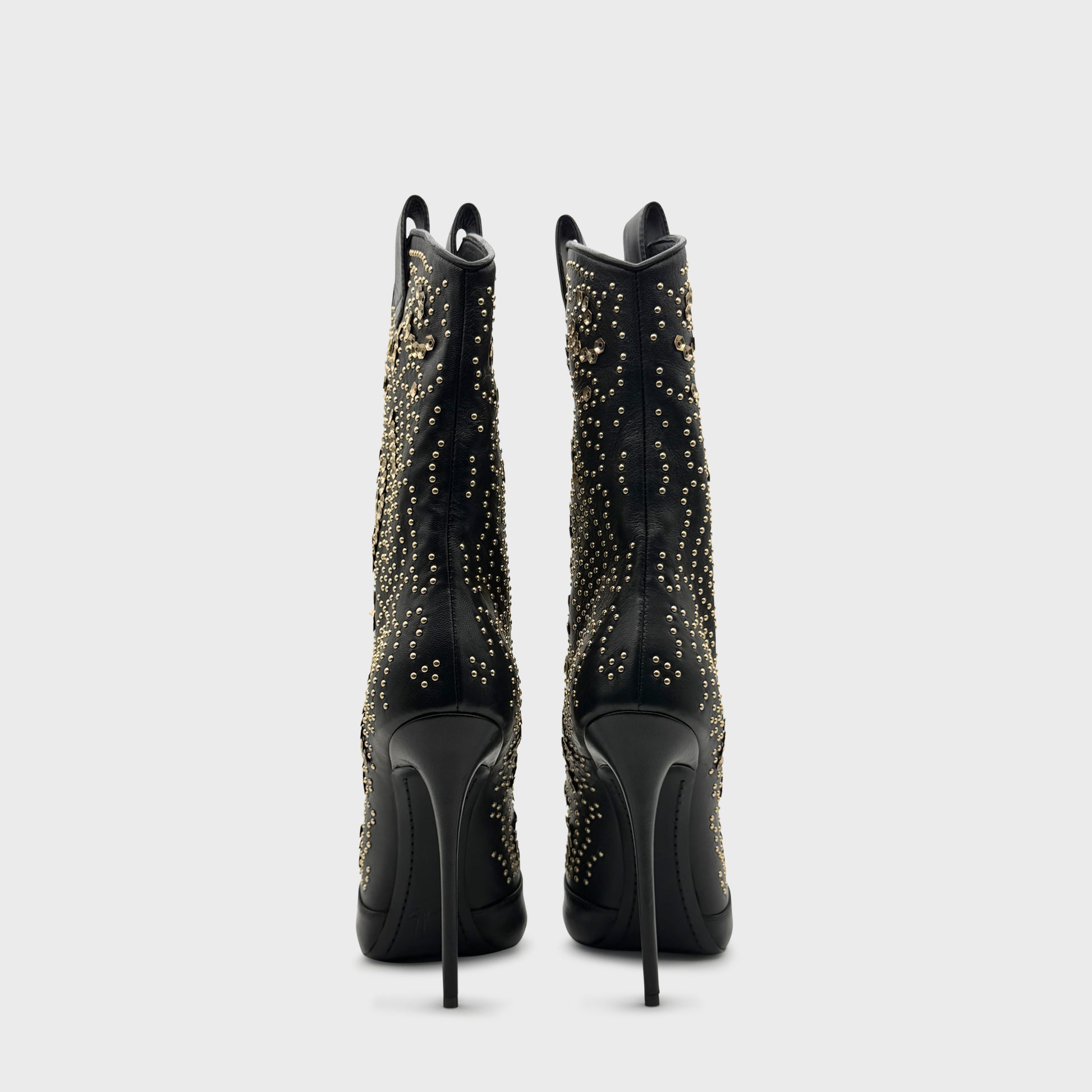 Bottes courtes à talons aiguilles en cuir noir, entièrement brodées de clous dorés. Silhouette peep-toe avec plateforme intégrée et découpes façon santiag. Lignes galbées et décor baroque, entre western futuriste et punk d’apparat.