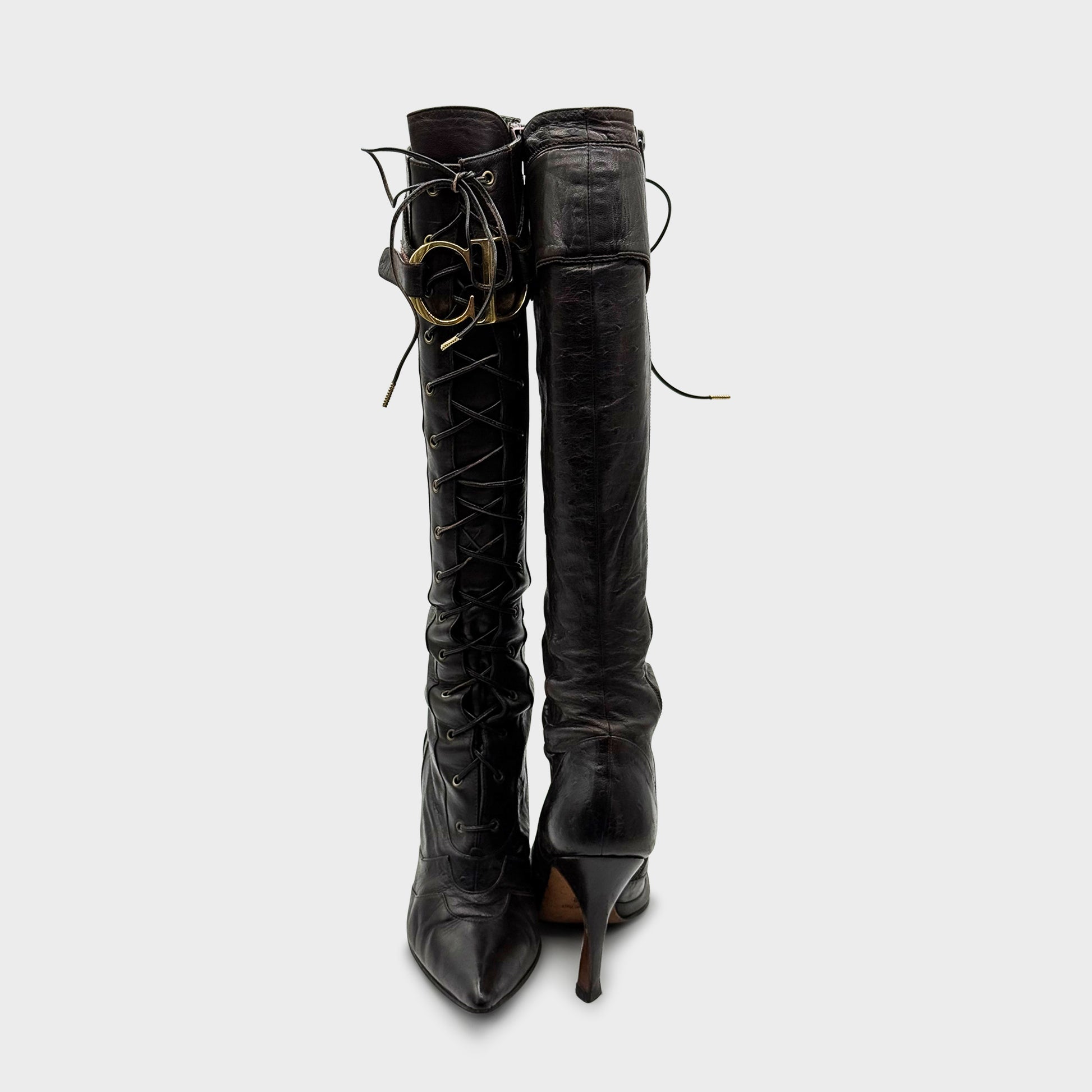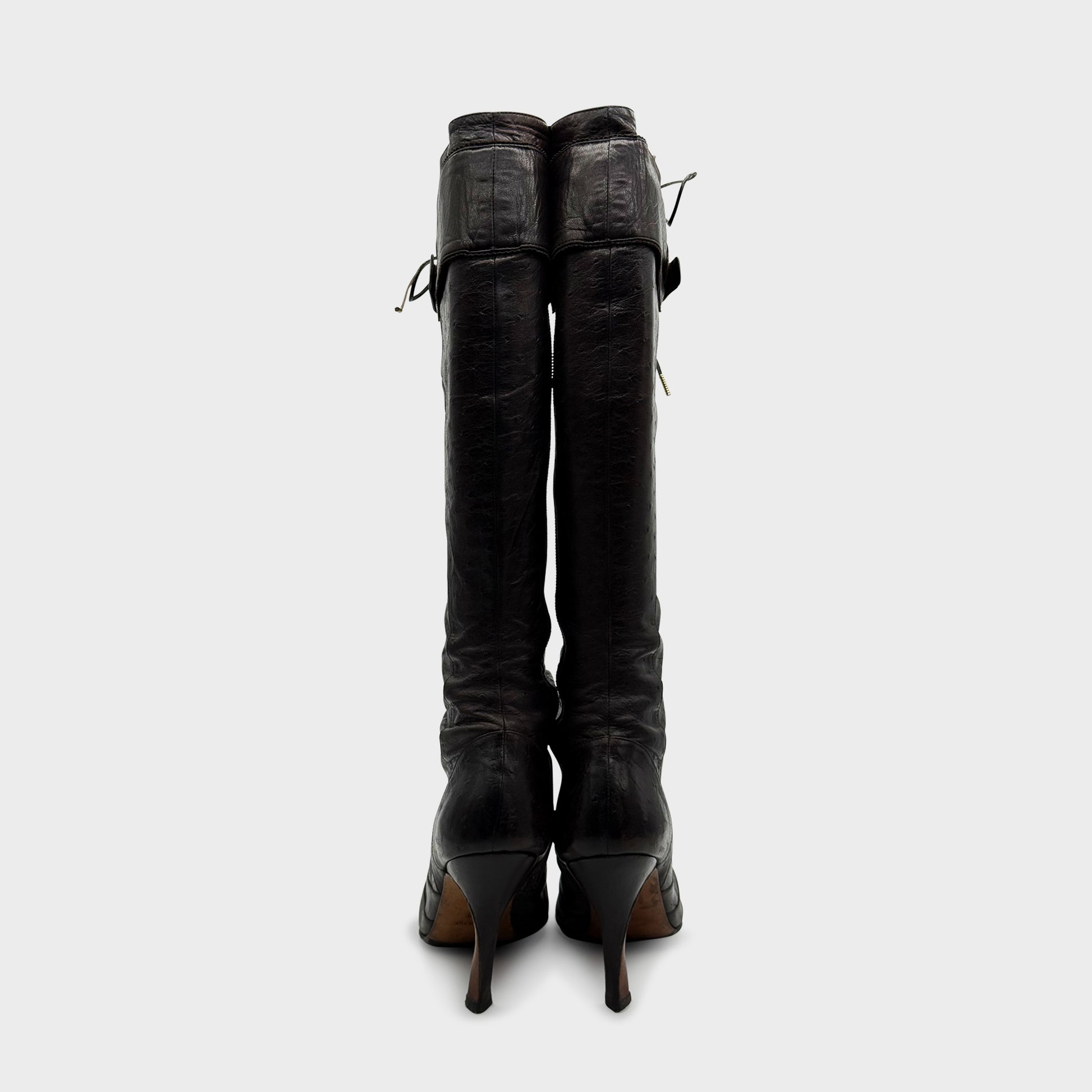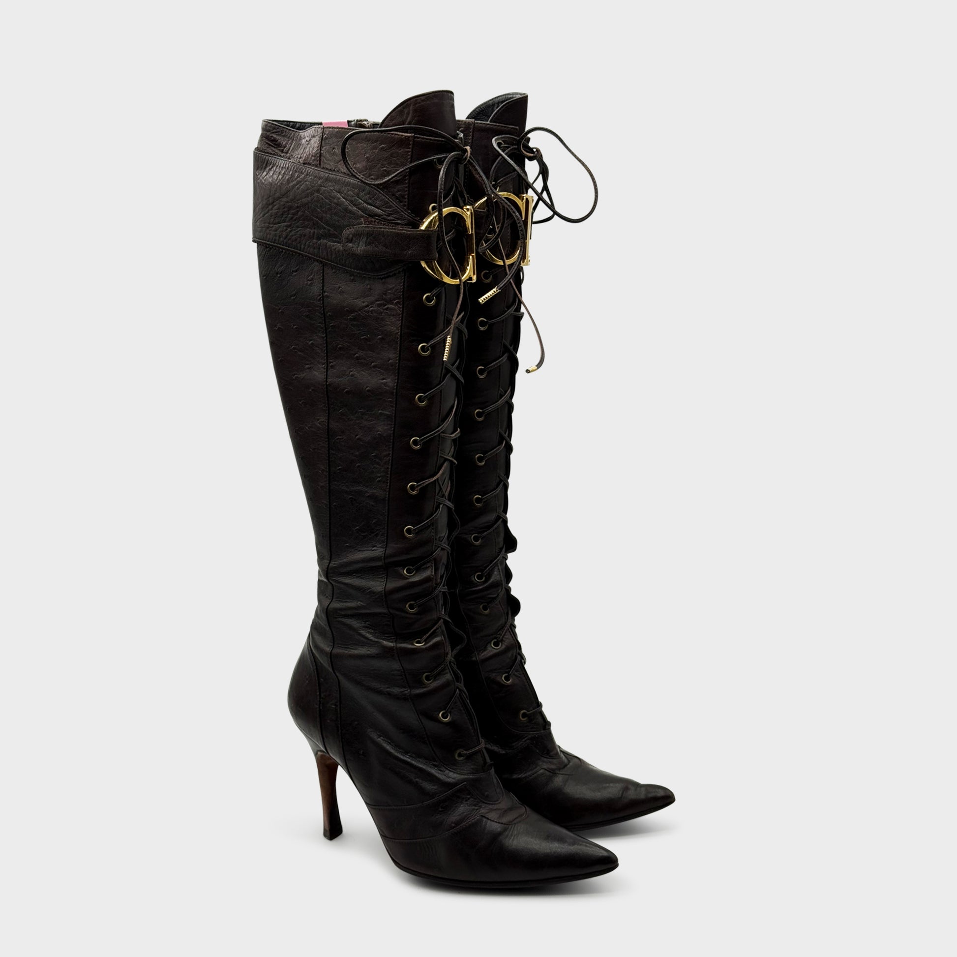 Bottes hautes à lacets en cuir d’autruche brun foncé, silhouette victorienne allongée sur talon aiguille. Fermeture zippée intérieure et détail ceinturé orné de l’emblématique boucle CD en laiton doré à la naissance du genou. Bout pointu, tige galbée, couture arrondie au cou-de-pied — une pièce équine, sensuelle, strictement Dior.