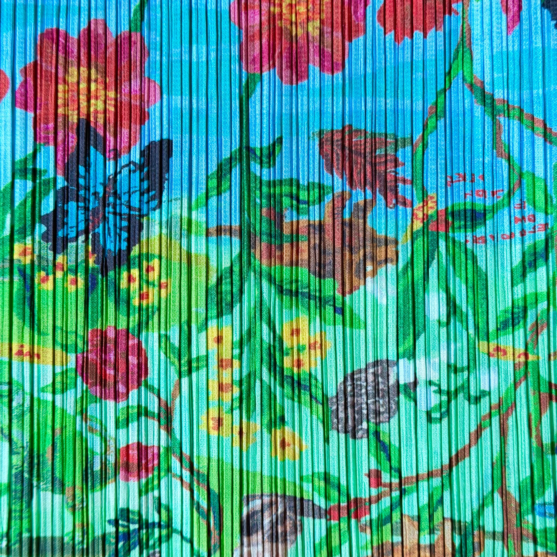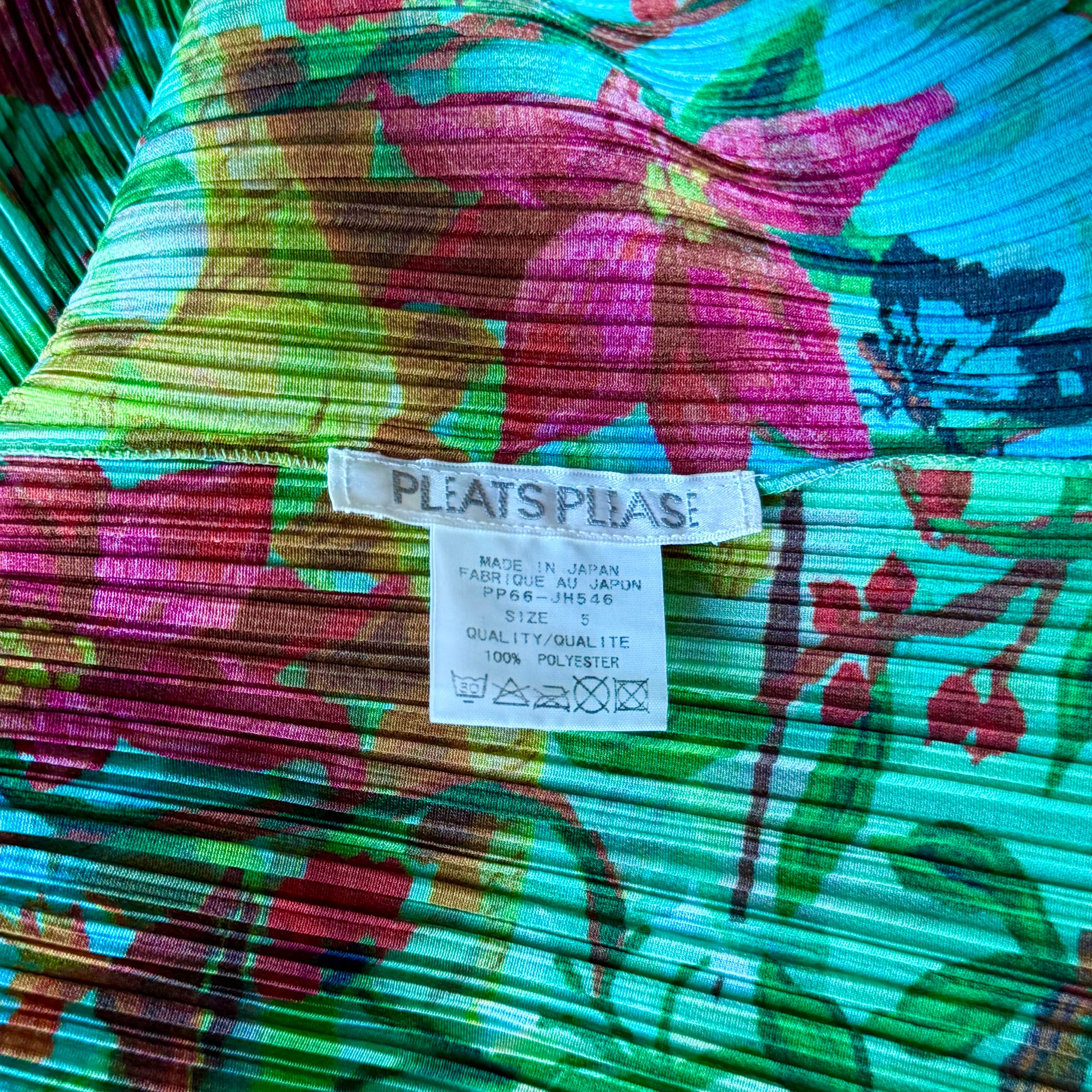 Top plissé sans manches à col montant, imprimé floral et animalier multicolore sur fond turquoise. Motif illustratif signature Nathalie Lété, appliqué sur la matière plissée iconique d’Issey Miyake.