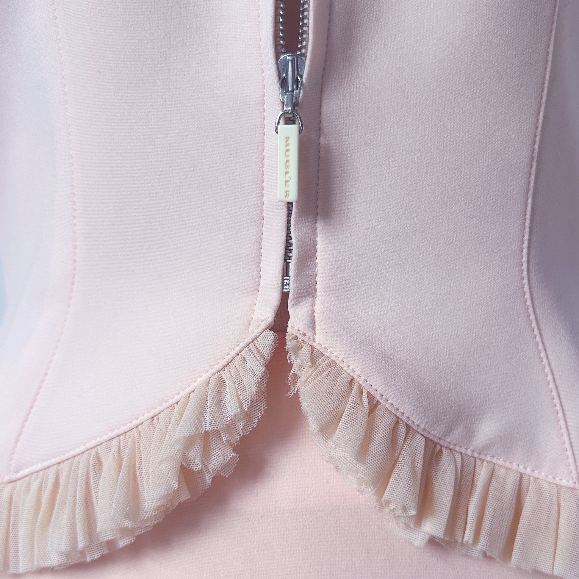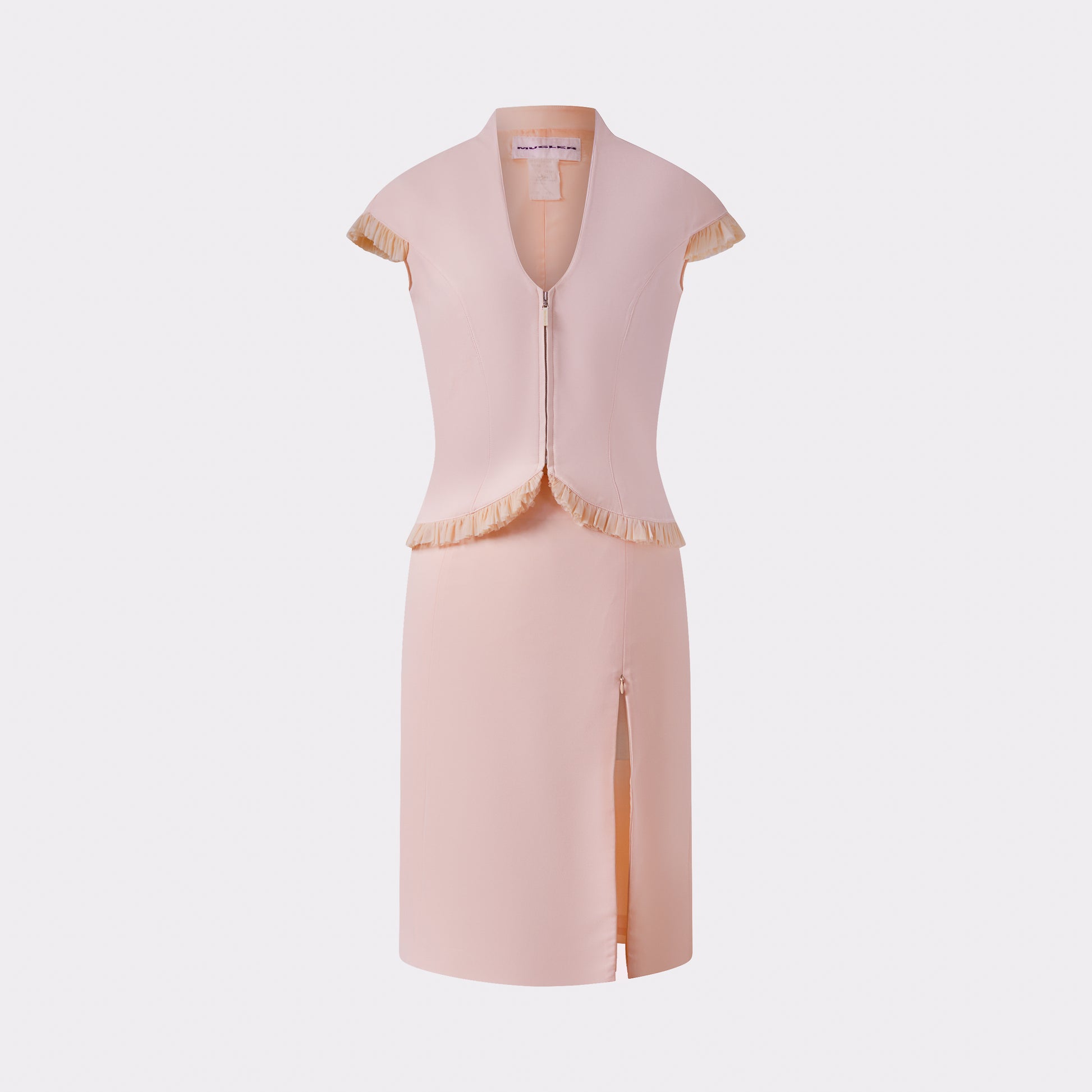 Ensemble deux pièces en crêpe rose poudré, composé d’un top zippé à basque courte et d’une jupe taille haute fendue. Finitions en tulle plissé vanille aux manches, à la taille et au bas du top, évoquant les froufrous de lingerie rétro. Ligne architecturée, galbe du buste marqué, zip central à tirette siglée. Une silhouette à la fois ultra féminine et affûtée, typique de l’ère Mugler.