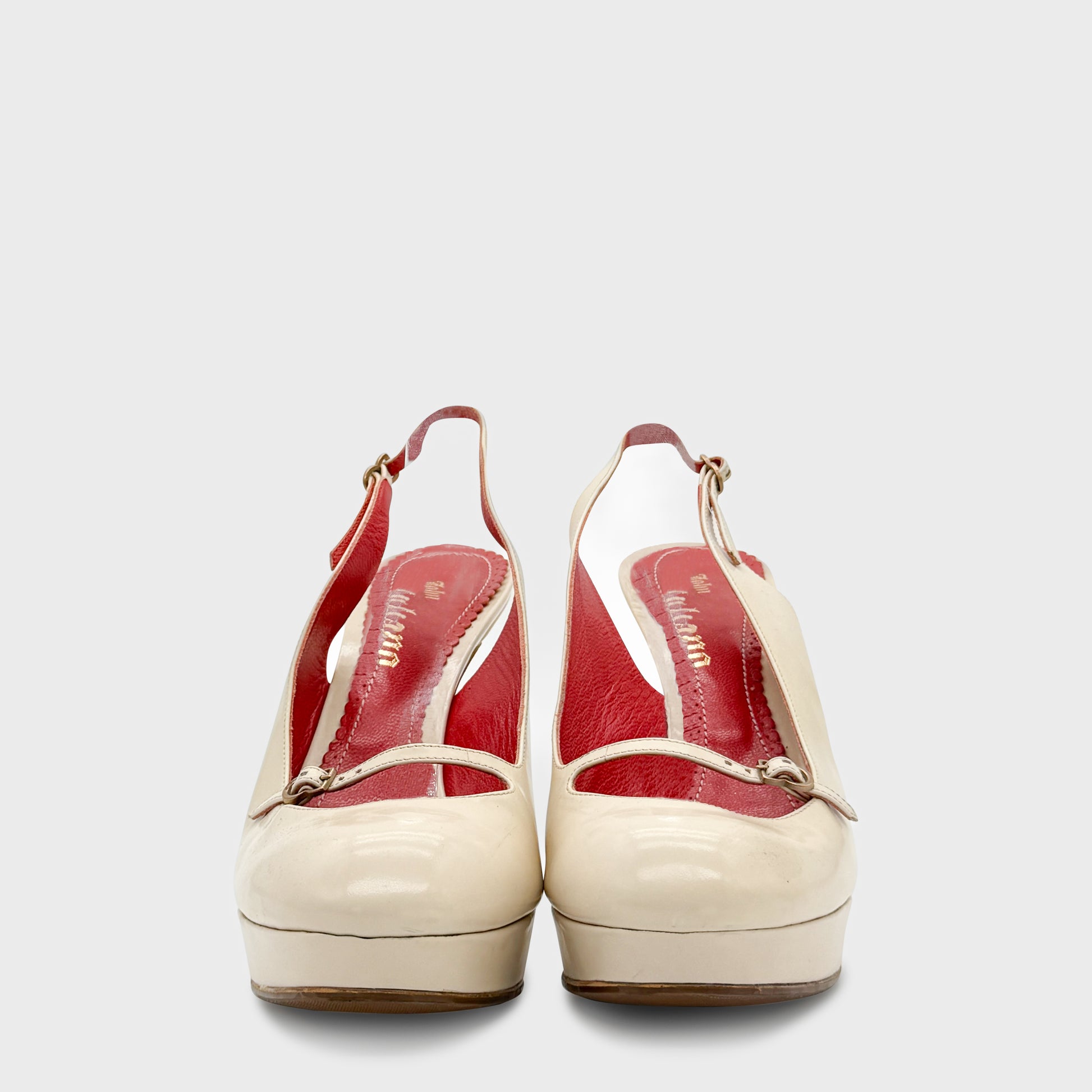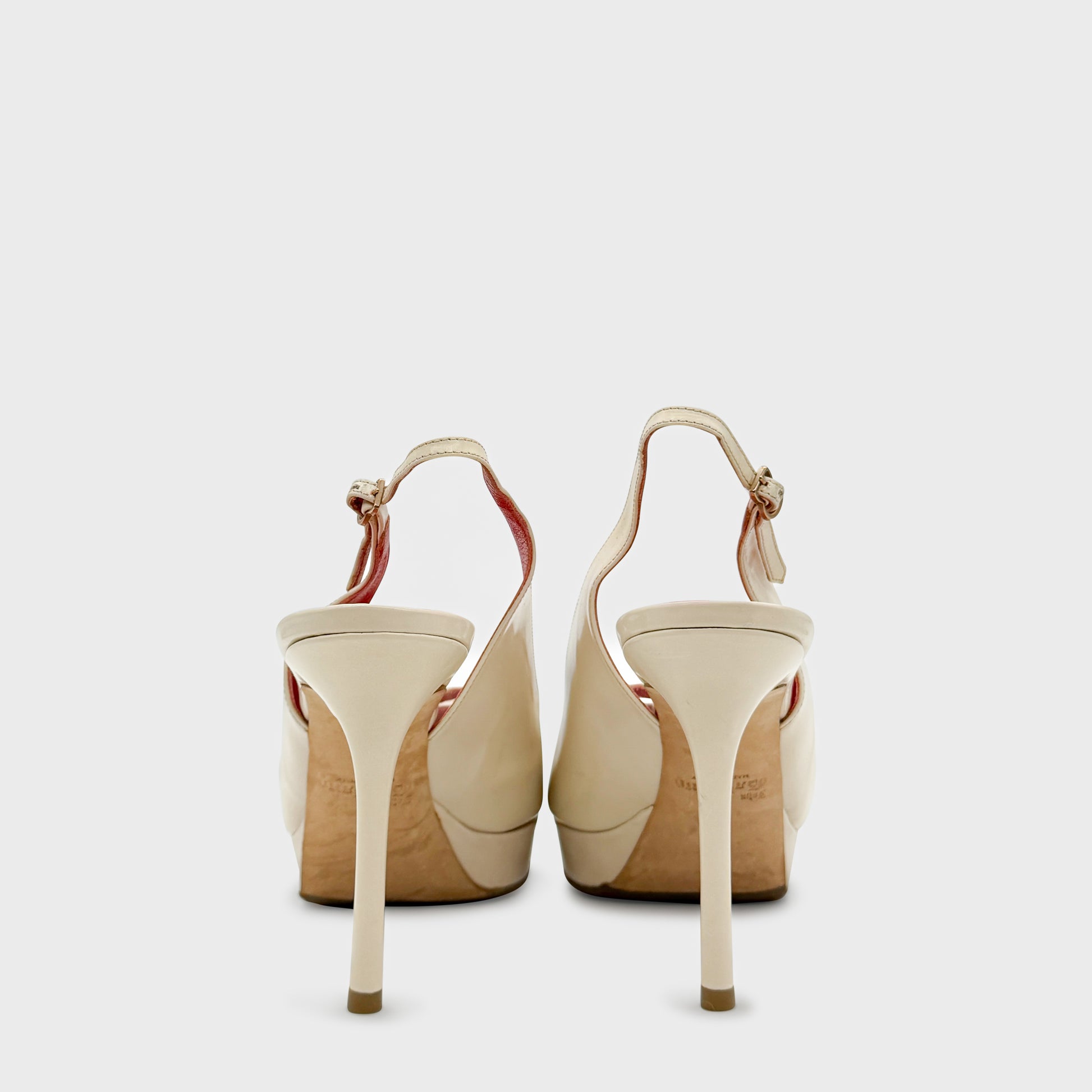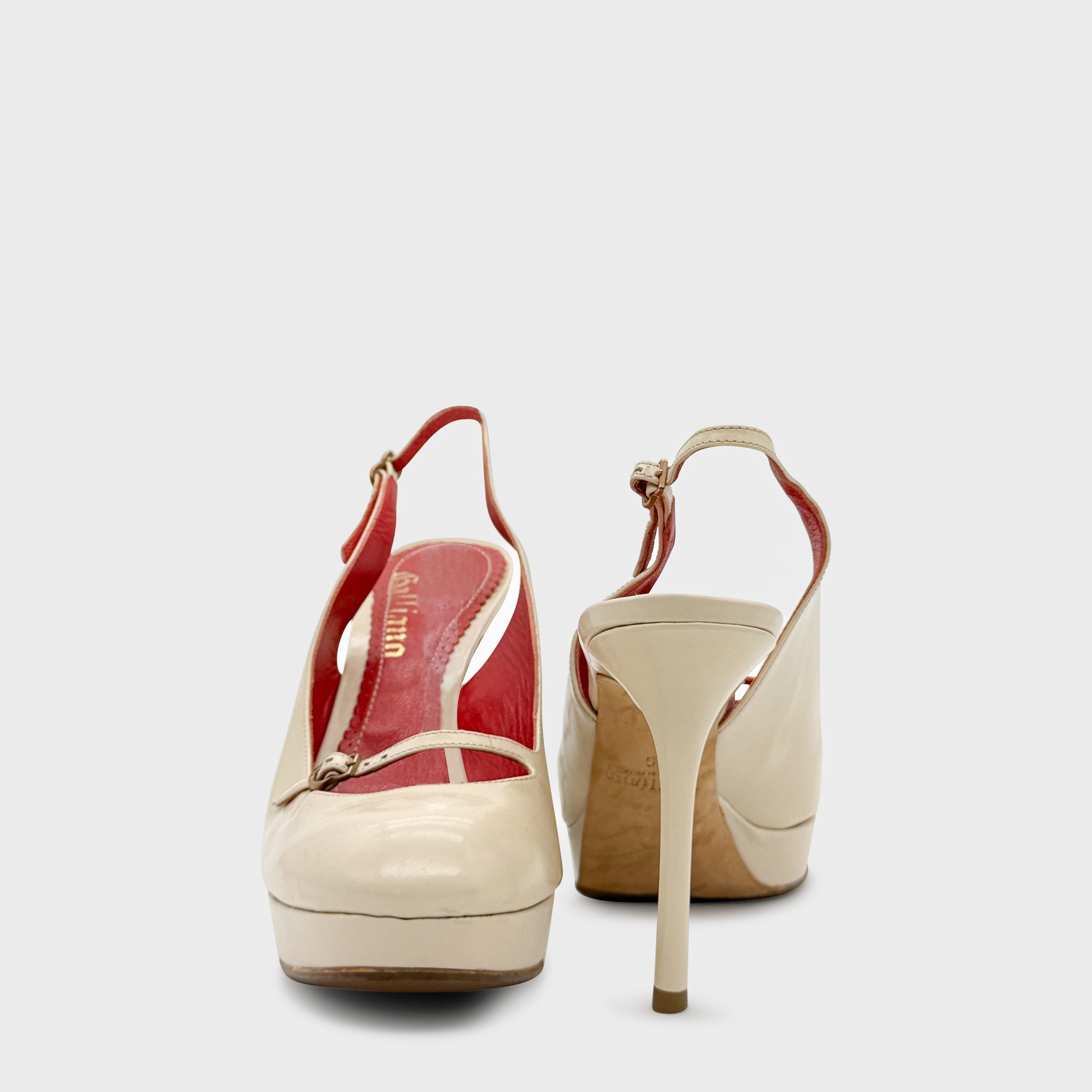 Escarpins slingback à plateforme en cuir verni ivoire, doublure rouge contrastée, bride fine sur le cou-de-pied et talon aiguille élancé. Une silhouette sensuelle et graphique, typique du Galliano post-Dior : féminité assumée, lignes nettes et détail couture qui capte l’œil sans en faire trop.