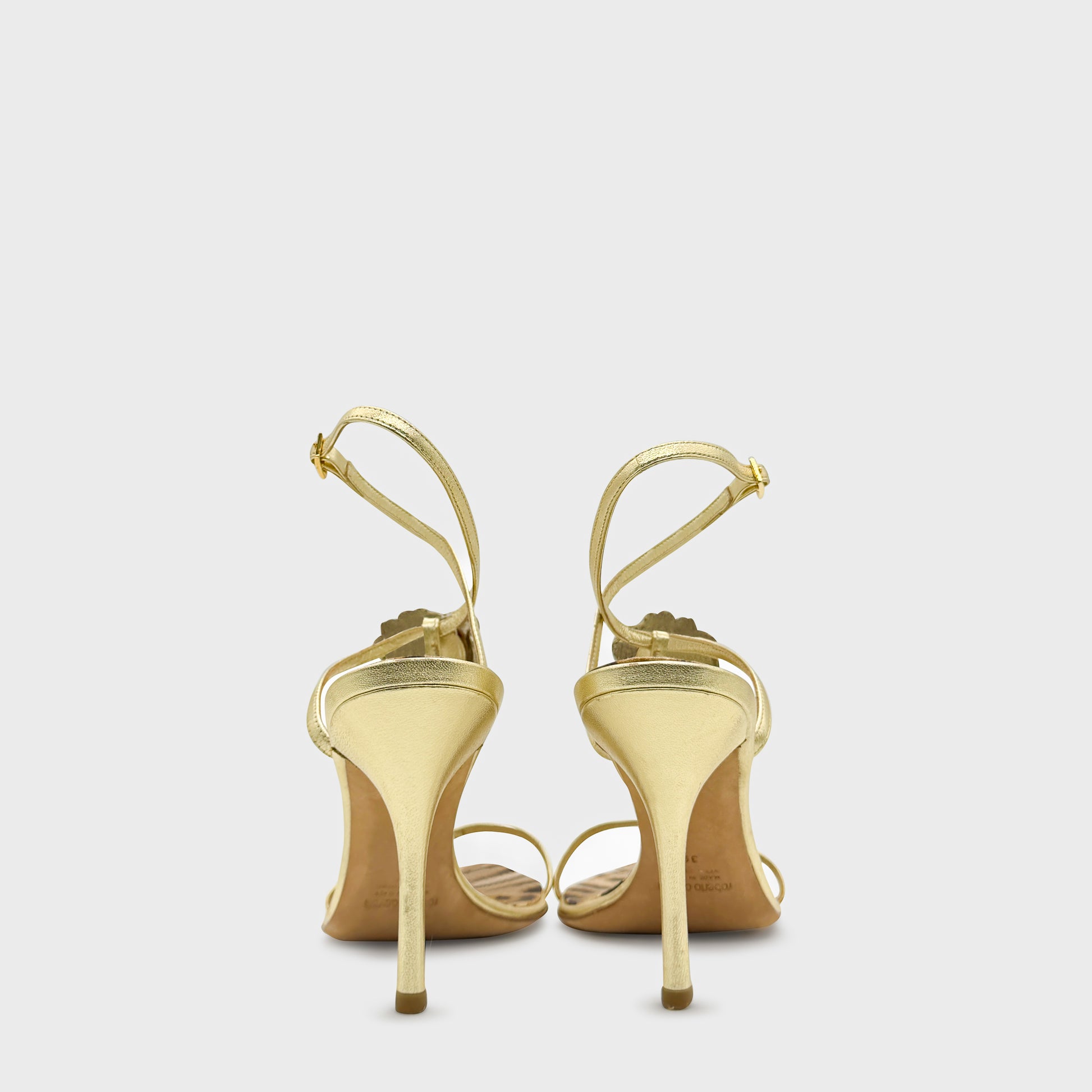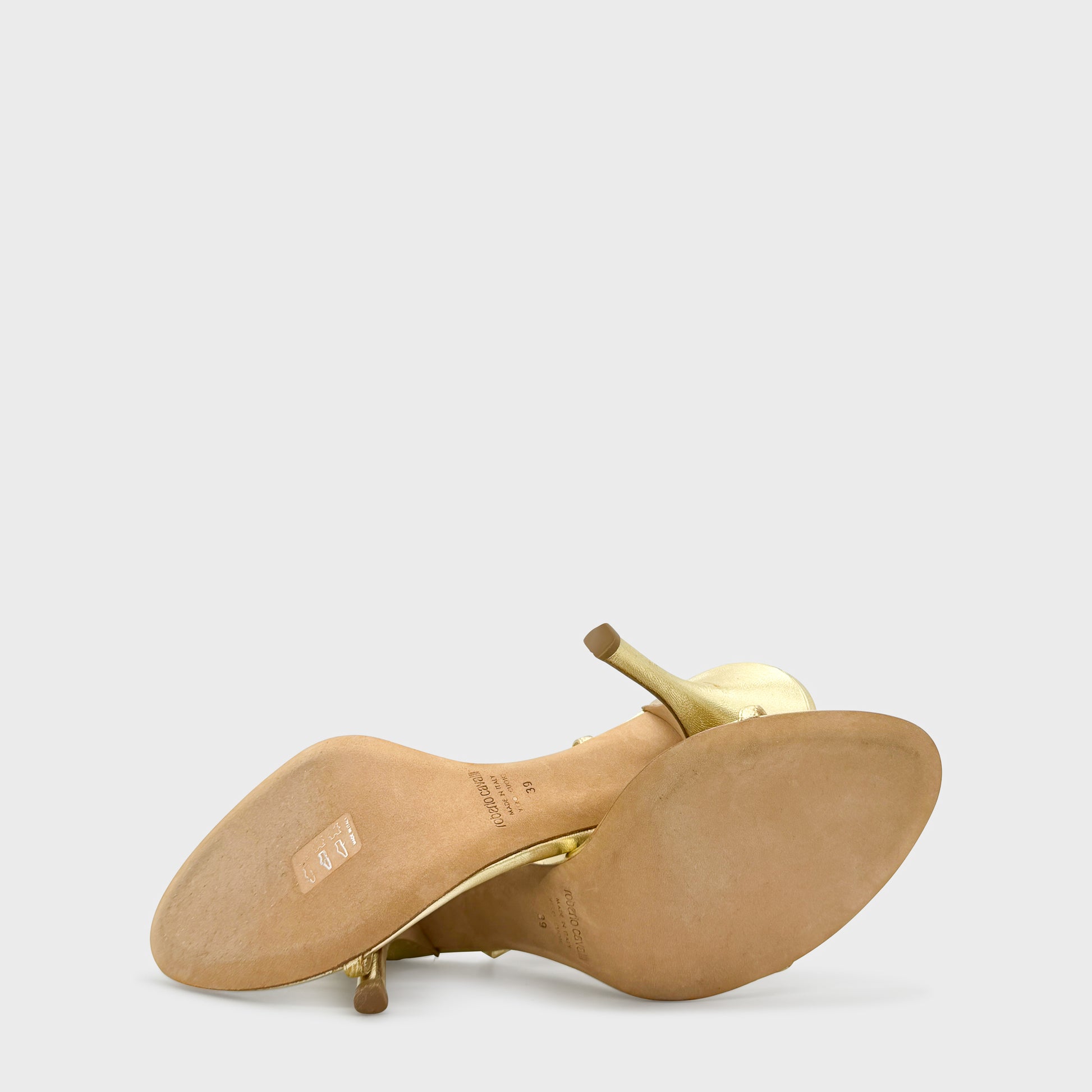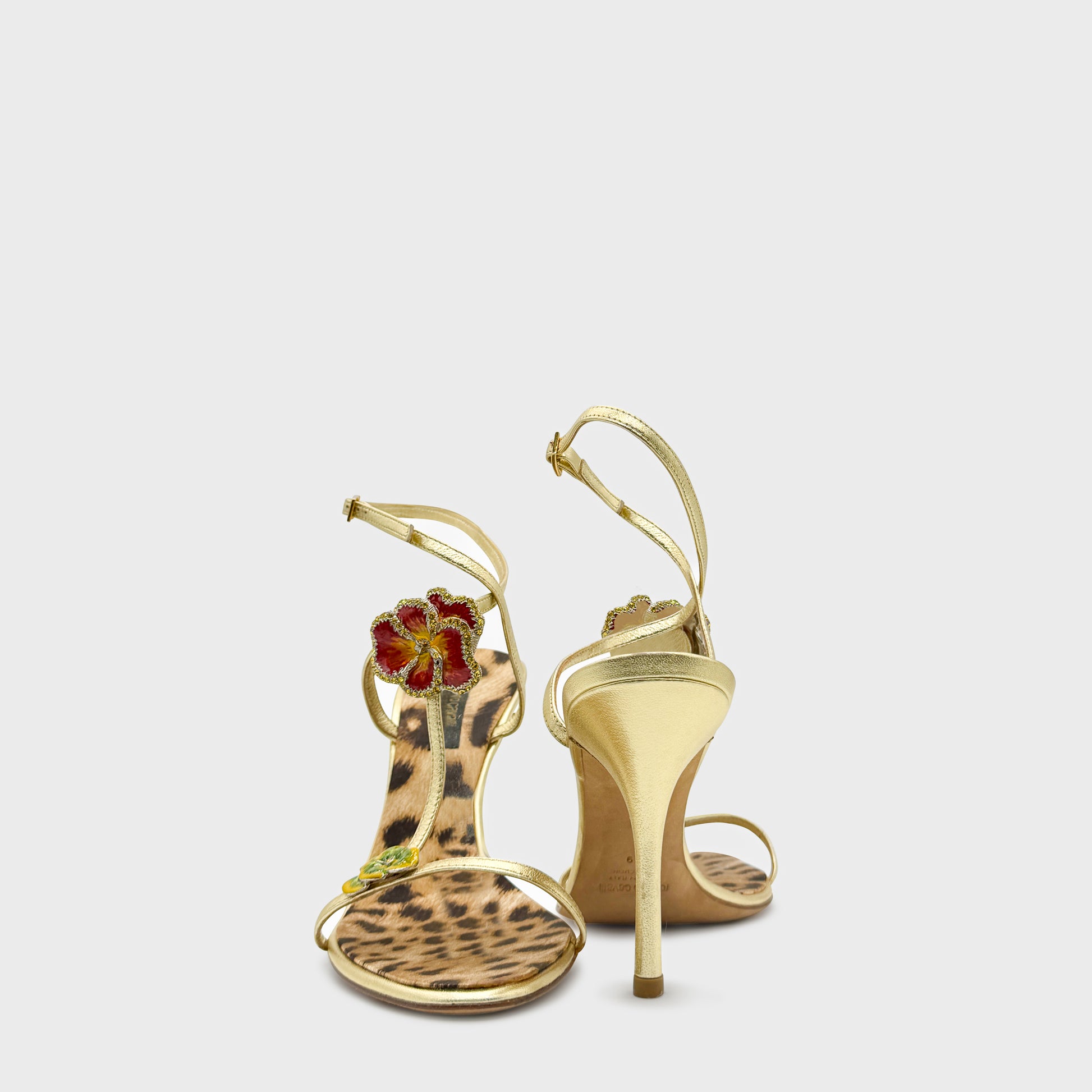 Sandales à brides fines en cuir métallisé or, semelle à imprimé léopard et talon aiguille. Application florale brodée et perlée sur le cou-de-pied, signature glamour et sensuelle propre à l’esthétique Cavalli du début des années 2000.