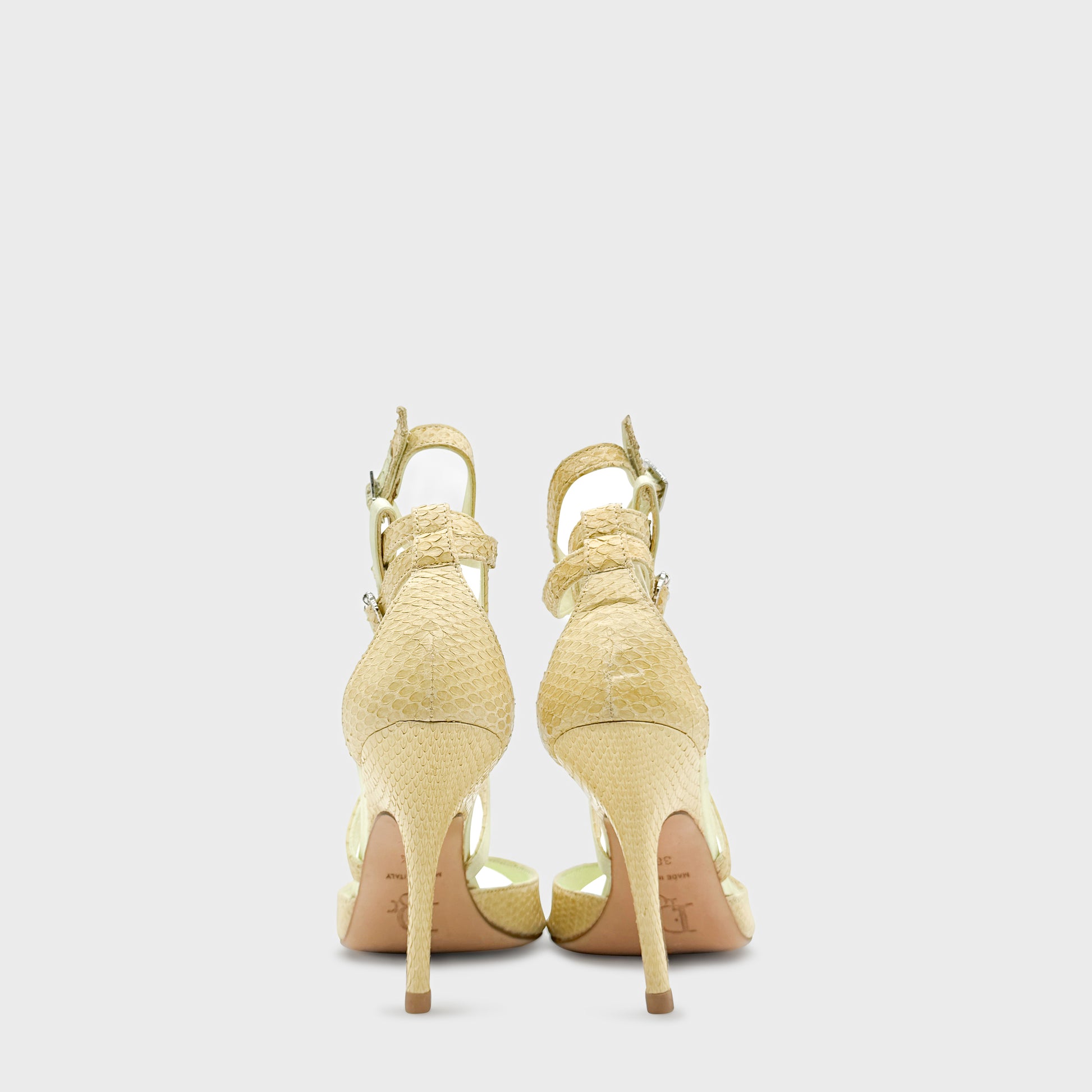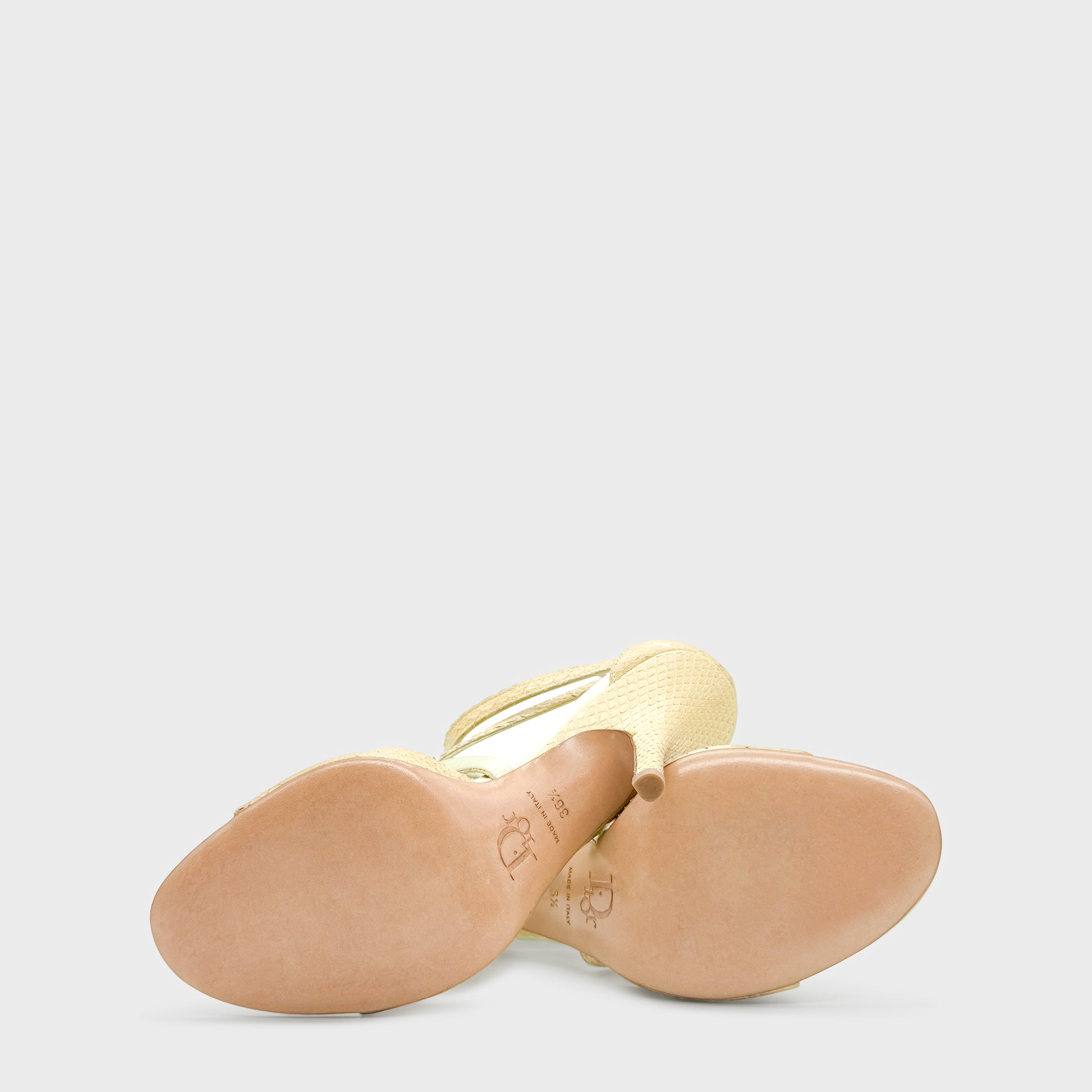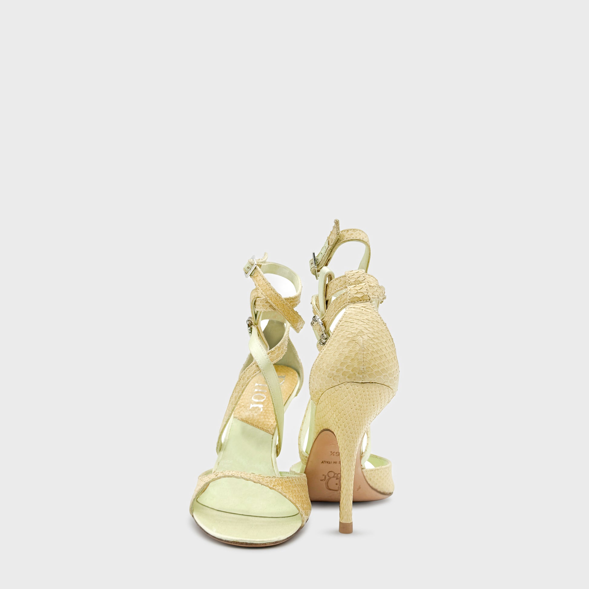 Sandales à talon aiguille en python beige et satin ivoire. Construction à brides fines croisées, fermées par de petites boucles métalliques, dessinant une silhouette élancée et sensuelle. Bout ouvert, talon haut et ligne délicate, dans un esprit à la fois précieux et fétichiste, signature du Dior Galliano des années 2000.