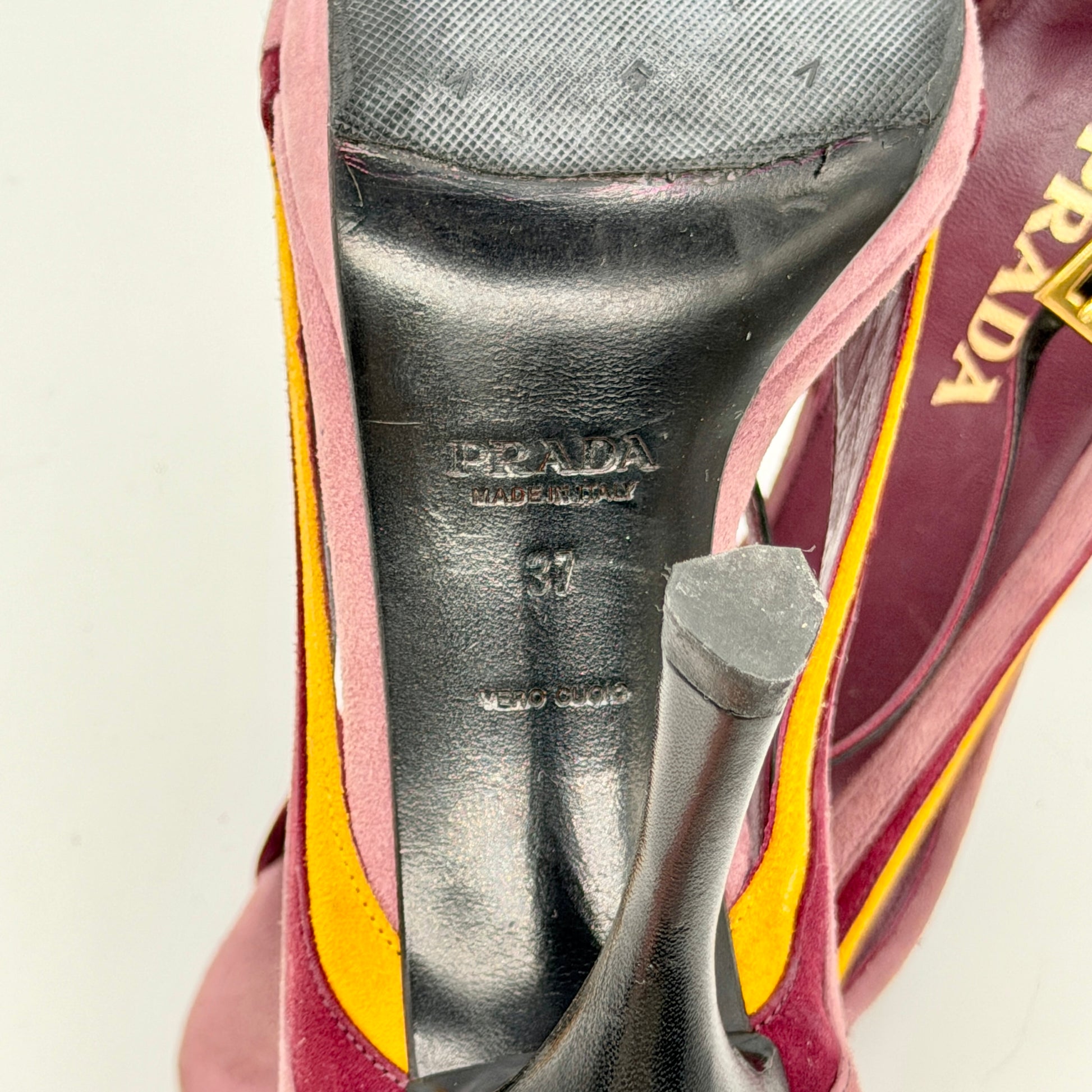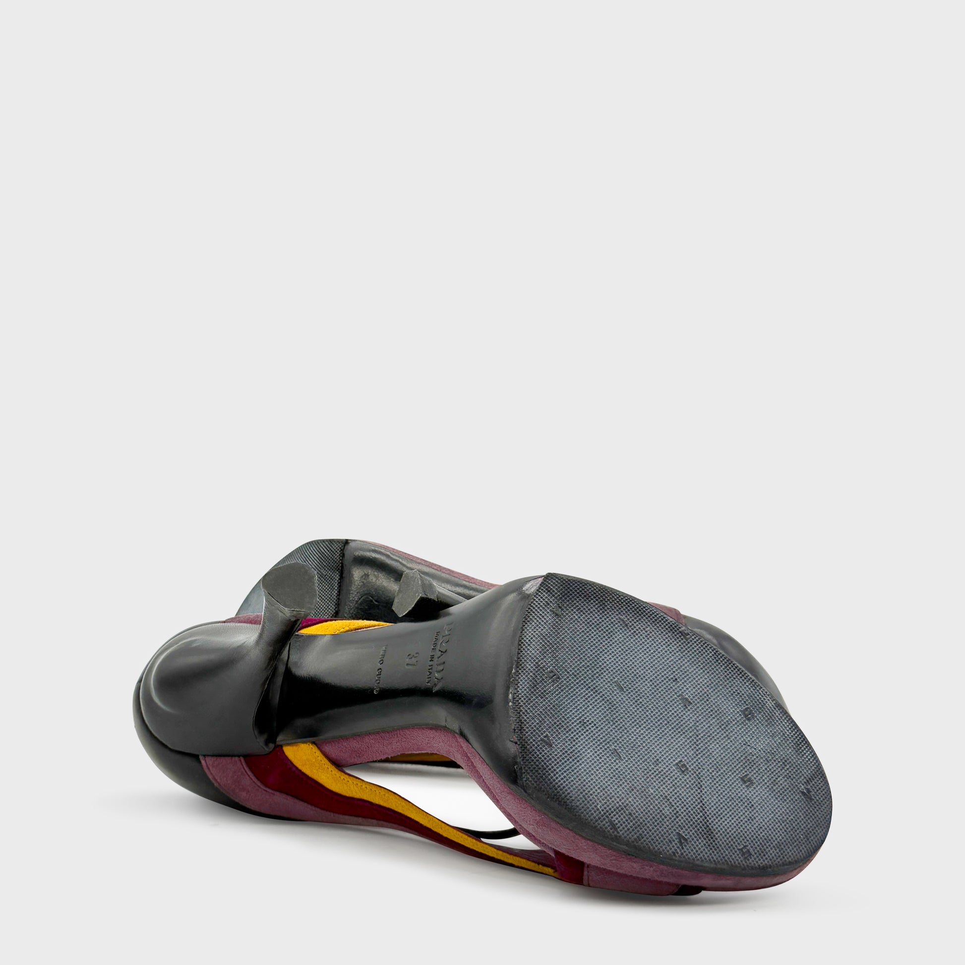 Sandales à plateforme et talon aiguille, en cuir et suède dans des tons prune, bordeaux et jaune moutarde. Construction graphique à empiècements ondulés, soulignée par des brides croisées sur le cou-de-pied. Silhouette rétro-futuriste, typique du Prada de la fin des années 2000, où la couleur et la forme deviennent langage.