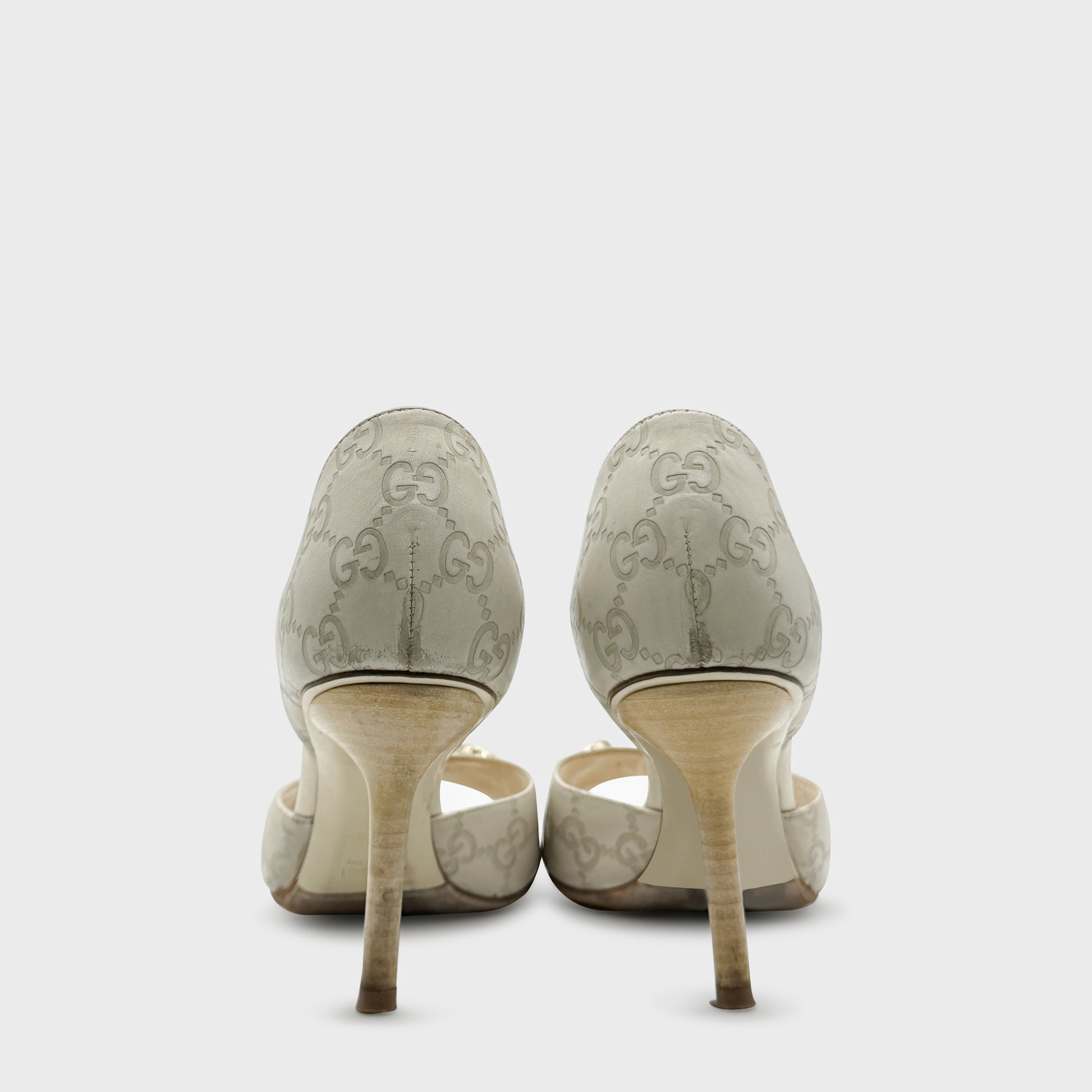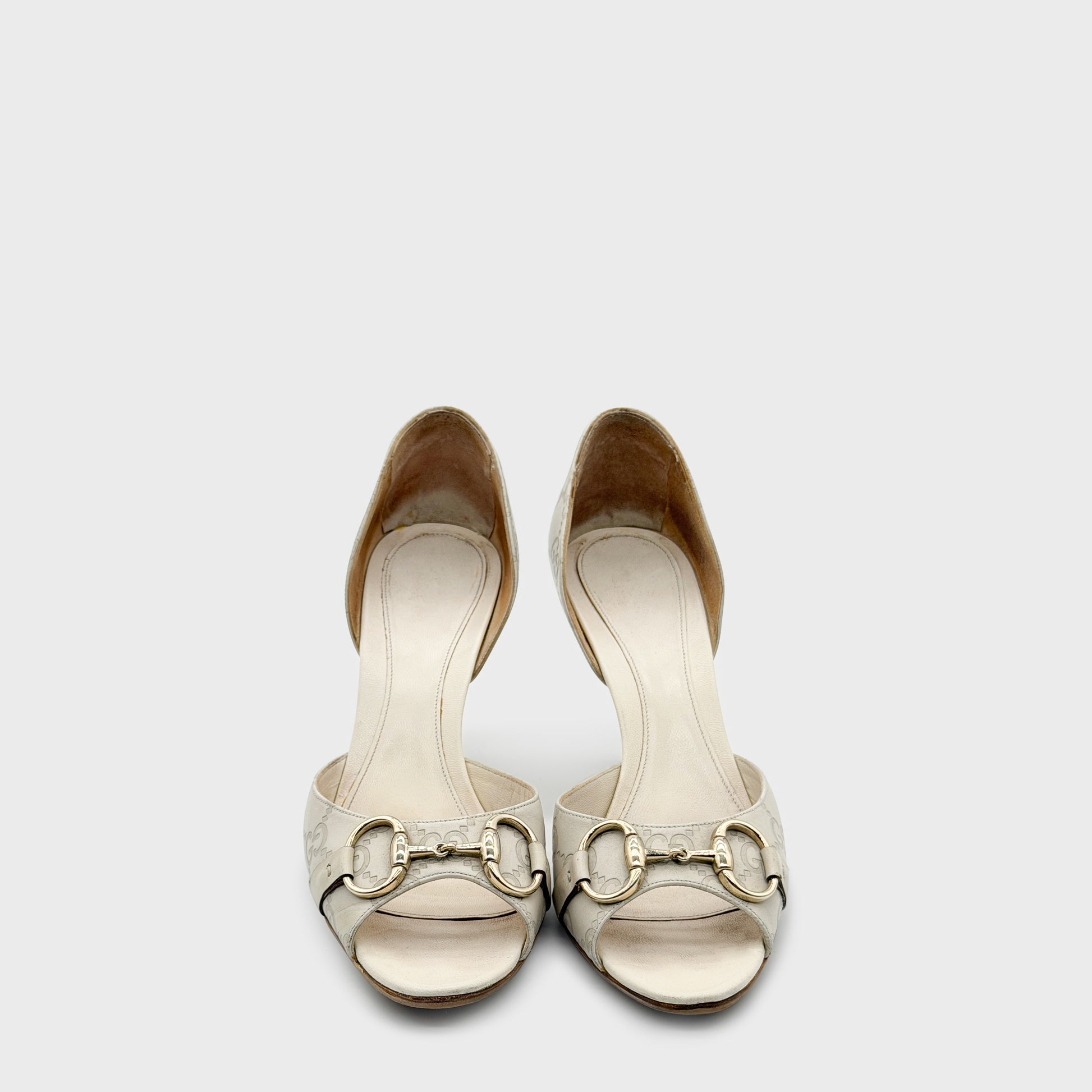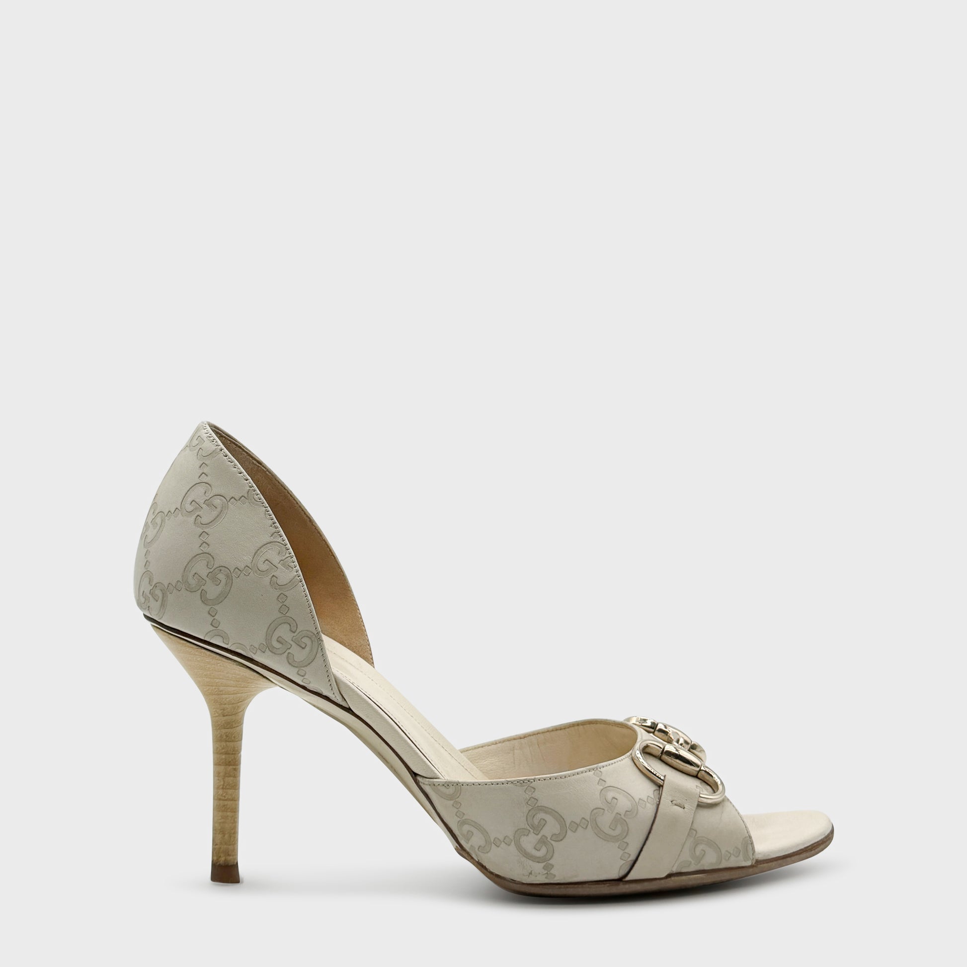 Escarpins ouverts à bout arrondi et talon aiguille, réalisés en toile GG beige et cuir ton sur ton. Bride avant ornée du mors Horsebit en métal argenté, signature emblématique de la maison. Silhouette élégante, ligne classique et allure immédiatement reconnaissable, entre héritage équestre et chic italien.