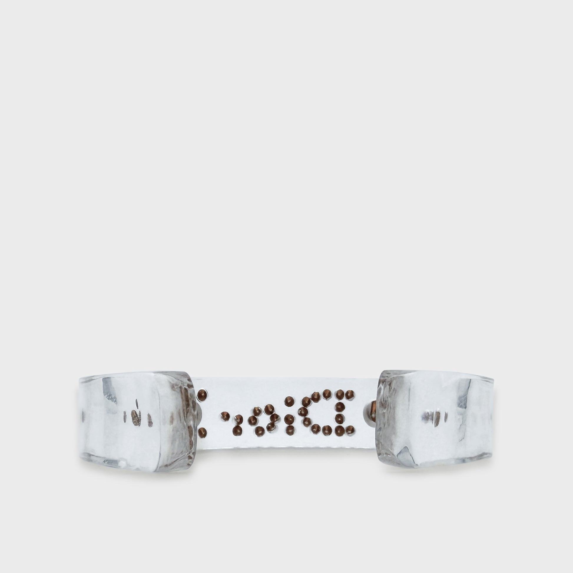 Bracelet manchette en plexiglas transparent, orné de strass formant le logo Dior. Jeu de transparence et d’éclat, typique de l’ère Galliano, entre provocation pop et glamour couture.Pièce iconique du Dior des années 2000.