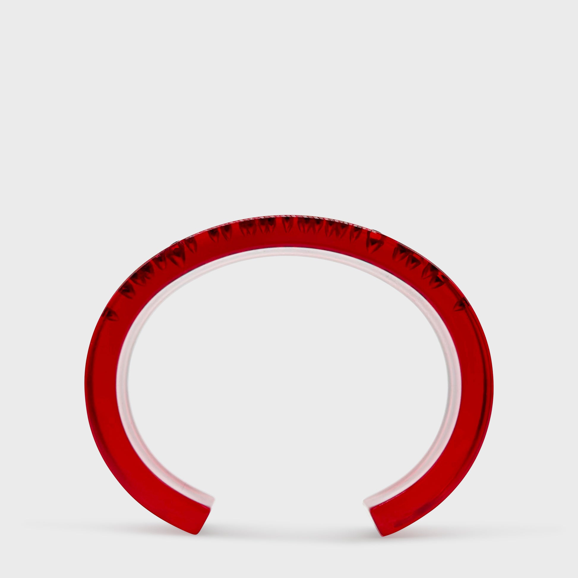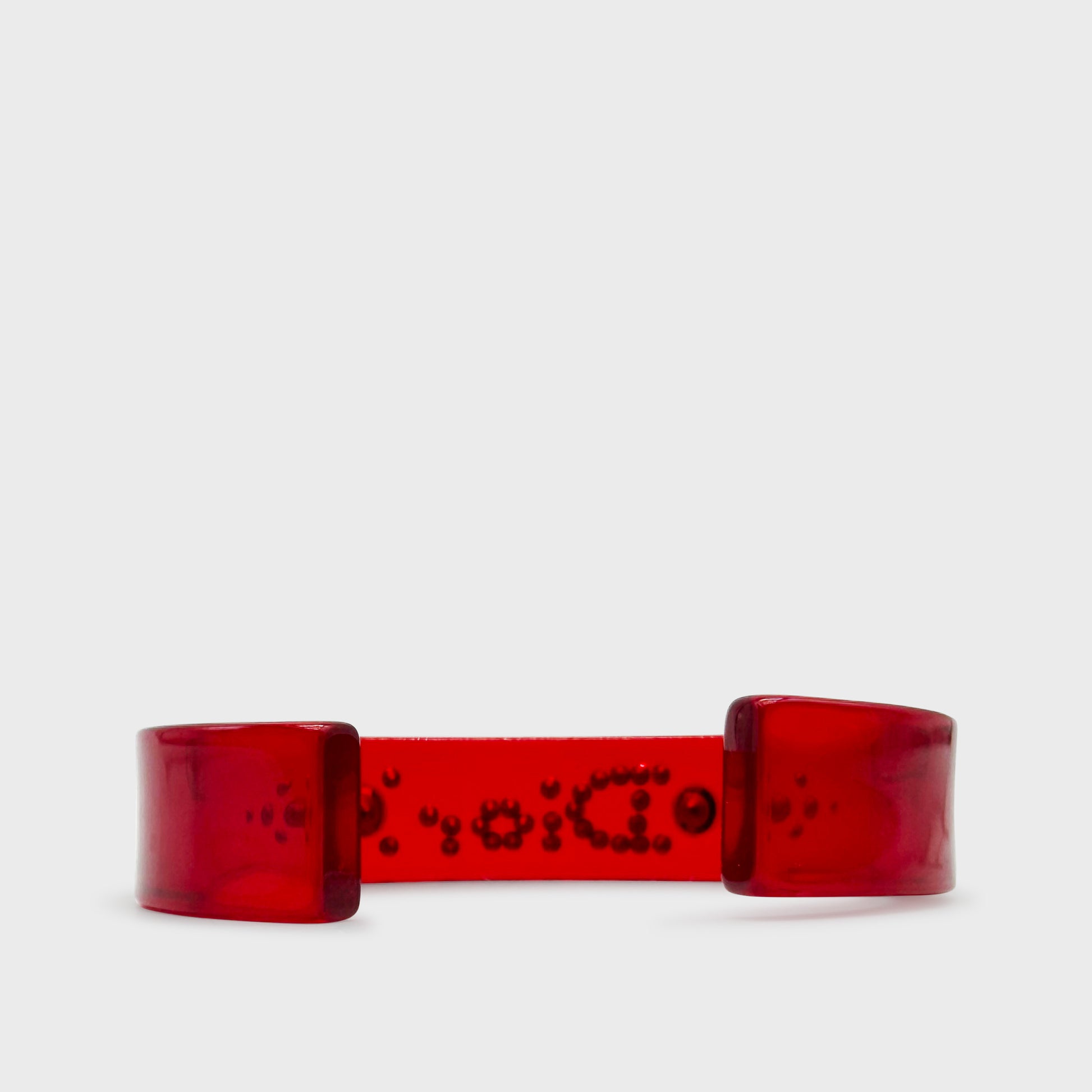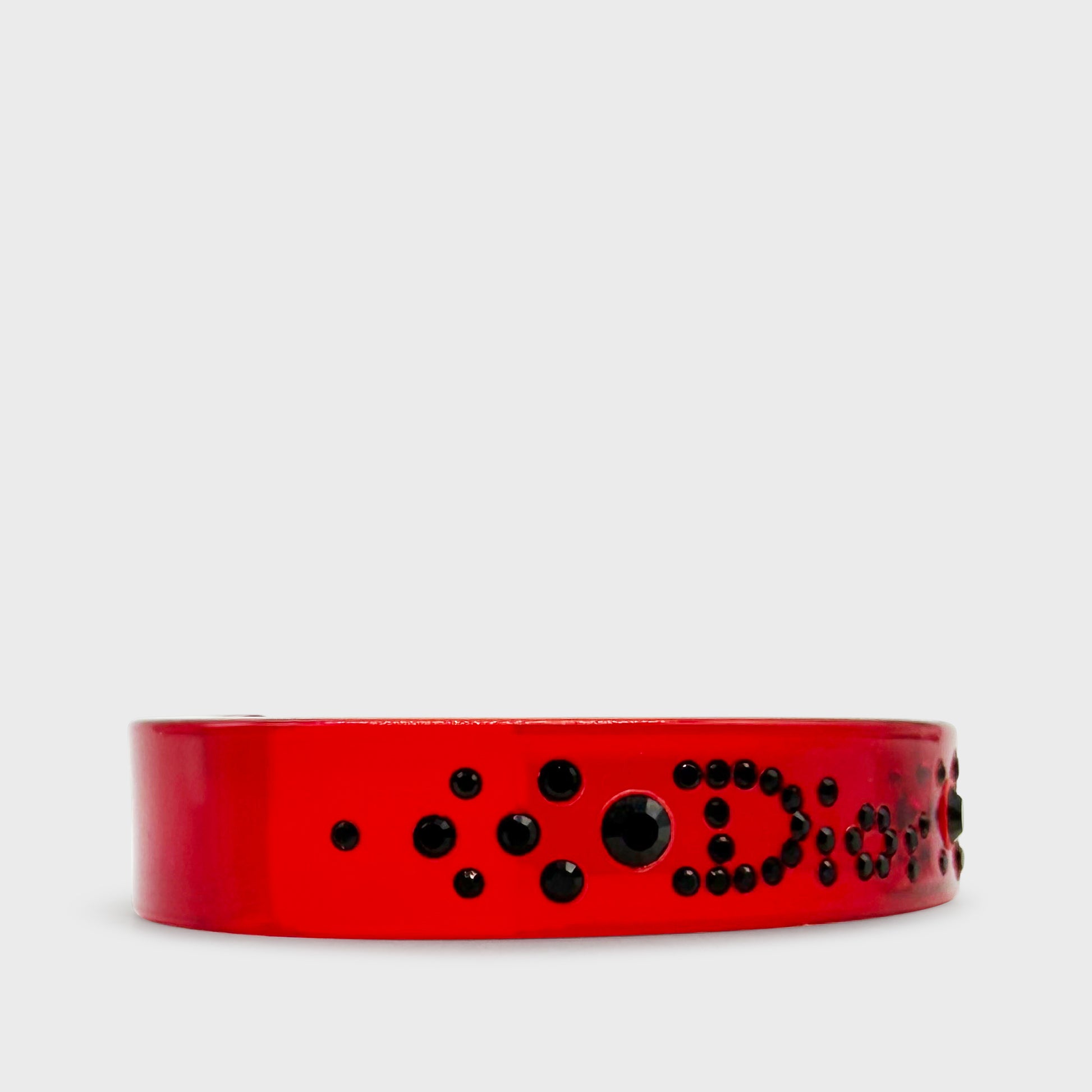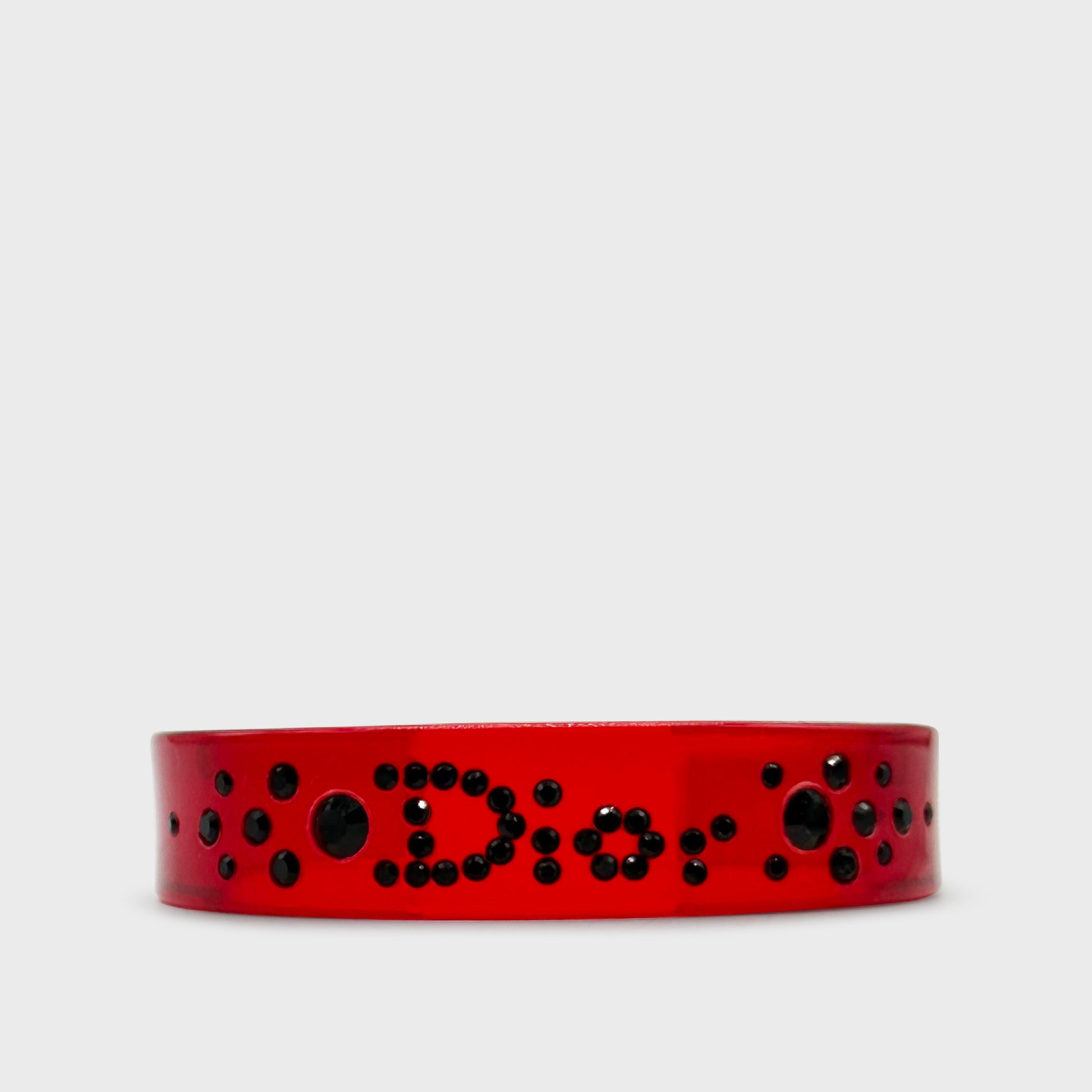 Bracelet manchette rigide en résine translucide rouge, incrusté de cristaux noirs formant le logo Dior. Jeu de transparence, contraste graphique et esprit Y2K couture typique de l’ère Galliano : une pièce à la fois pop, précieuse et résolument mode. Porté seul, il fait tout. Signature Dior gravée à l’intérieur.