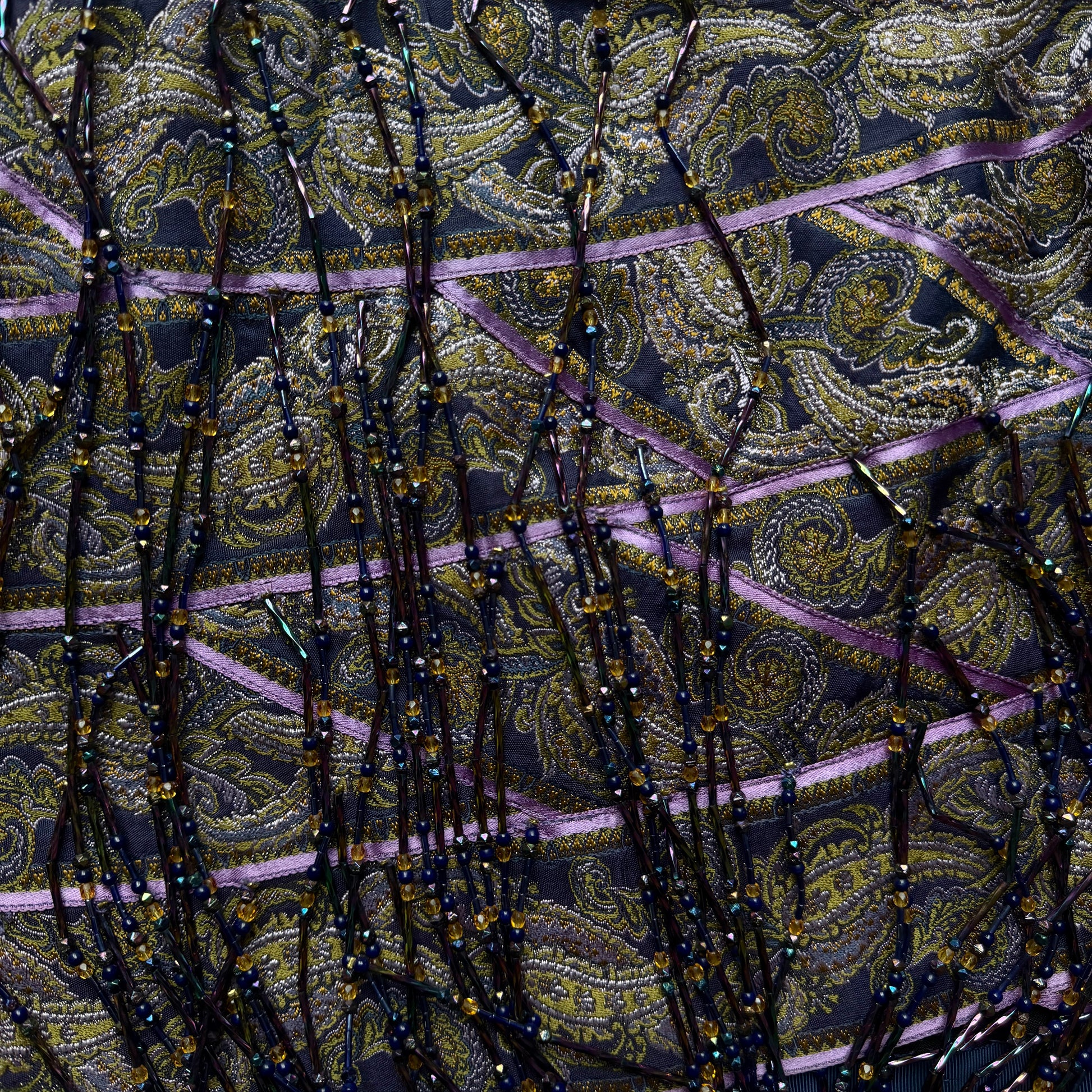 Jupe haute couture en jacquard de soie violet, brodée de sequins et perles en raphia et verre selon un motif quadrillé à effet patchwork. Franges longues entièrement perlées dans les mêmes tons pour une allure dansante et précieuse. Fermeture zippée invisible au dos. Silhouette asymétrique et ajustée à la taille, comme une réminiscence couture d’un paréo tribal.