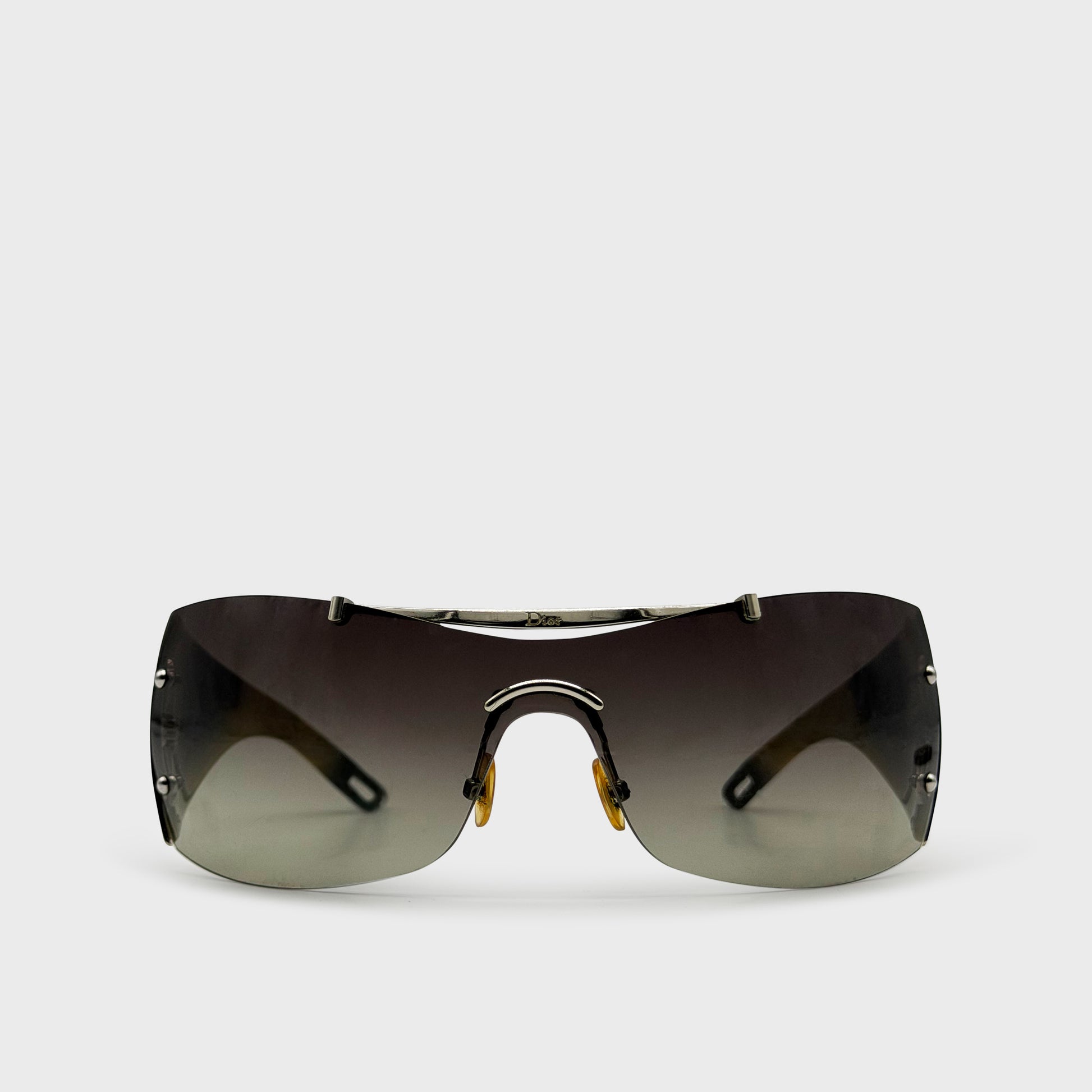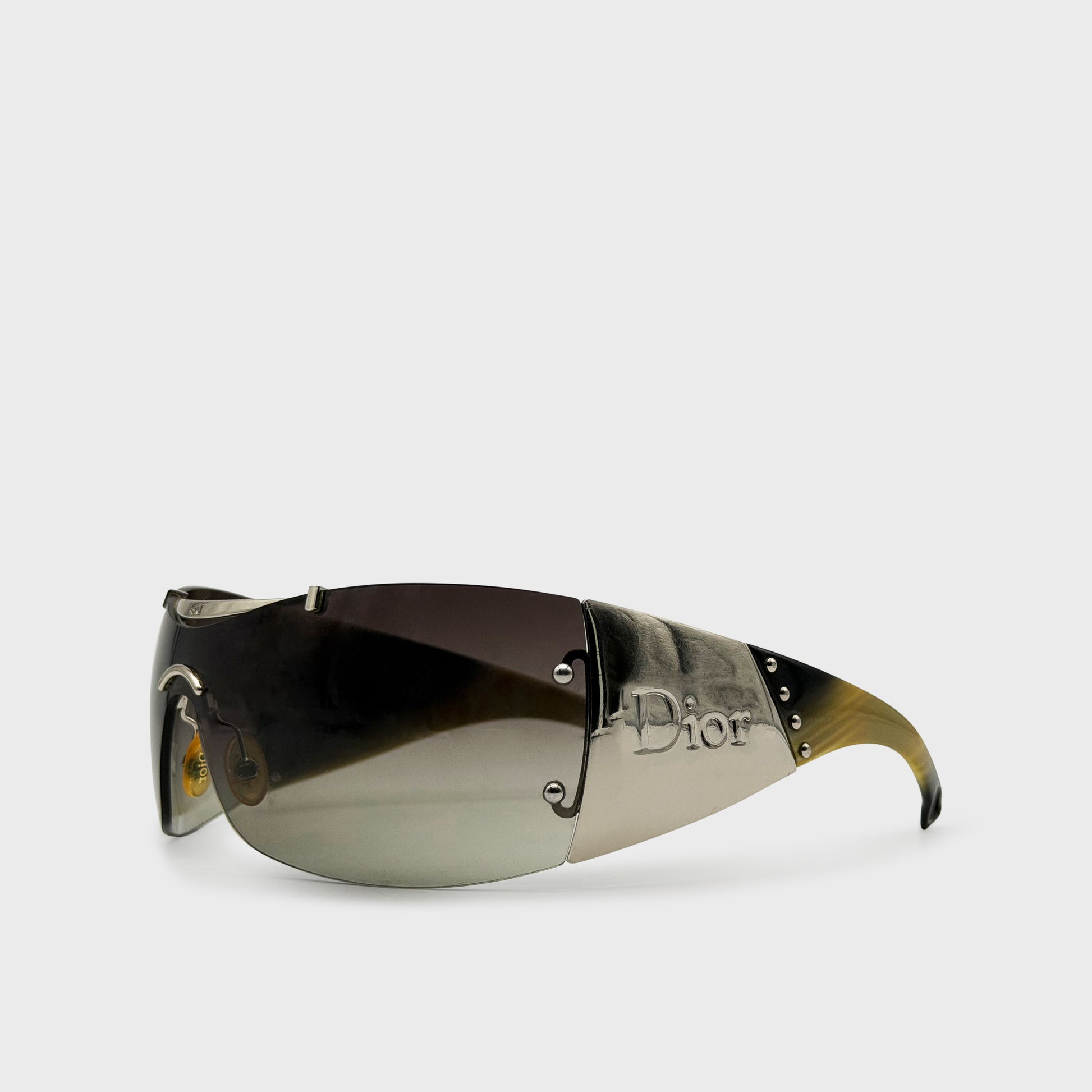 Modèle iconique à monture masque en verre fumé gris, habillé de plaques métalliques argentées gravées Dior. Branches dégradées translucides, rivets apparents et allure techno-futuriste, signature absolue de l’ère Galliano.