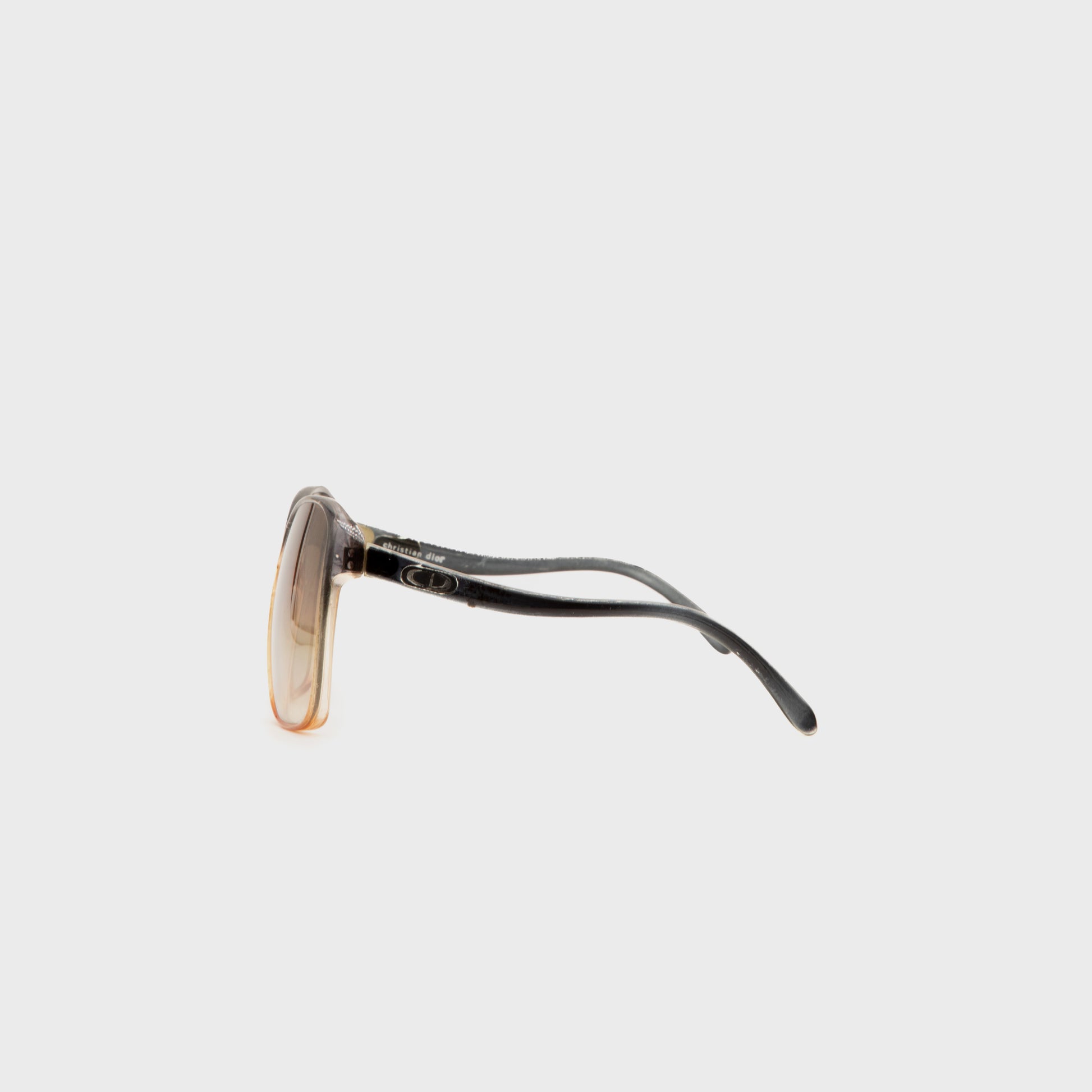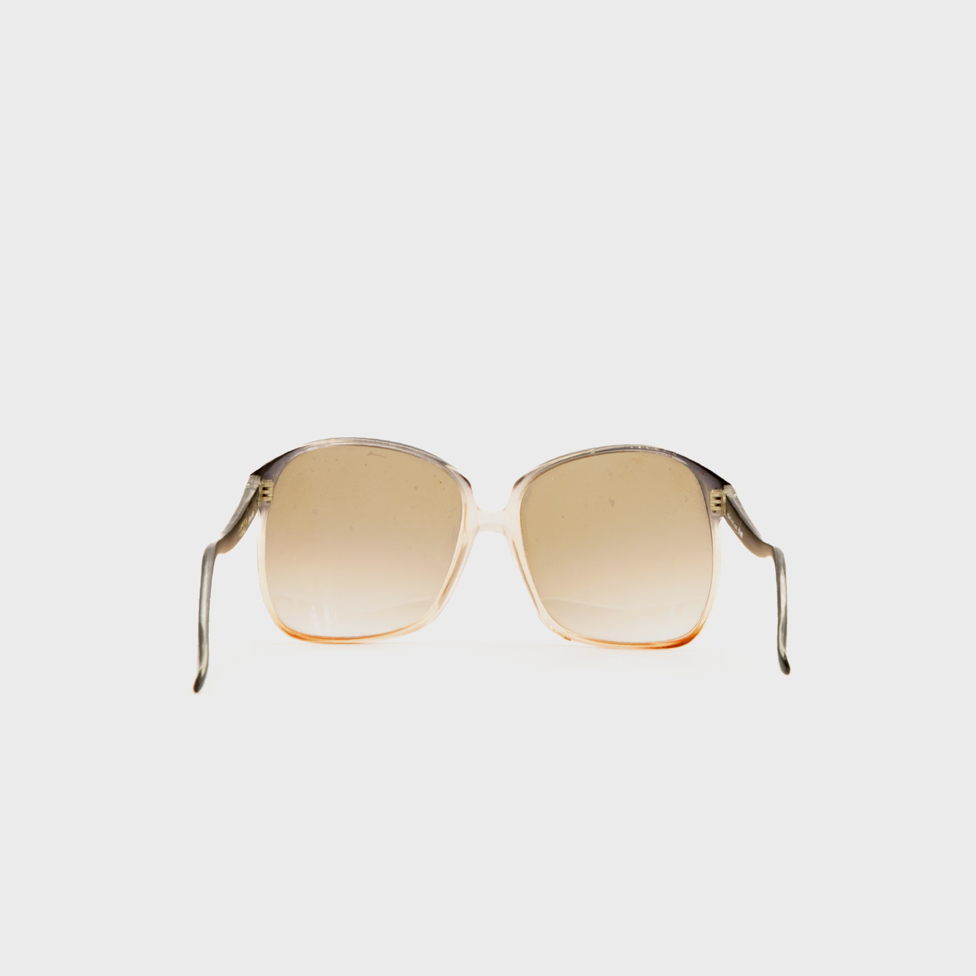 Lunettes de soleil Christian Dior, silhouette oversized en acétate translucide dégradé caramel. Verres brun clair fumés, branches galbées noires ponctuées du monogramme CD argenté. Design emblématique de l’élégance douce de Marc Bohan : équilibre entre discrétion, glamour et modernité fonctionnelle. Une pièce vintage qui sent les vacances à Saint-Tropez et les magazines en papier glacé.