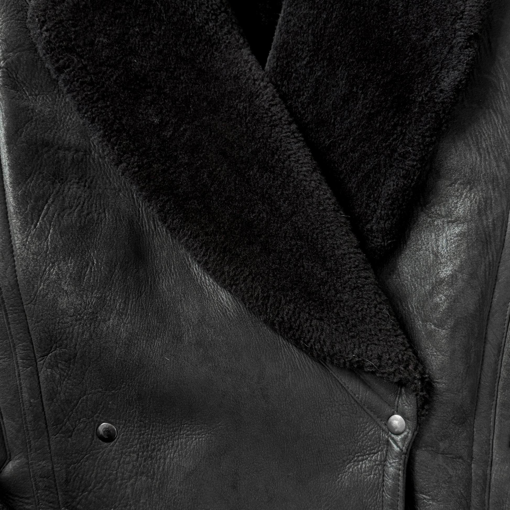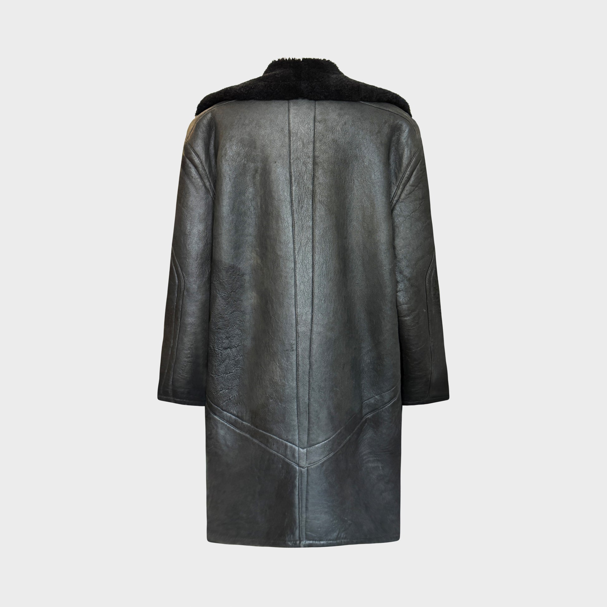 Manteau oversize en peau lainée noire. Col châle XXL structuré, asymétrie subtile à l’avant, pressions cachées et finitions brutes. Lignes courbes au dos, typiques de l’architecture Mugler. Coupe cocon, pouvoir thermique maximal. L’underdog absolu des hivers glacés : baroque et brutaliste.