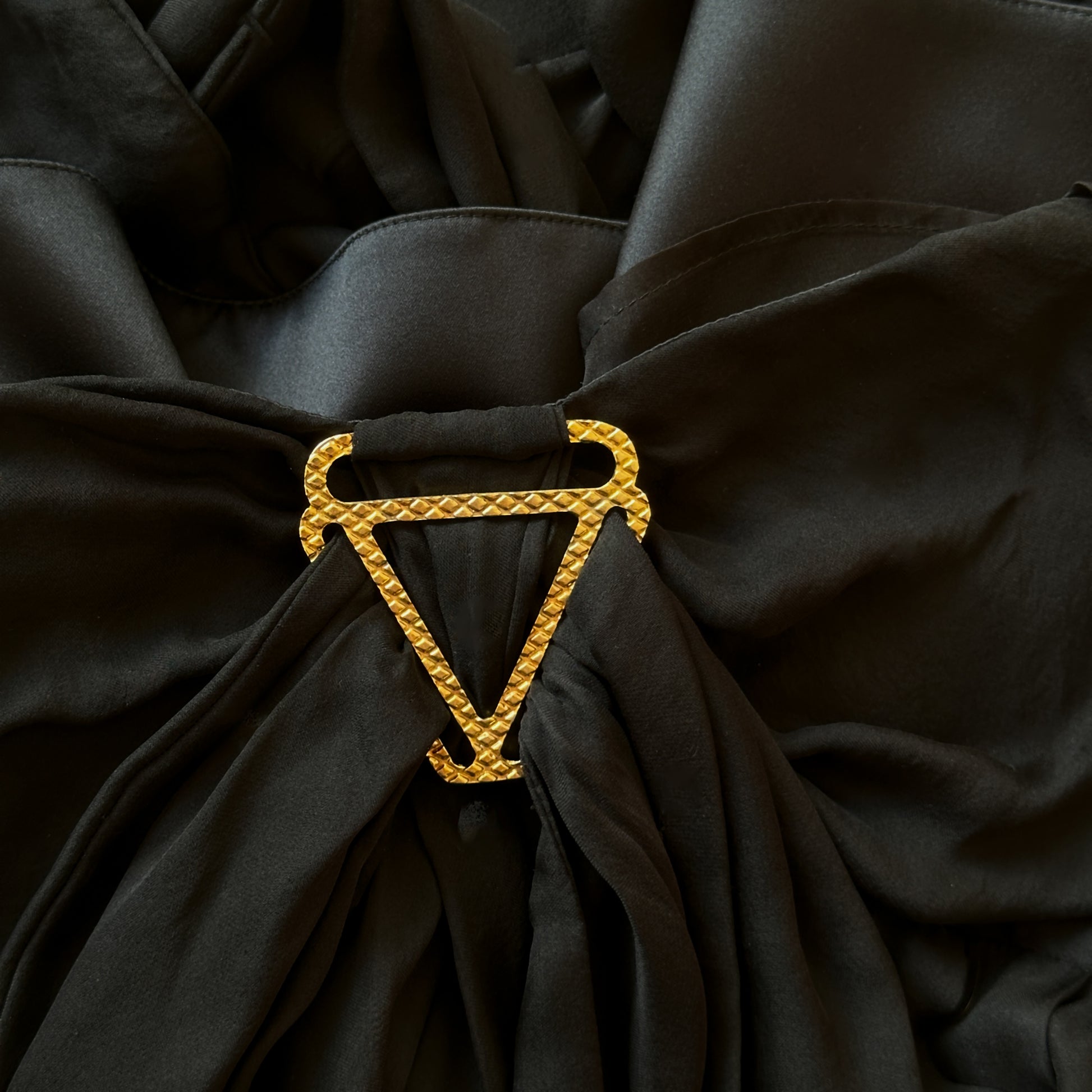 Robe noire en crêpe de soie fluide, à fines bretelles et drapé croisé sur la poitrine. Détail signature : une boucle triangulaire dorée texturée vient structurer le décolleté, clin d’œil aux attaches équestres fétiches de la maison. La taille empire allonge la silhouette, la jupe évasée accompagne le mouvement.