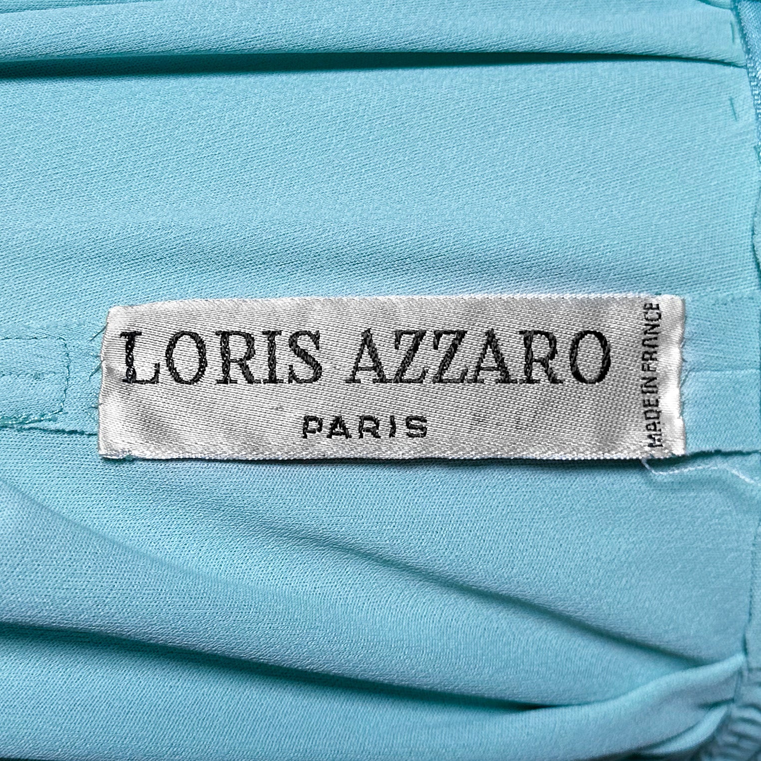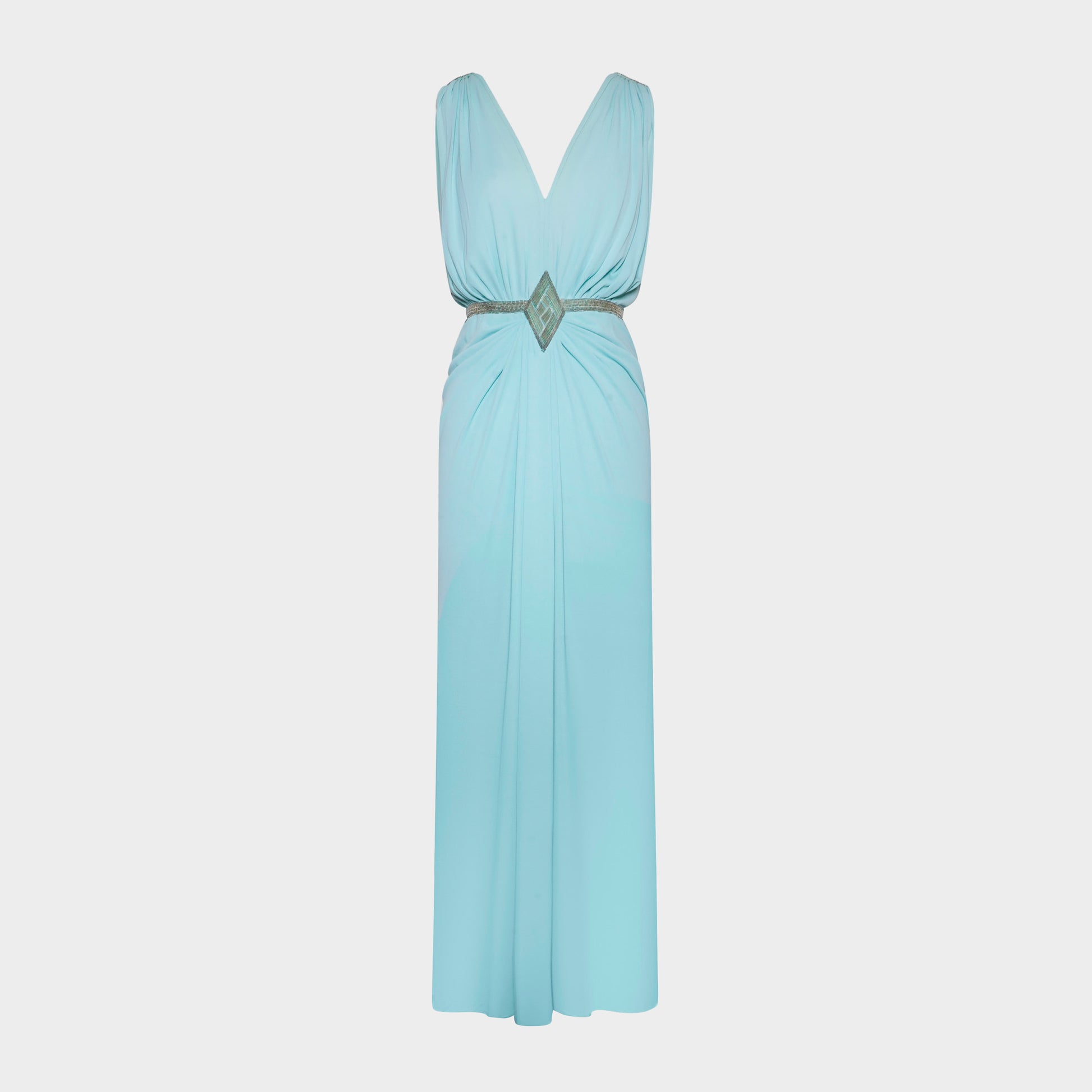 Robe longue en crêpe de soie bleu azur, inspirée de l’Antiquité. Décolleté plongeant devant et dos, effet drapé délicat structuré par une ceinture brodée de perles de verre argentées. Le losange central, signature du style Azzaro, accentue la taille et apporte une touche bijou. Silhouette fluide et aérienne, dans l’esprit glamour des muses grecques revisitées par le couturier.