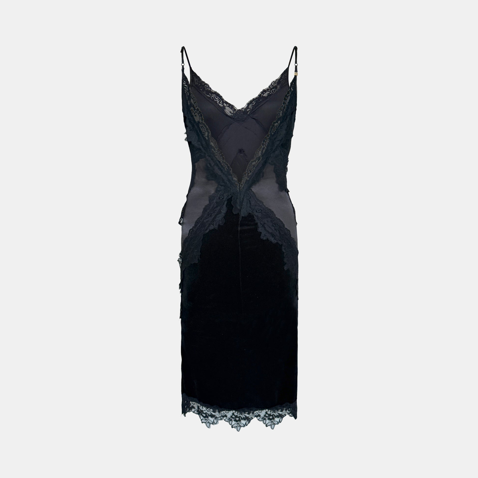Robe nuisette en velours noir stretch, rehaussée d’incrustations triangulaires en satin et dentelle de Calais. Fines bretelles réglables, décolleté croisé et découpe façon V au dos. La silhouette suit les lignes du corps, dans une esthétique boudoir sculptée.