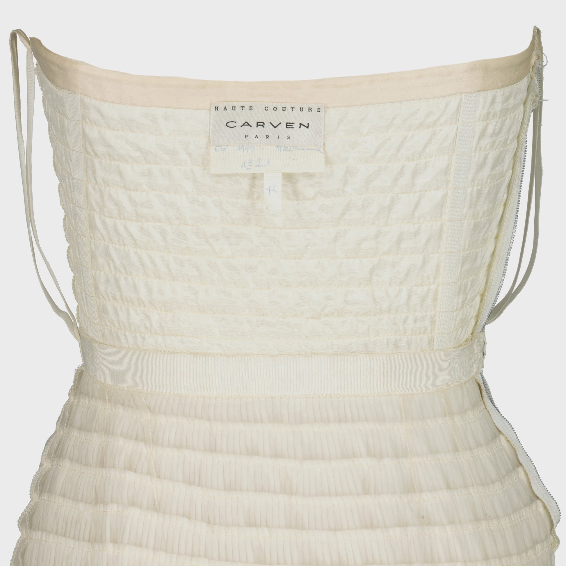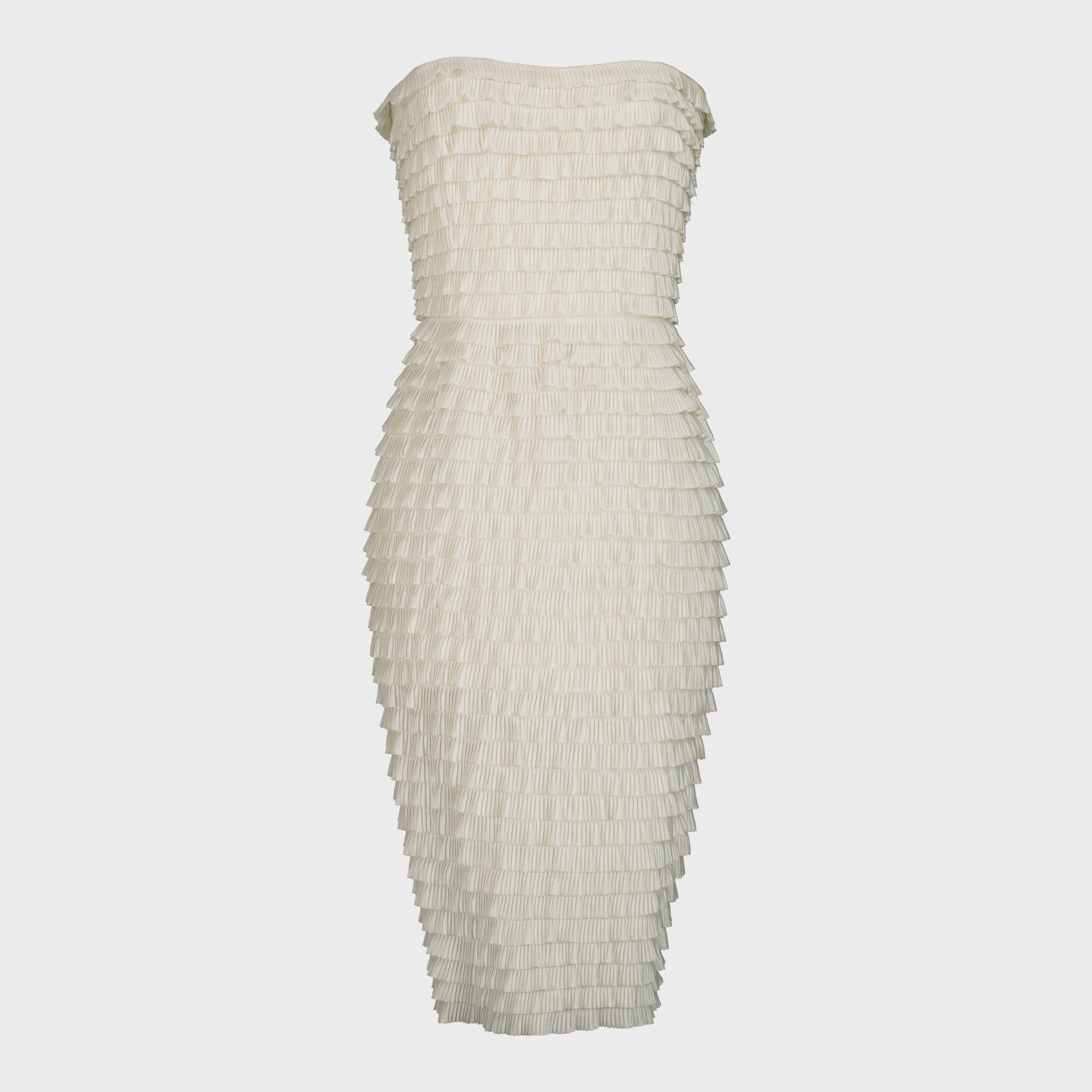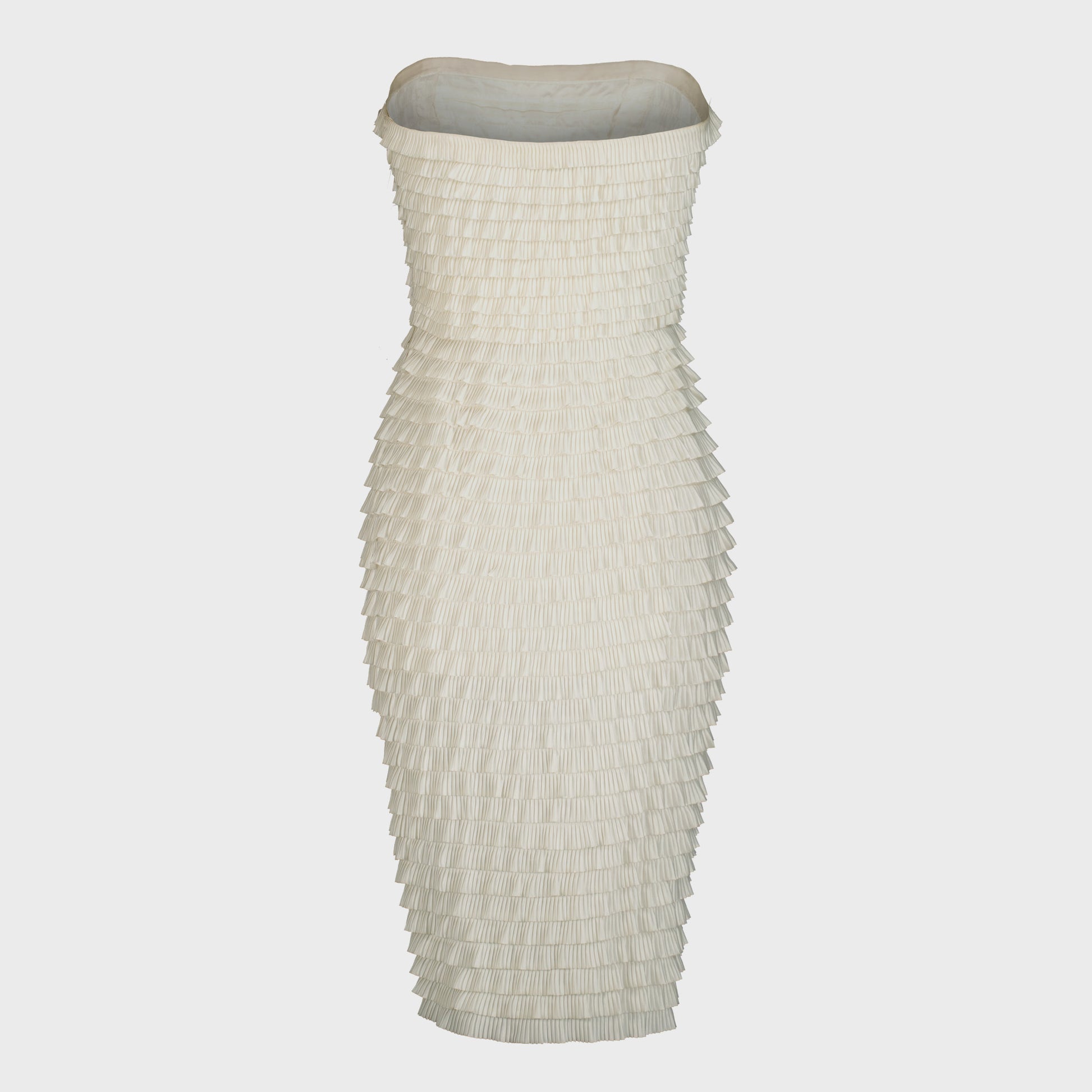 Robe bustier en soie blanche, structurée par une multitude de volants horizontaux plissés, créant une texture fluide et dynamique. Silhouette ajustée, mettant en valeur la ligne du corps avec une précision couture. Fermeture par zip latéral dissimulé.