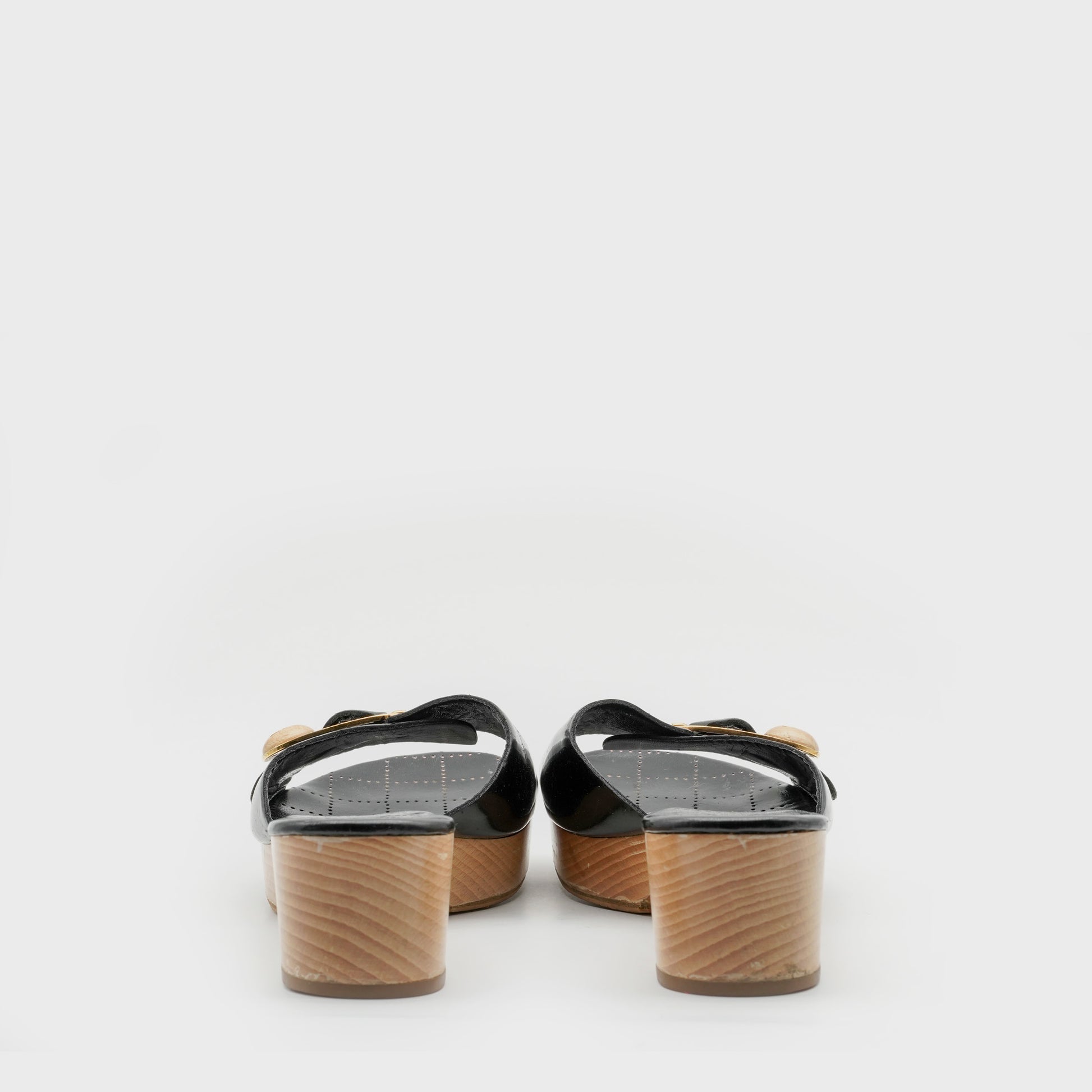Mules à plateforme en bois, cuir vernis et boucle dorée figurant un logo de la maison Chanel sur une bille de bois. Semelle intérieur en cuir micro-perforé Chanel et quadrillée.