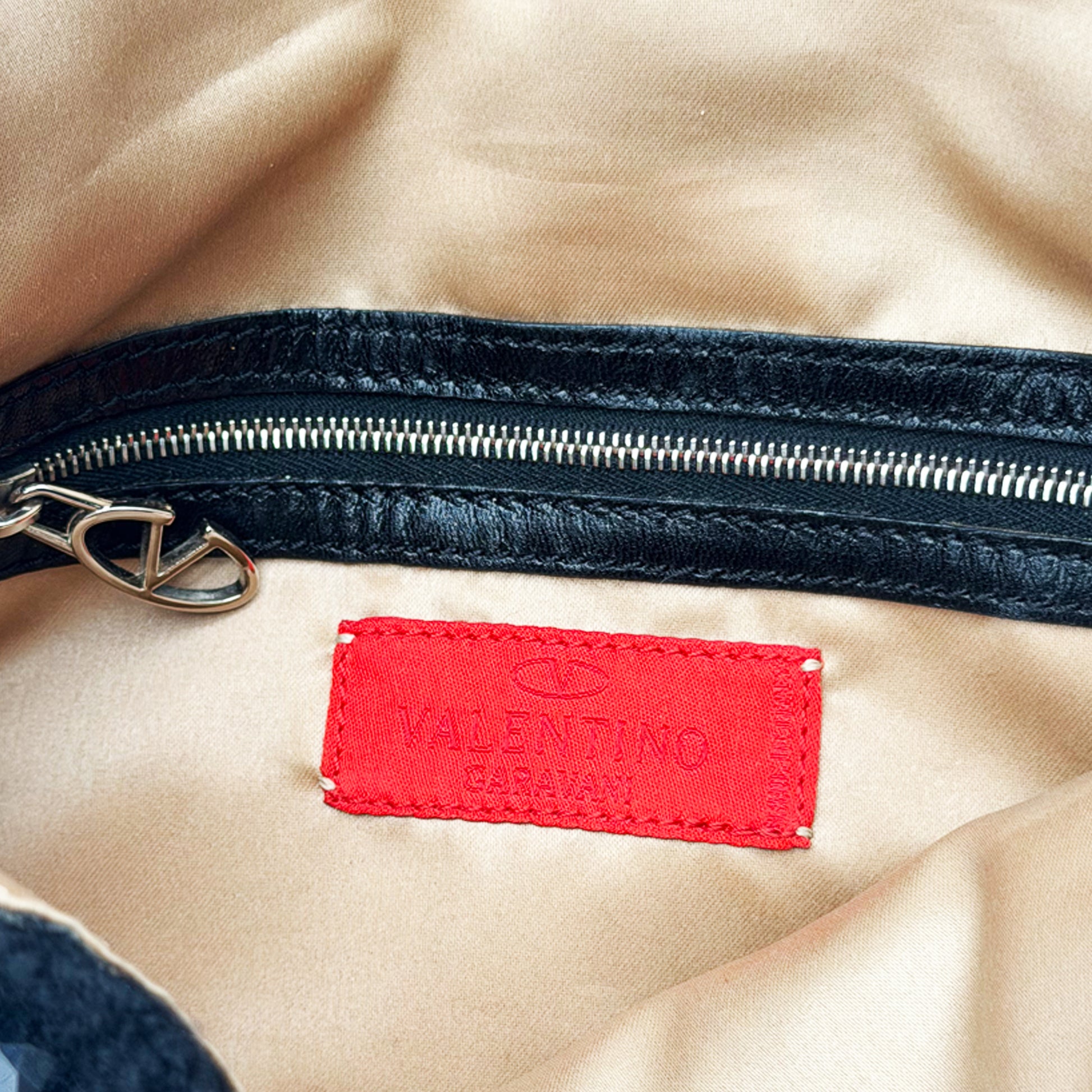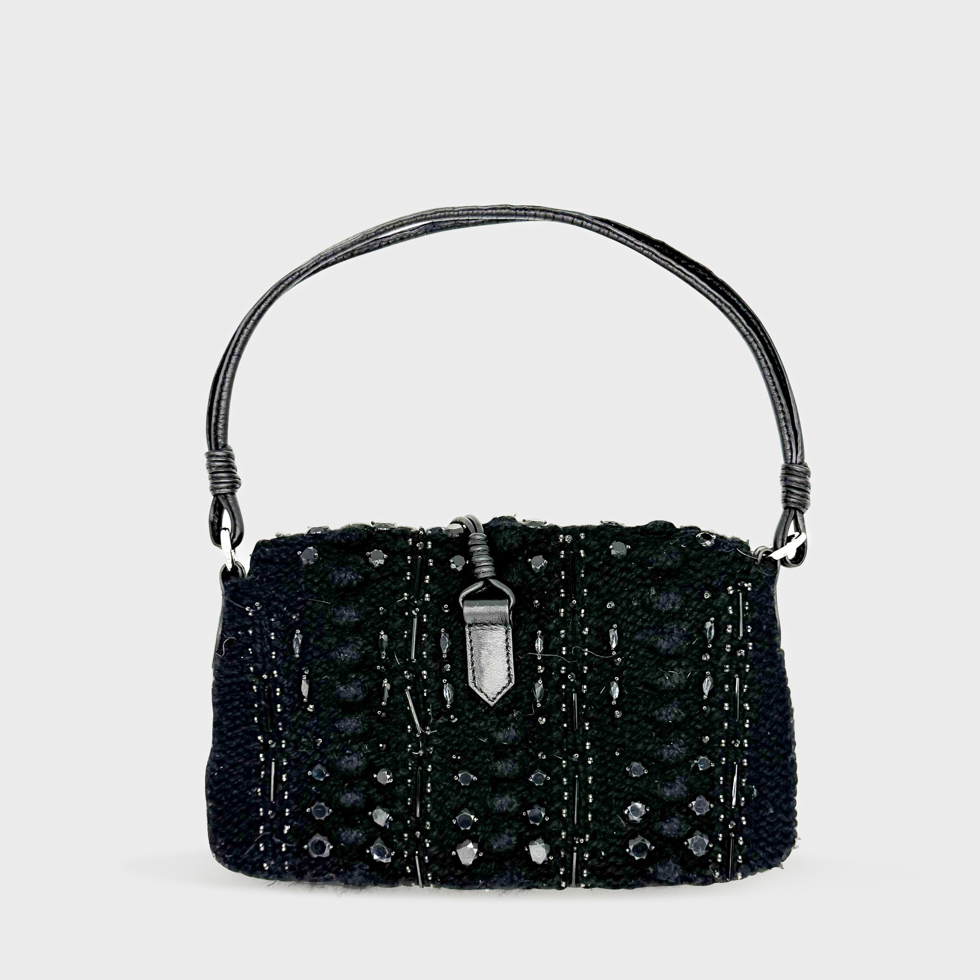 Sac en textile noir texturé, entièrement rebrodé de perles et sequins ton sur ton. Anse courte en cuir, fermoir bijou argenté au centre. Élégance couture, soirée romaine, Valentino pur jus.