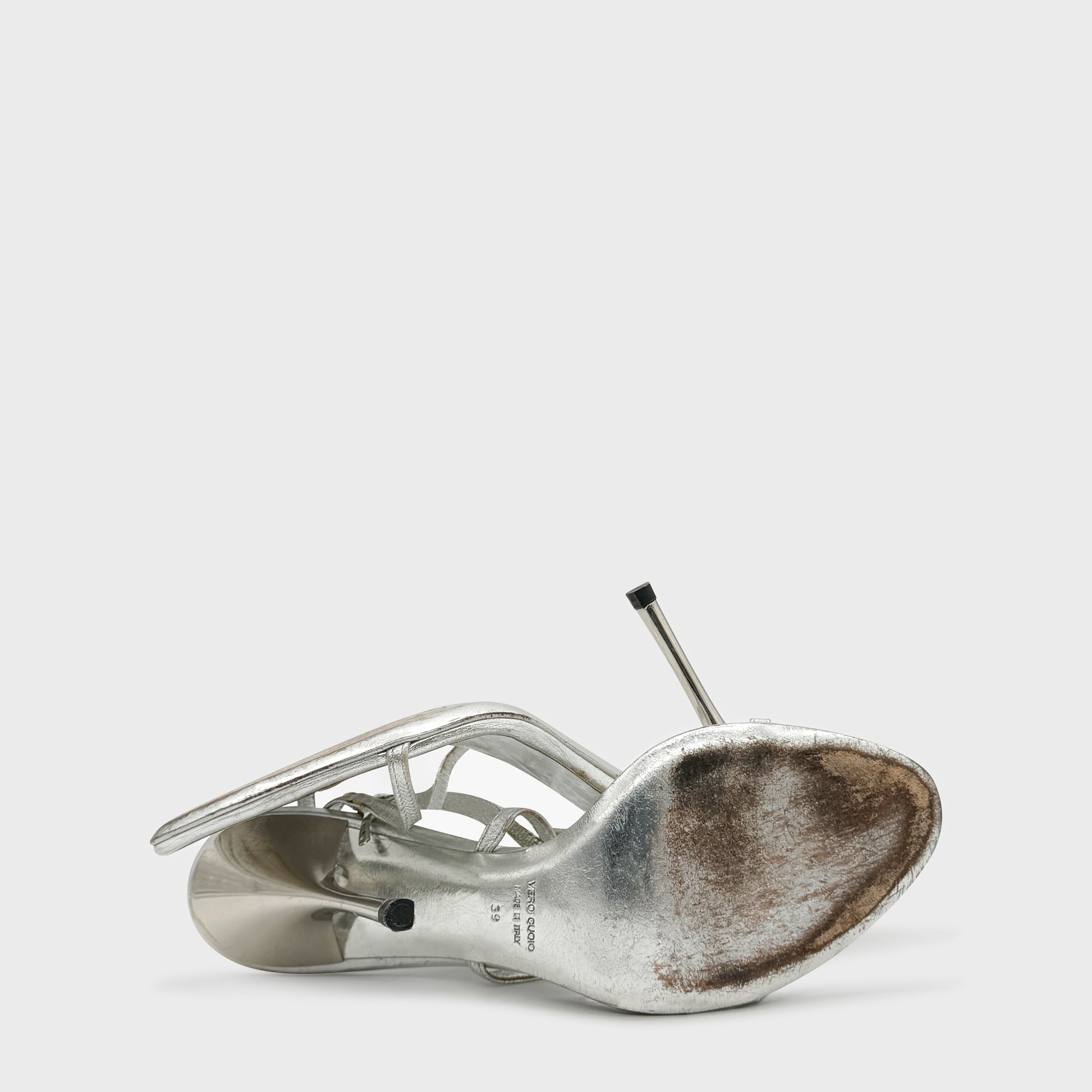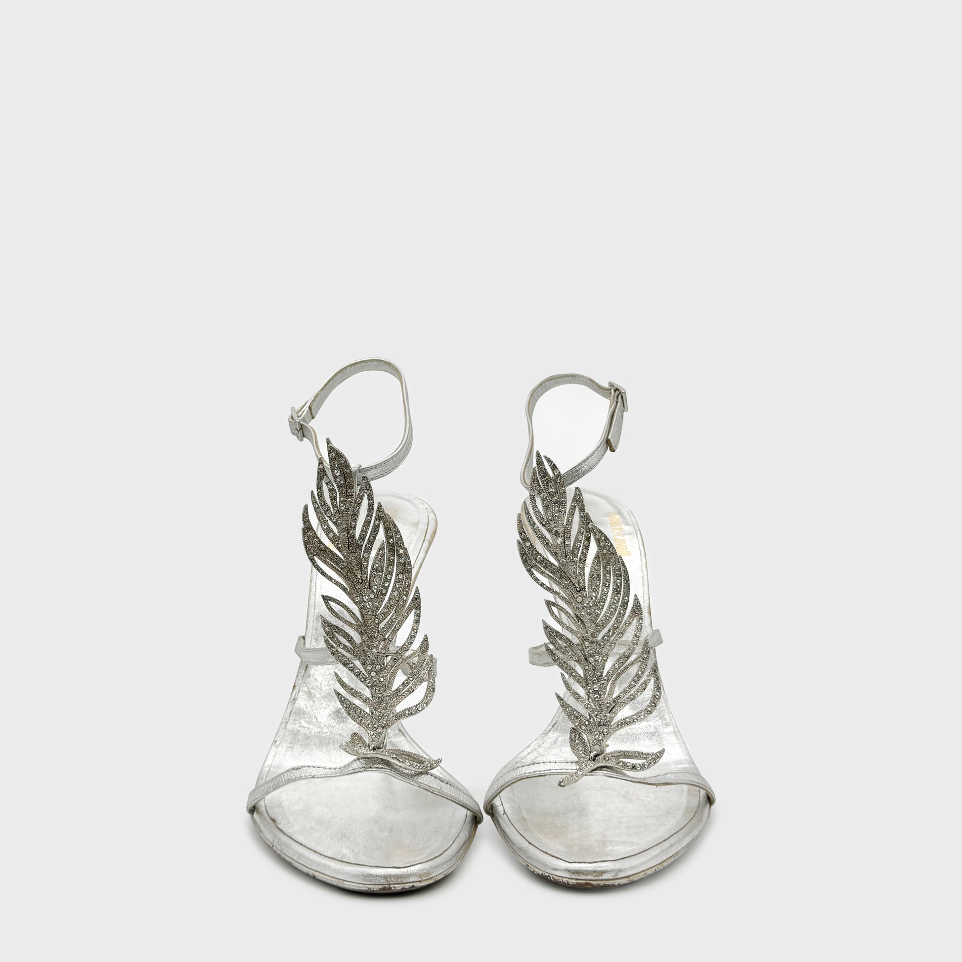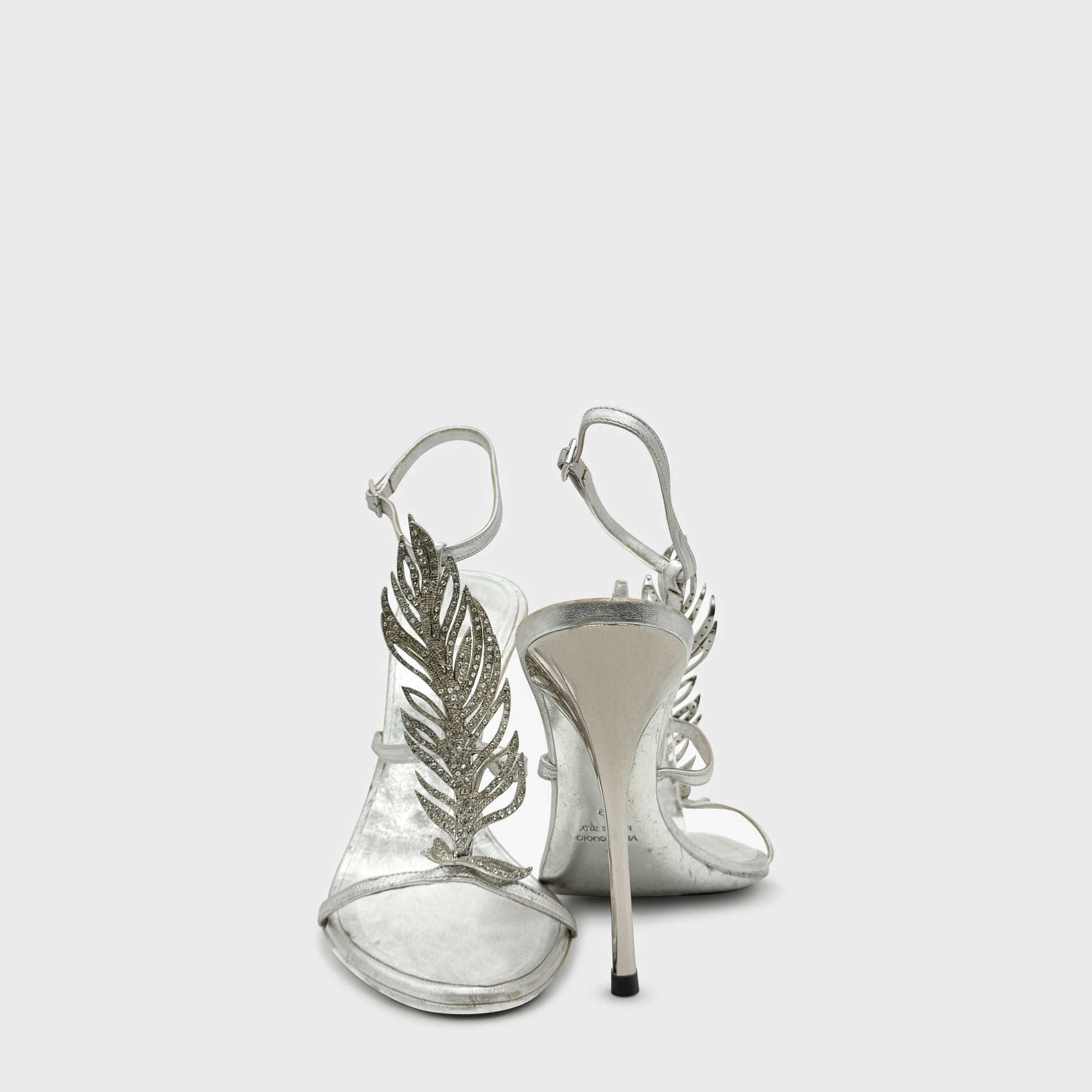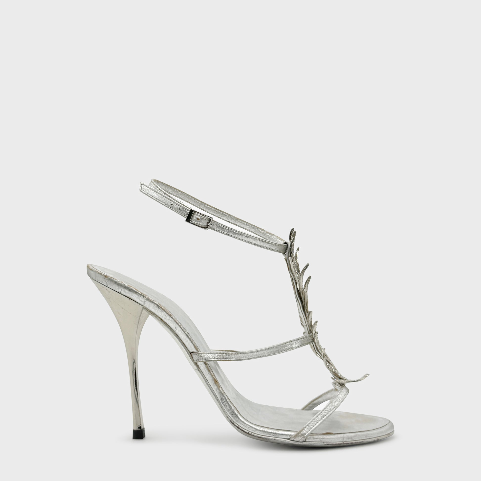 Sandales à talon en cuir argenté, fines brides minimalistes et décor central en forme de plume sertie de strass. Talon aiguille élancé, silhouette aérienne et glamour signature Cavalli, entre sensualité italienne et esprit soirée couture.
