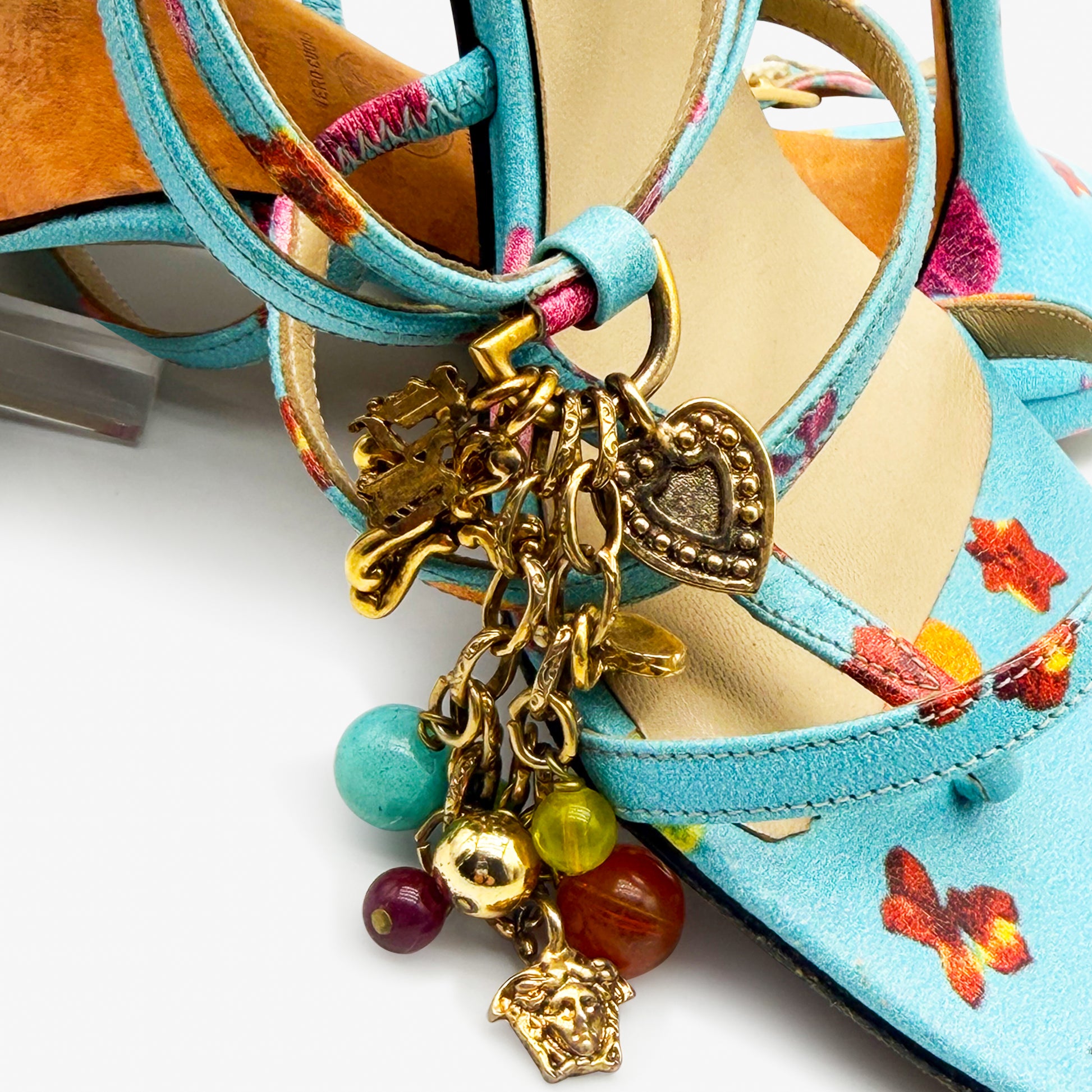 Sandales à brides fines en toile imprimée florale bleu ciel, talon aiguille. Ornements bijoux multicolores pendants à l’avant, esprit baroque léger et glamour Y2K. Sensualité solaire, signature Versace.