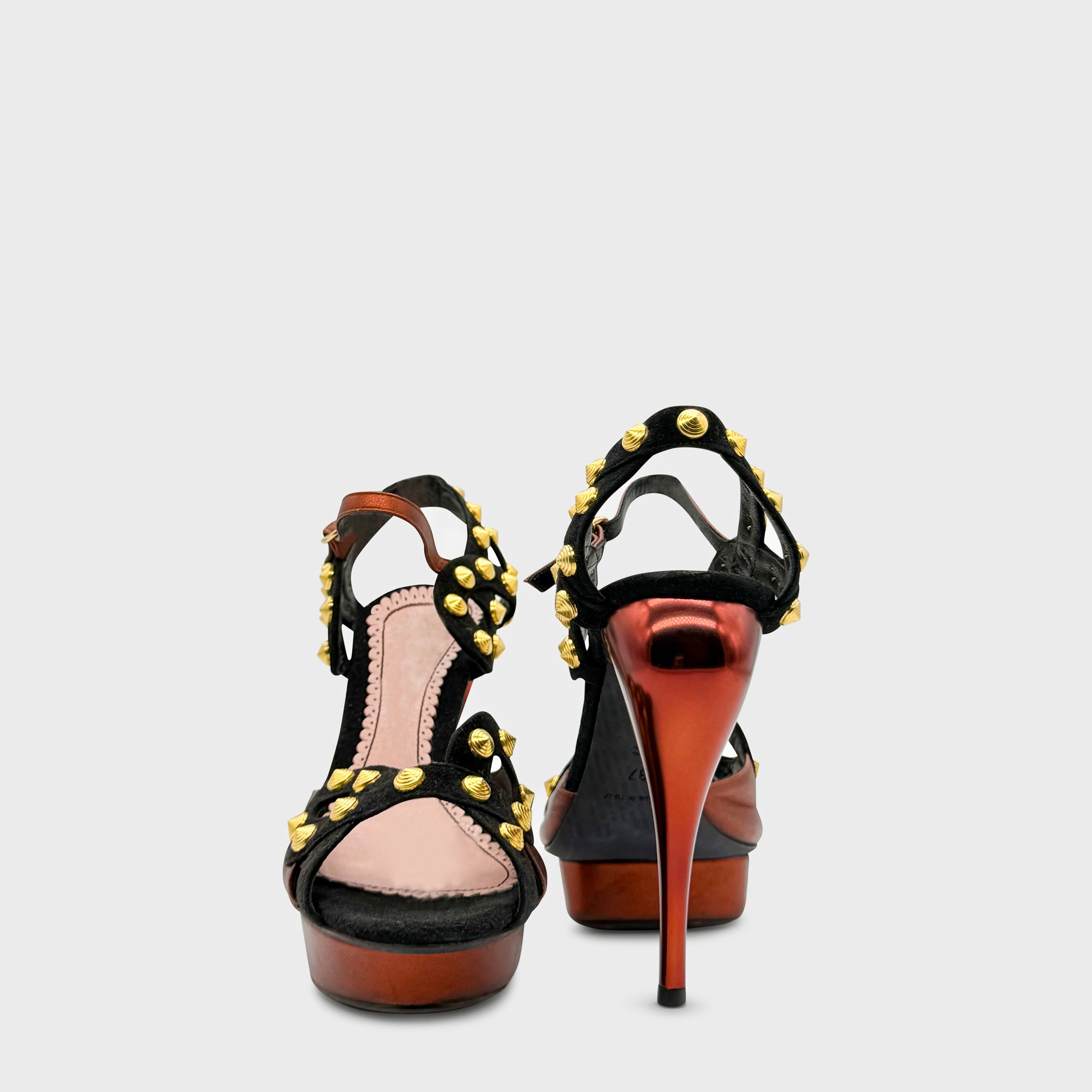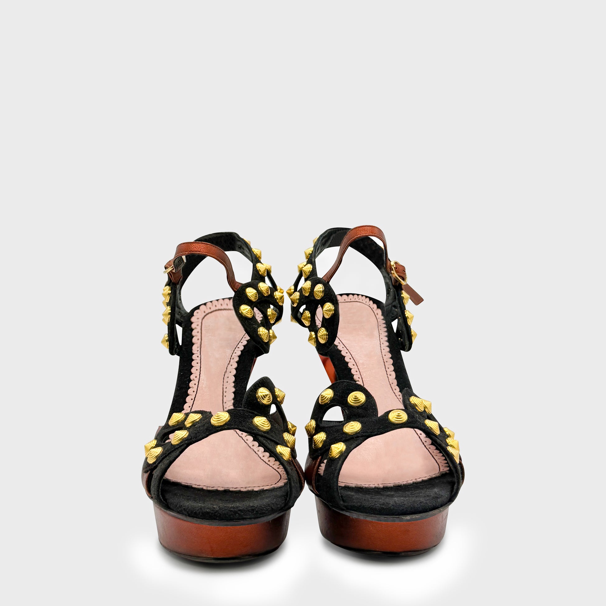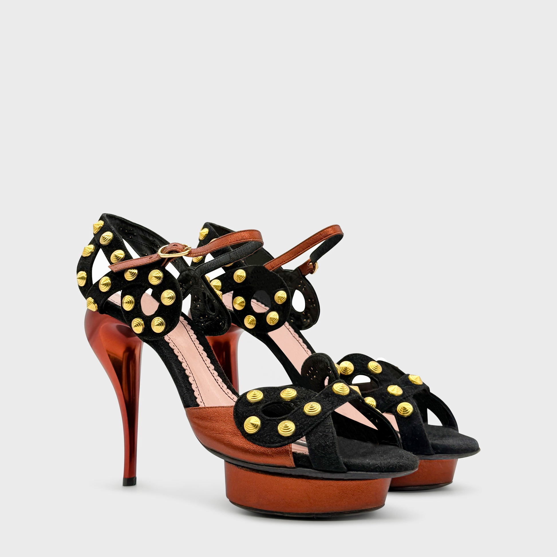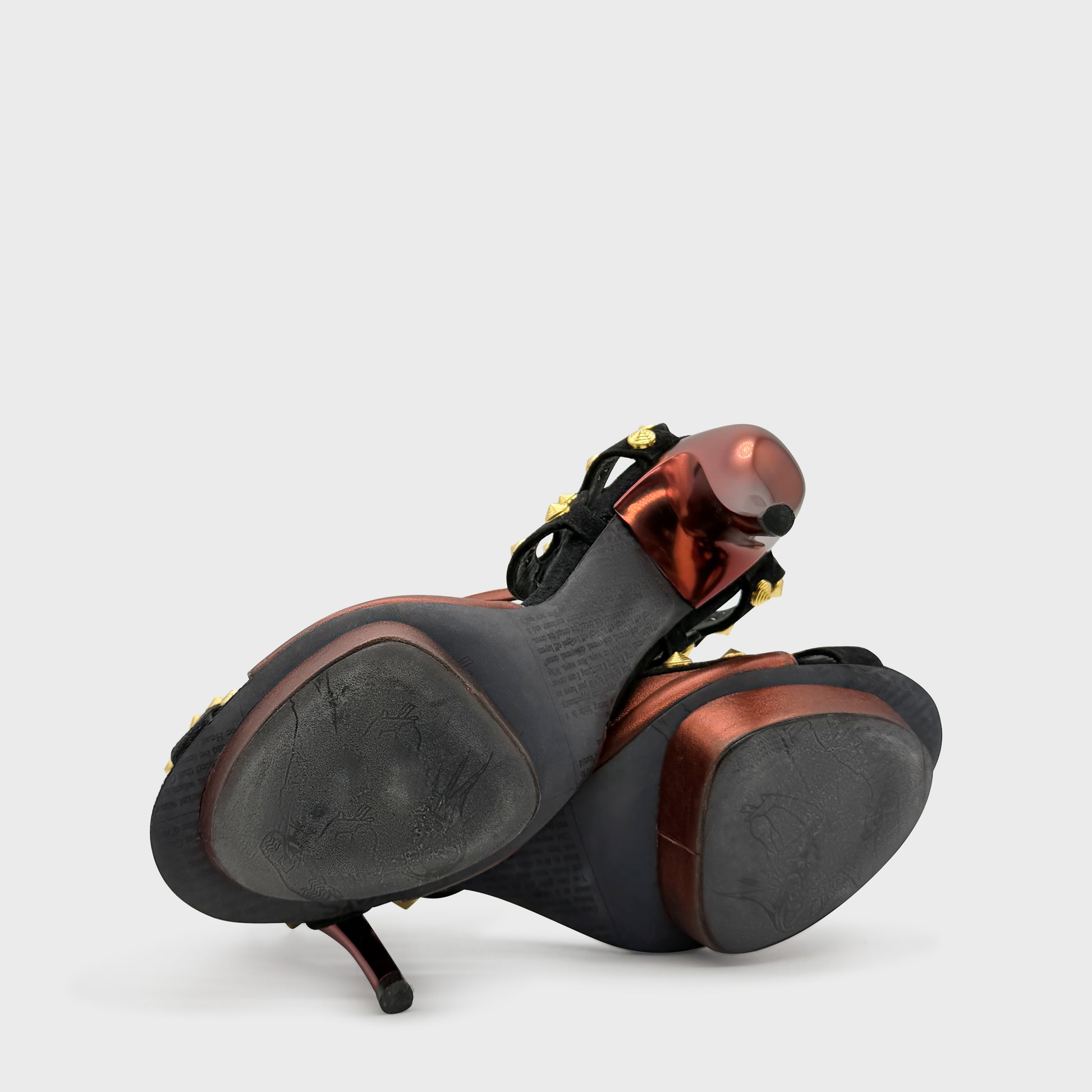 Sandales à plateforme en cuir noir et brun, bout ouvert, talon aiguille, ornées de pastilles métalliques dorées signature Galliano. Brides graphiques et silhouette sculpturale, typique de l’esthétique radicale de la maison à la fin des années 2000.
