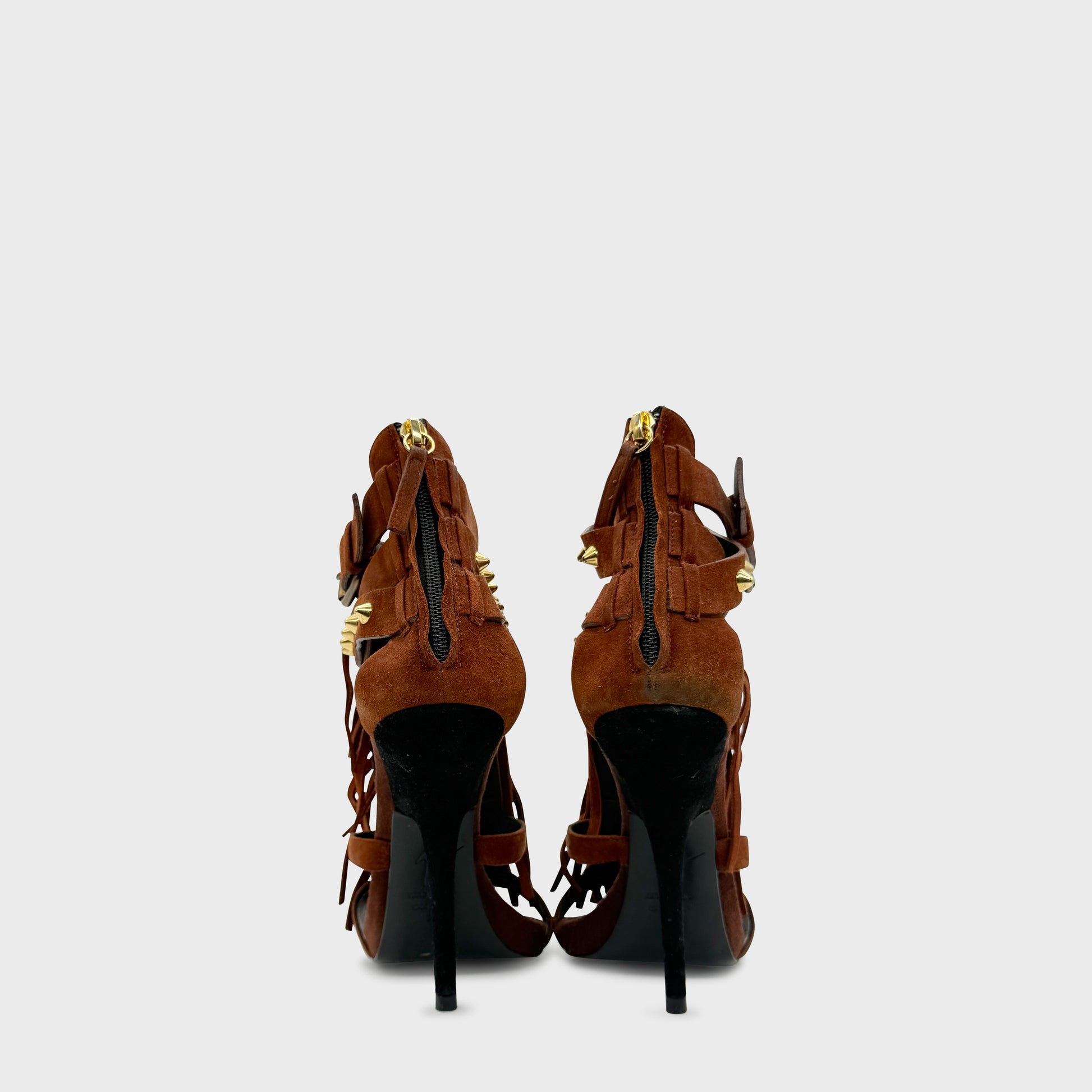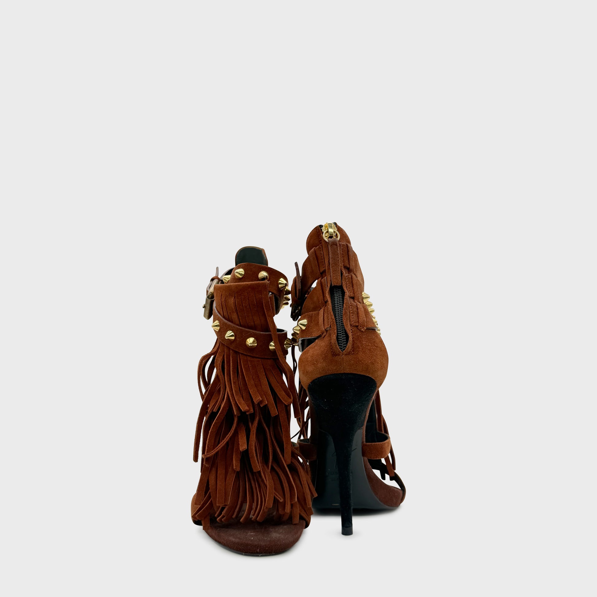 Sandales à talon en daim brun, construction à brides croisées rehaussées de franges longues et de clous dorés. Talon aiguille élancé, silhouette très sensuelle, entre esprit western et glamour nocturne, signature d’un Zanotti maximal et assumé.