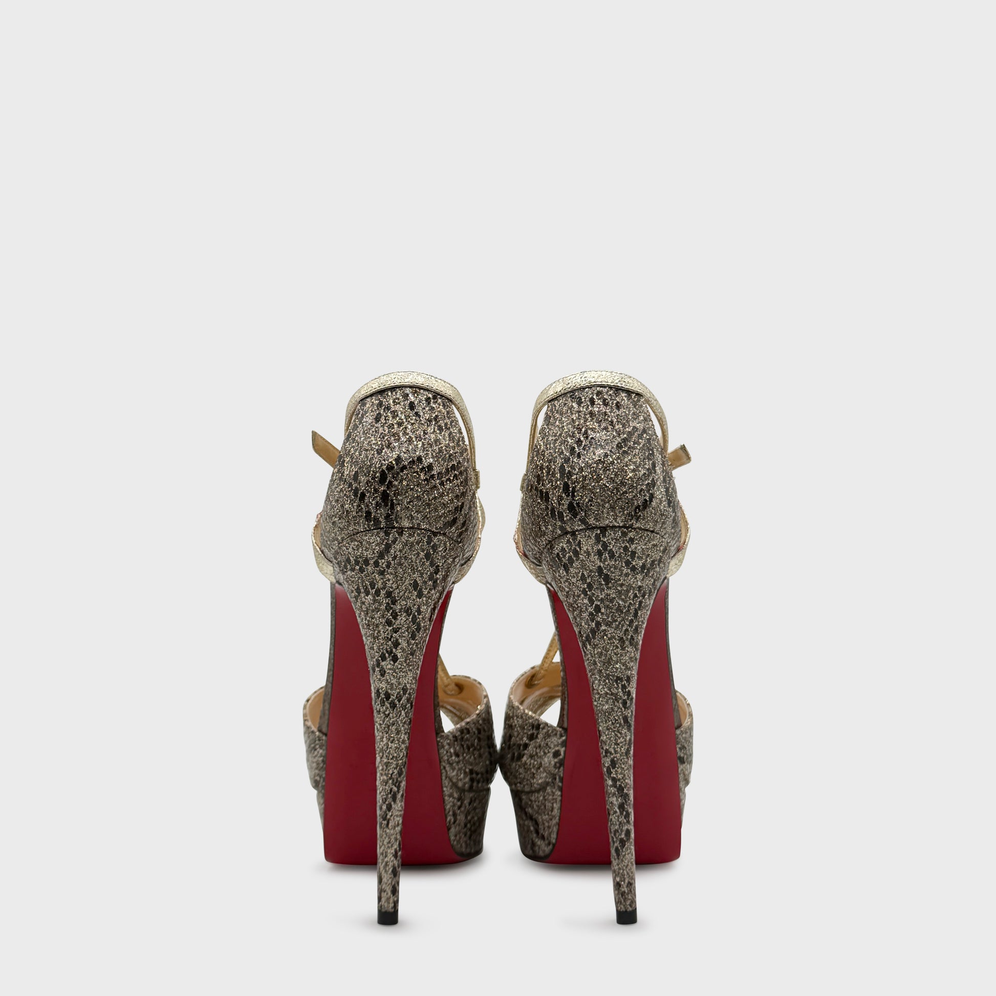 Paire de sandales à plateforme vertigineuse, confectionnée en cuir imprimé python rehaussé de brides dorées. Fermeture par bride à la cheville. Bout ouvert et talon aiguille signature sur semelle rouge iconique. Glamour pur jus, pour perchées invincibles.
