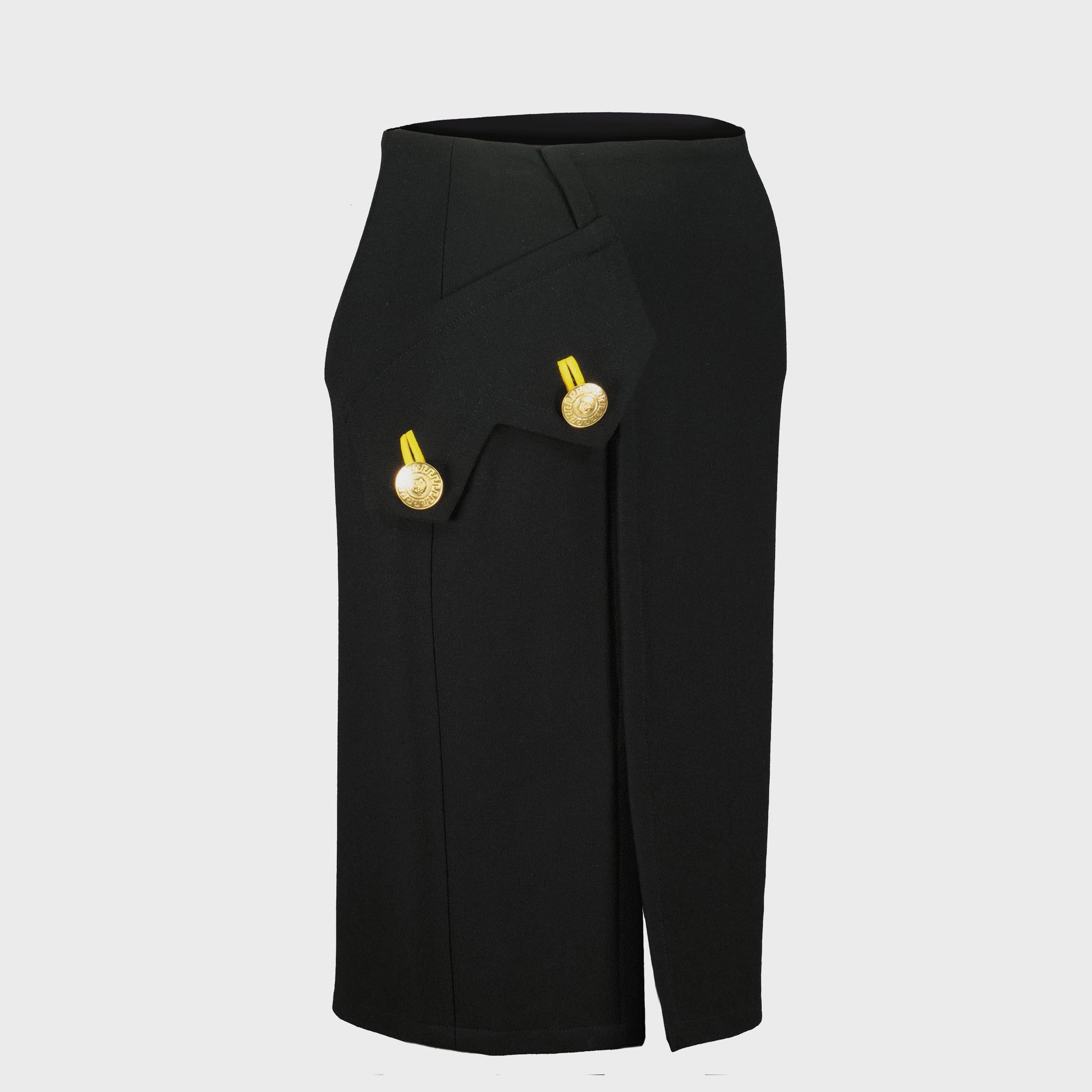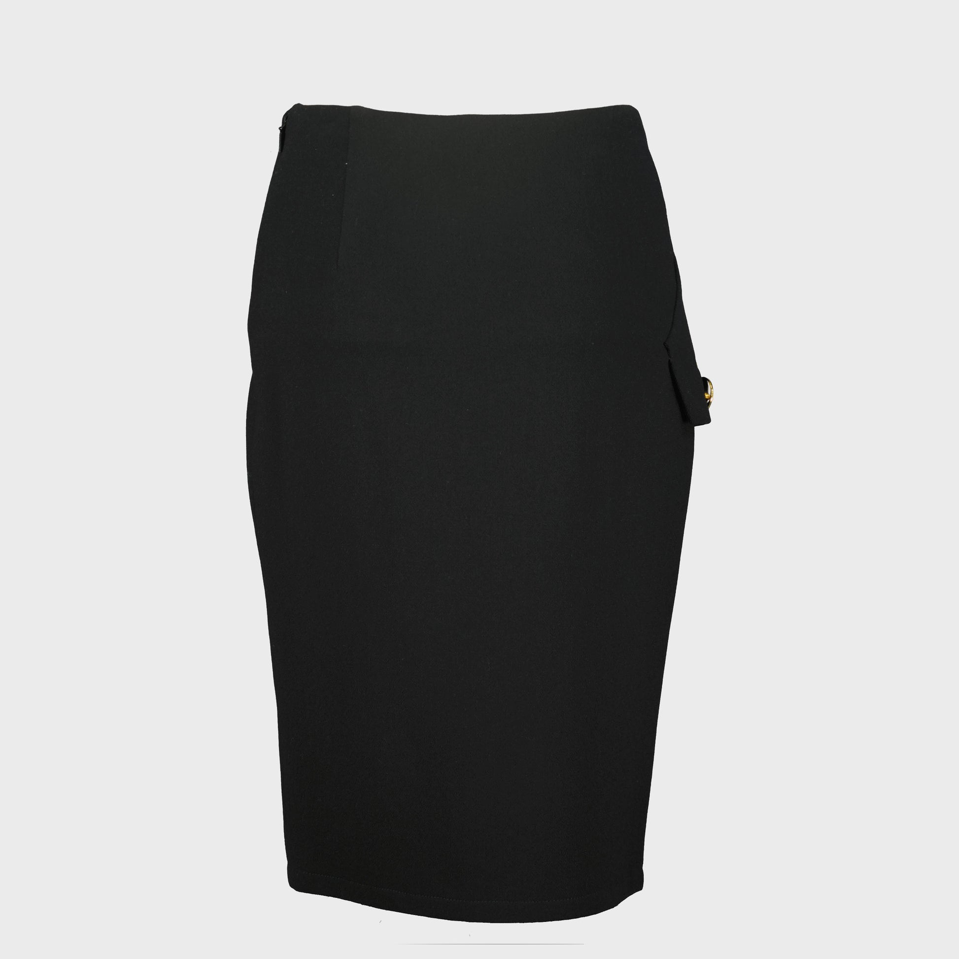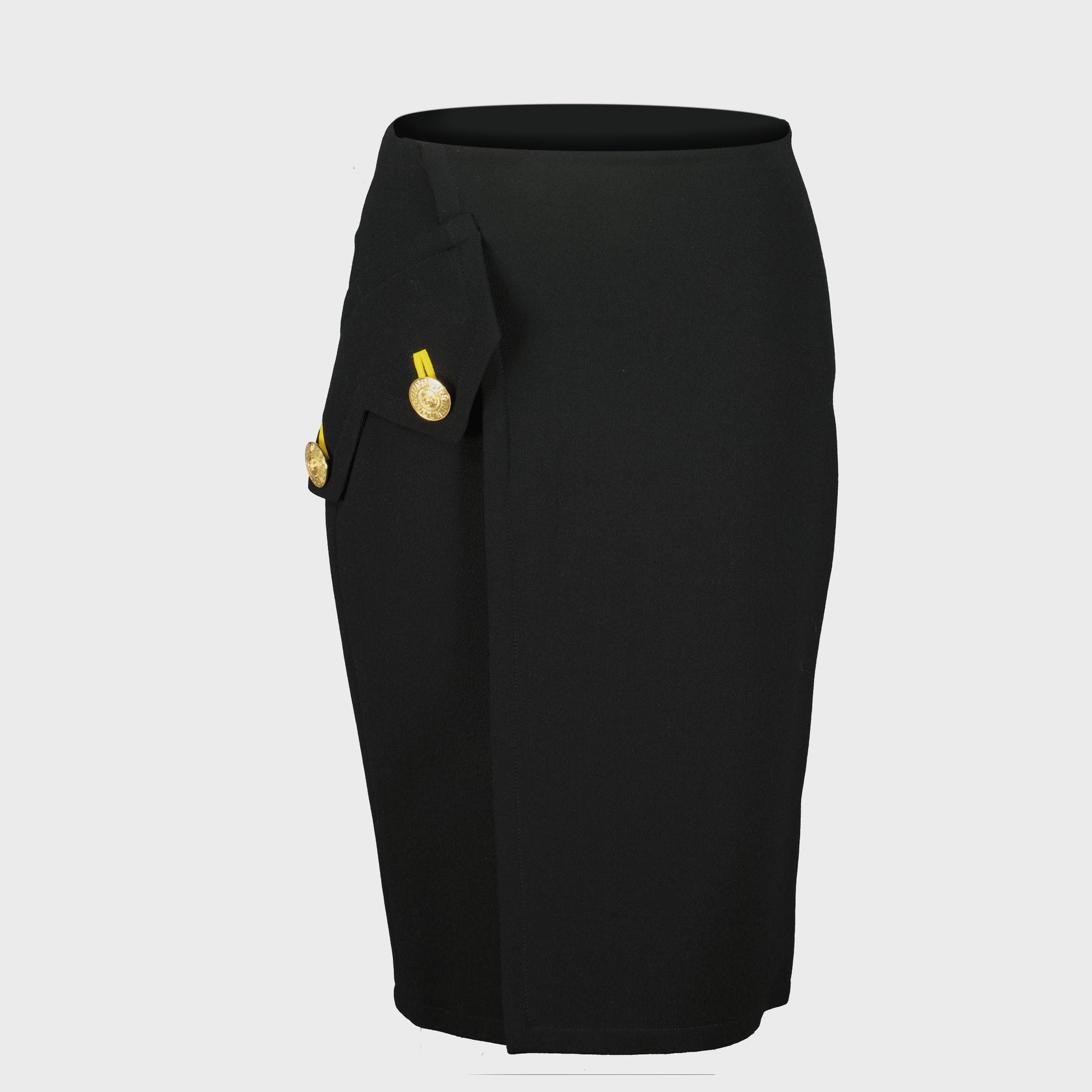 Jupe crayon noire en laine, fausse-poche à rabat et boutons bijoux. Fermeture zippée sur le coté.